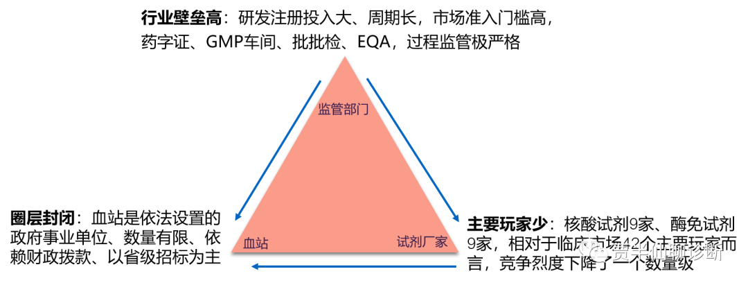 从以上数据可以看出: 1) 竞争格局呈现强者恒强的局面,罗氏稳坐C位,而且客户数量呈增长趋势,是当之无愧的血站霸主 2) 第二名、第三名竞争激烈,浩源取代盖立复成为老二,用户数量上有追赶罗氏之势,华益美则彻底反超科华,做到了老三的位置 3) 盖立复则掉队严重,但瘦死的骆驼比马大,还是能力压科华一头 4) 达安则触底反弹,走出了V字型的曲线,经历疫情洗礼后恢复原状,而万泰可能已经不再 5) 值得注意的是分子诊断领域的新贵——圣湘已有一定数量的终端血站用户,虽然相比研发、注册投入的巨额成本,只有个位数的终端客户着实有些尴尬,但想比同期进场的选手丽珠就不知道好到哪里去了 1.4 血站市场3大特点
