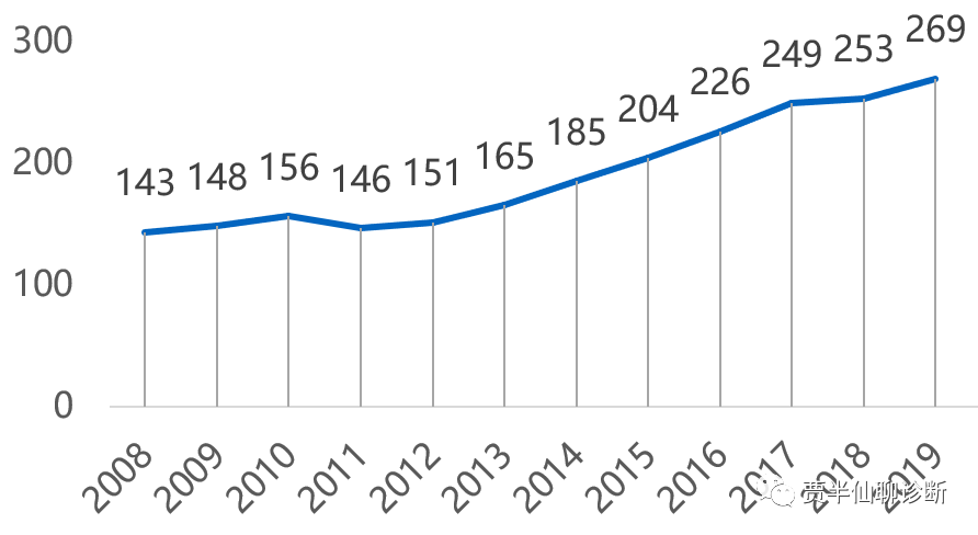 2018-2020年国内主要血制品企业采浆量(吨) 我国目前采浆站约270家,正式开始采浆的有255家,其中天坛生物的浆站数量遥遥领先,其次为上海莱士和华兰生物等。 2008-2019中国单采血浆站数量 2018-2020年国内主要血制品企业在营浆站数量 2.2 市场规模