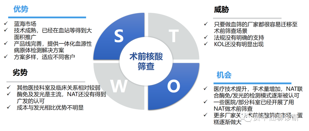 目前临床上怎么开展EQA尚没有引起重视,也没有官方的声音出现。血站每年组织2次血液筛查核酸检测EQA活动,未来不外乎有三种思路: ① 临床医院的血源性筛查纳入血站EQA,但涉及到国家临检中心不同科室监管职责的问题 ② 在血站EQA的基础上予以简化调整 ③ 按照临床筛查阳性后需要诊断、治疗的需求,在现有的HBV/HCV/HIV单项的基础上开发出一套符合临床特征的EQA计划 四、临床术前核酸筛查的市场分析与产品分析前面做了3期的临床术前核酸筛查分享,今天最后收个尾,作为产品经理对这个产品的市场分析和产品定位,3-5年后再回看今天的分析,希望不被打脸。 01 市场分析
