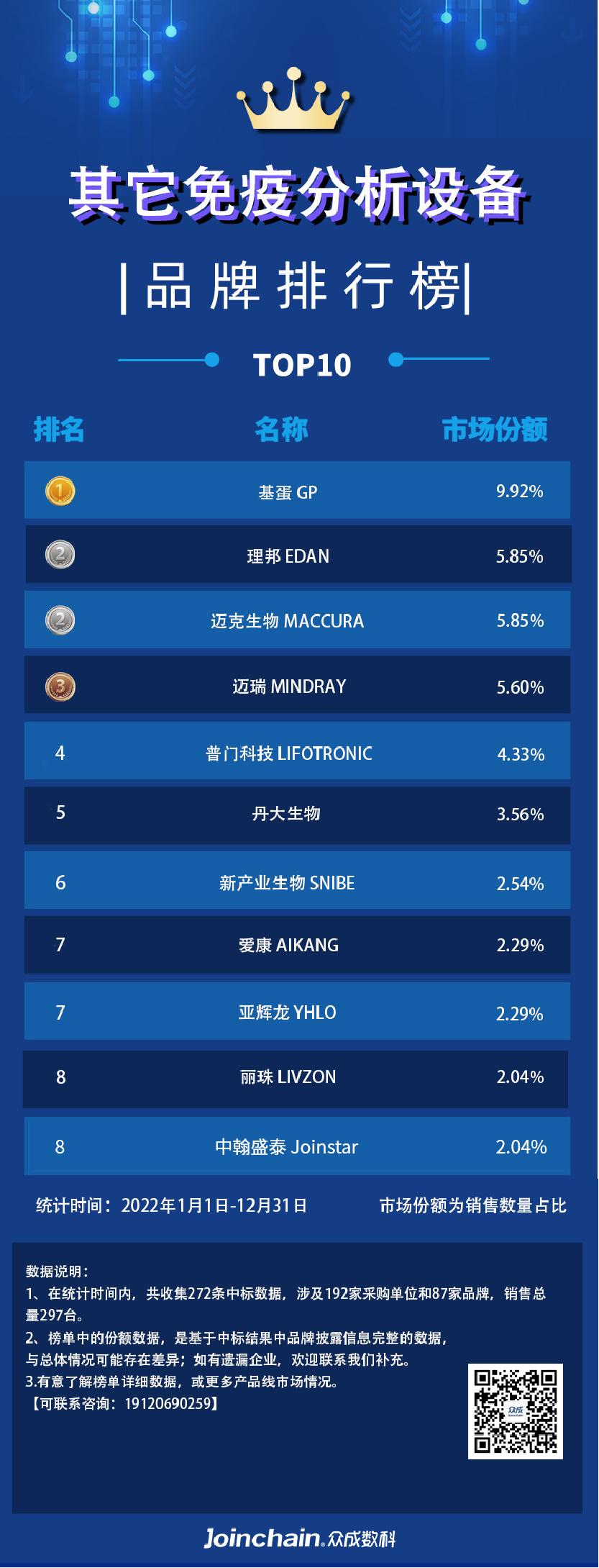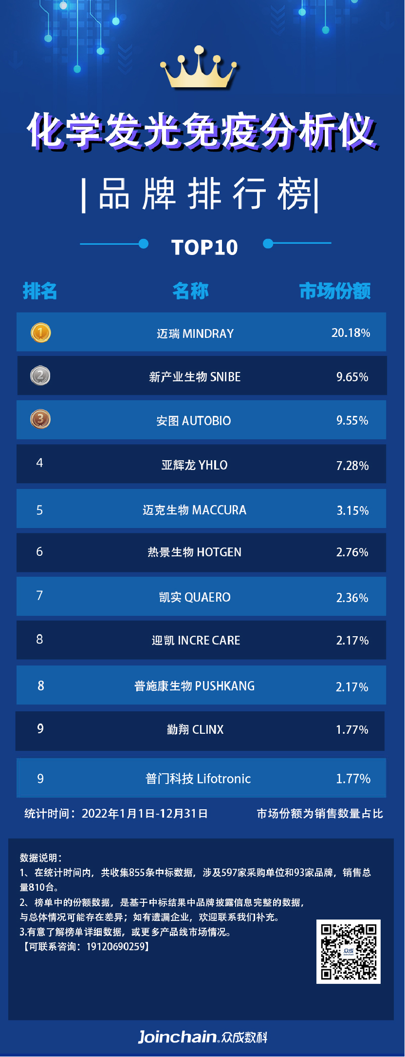 本文统计产品为免疫分析设备,包含细分品种:酶联免疫分析仪、免疫层析分析仪、生化免疫分析仪、免疫散射浊度分析仪、免疫印迹仪、免疫分析一体机、化学发光免疫分析仪、荧光免疫分析仪、酶免分析仪、其它免疫分析设备。