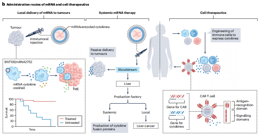 免疫细胞是细胞因子的主要来源,在感染、炎症或内源性刺激下分泌。细胞因子与靶细胞上的受体结合后诱导细胞内信号,促进特定的生物学过程,具体取决于细胞因子和细胞类型,包括激活调节表观遗传修饰、细胞因子合成和增强代谢的酶,以及触发细胞增殖或凋亡。细胞因子的一个决定性特征是它们诱导不同表型特征的能力,导至各种生物学后果。由于细胞因子在许多免疫介导的疾病中起着关键作用,因此已将其作为治疗靶点进行了研究,如自身免疫和炎症性疾病。然而,开发基于细胞因子的疗法仍然具有挑战性。细胞因子的半衰期短、多效性和不利的组织分布都导至其治疗范围狭窄。 近日,一组来自世界各地的研究团队在杂志Nature reviews bioengineering上发表了一篇题为“Engineering cytokine therapeutics”的综述文章。研究团队首先讨论如何利用生物分析技术的进步来加深对细胞因子生物学的理解。然后描述了与细胞因子治疗相关的蛋白质工程、纳米医学、RNA技术和细胞工程方面的创新。研究团队表明,生物工程人员可以利用相关知识,为各种免疫介导疾病开发安全、有效的基于细胞因子的疗法。 图片来源:Nature reviews bioengineering 一 使用蛋白质工程工具设计重组细胞因子疗法 1. 定向进化 可以采用两种策略来开发蛋白质突变体;定向进化和蛋白质理性设计。在定向进化中,随机突变被引入感兴趣的基因中,随后使用多种选择方法,例如酵母和噬菌体展示,以获得具有所需功能的蛋白质。与理性设计相反,定向进化不依赖详细的结构知识和蛋白质3D结构预测,因为它基于突变体的功能选择。因此,定向进化是工程蛋白的一种流行且成功的策略。 2. 理性设计 已开发出合理重新设计细胞因子的方法,而不是使用定向进化。这些技术在很大程度上依赖于细胞因子结构的详细知识和先进的蛋白质模型。例如,IL-22的晶体结构与其受体复合物IL-22Rα/IL-10Rβ结合,使得通过突变四个关键氨基酸残基降低对IL-10Rβ的亲和力成为可能。这种IL-22突变体具有更高的受体和细胞特异性,从而减少了不良的促炎症反应,并保持了其体内再生功能。为了减少多效性,类似的方法设计了治疗有效的细胞因子变体,如IL-10、IFNγ、IL-12和IL-4。 3. 聚乙二醇化 细胞因子的循环半衰期决定了细胞因子疗法的体内效应。用聚乙二醇(PEG)使蛋白质功能化是延长其在循环中持久性的一种有效方法。聚乙二醇化增加了蛋白质的分子量,扩大了流体动力学直径,从而减少了肾脏清除率,并减少了与血浆成分的相互作用,从而降低了免疫原性。聚乙二醇化已成功应用于集落刺激因子和干扰素。 Synthorx设计了一种新的PEG-IL-2变体(THOR-707),THOR-707的PEG部分特异性阻断与IL-2Rα亚基的结合位点,但保持与其他受体亚基的相互作用(图b),改善了效应T细胞和NK细胞的扩增和激活,并在癌症模型中显示出更好的药代动力学和安全性特征。聚乙二醇化细胞因子的一个可能的限制是患者可能产生抗PEG抗体,该抗体可使细胞因子失活或引发炎性免疫反应。 4. 计算方法 借助于计算和数据驱动方法以及硬件和算法能力的最新进展,蛋白质可以从头设计。计算工具有望帮助克服细胞因子药物的关键限制,包括多效性、冗余性、不良药代动力学和毒性。可以采用从头蛋白质设计来创建合成细胞因子(合成蛋白),例如IL-2Rβ/IL-10Rβ、IL-2Rβ/IL-4Rα或IL-4Rβ/IFNαR2,从而激活不同的信号通路。从头设计方法还提供了一种有效分离细胞因子多效性和靶向特异性途径的策略。从头设计的蛋白质本质上是外来的,因此可能存在免疫原性问题,这是新细胞因子临床转化的重要考虑因素。 重组细胞因子。 图片来源:Nature reviews bioengineering 二 靶向和递送 1. 融合蛋白修饰细胞因子 在基因层面上融合一种细胞因子与其他蛋白质可以帮助重塑细胞因子的生物分布特征。该方法可用于将细胞因子靶向特定位点或细胞类型。细胞因子融合物有助于促进肿瘤定位,克服细胞因子药物不良的药代动力学财产和不利的生物分布特征。 免疫细胞因子:过去15年 多年来,已设计出具有IL-2的多抗体-细胞因子融合构建物,称为免疫细胞因子,并正在进行治疗各种类型癌症的临床试验。将IL-12基因融合到肿瘤靶向抗体可以增加这种细胞因子的治疗窗口并限制毒性,如将IL-12融合到L19抗体(抗Fibronectin,在许多癌症中过量表达在血管上)。大多数免疫细胞因子的目的是向肿瘤输送促炎细胞因子,但也可以将抗炎细胞因子导向炎症组织。IL-22免疫细胞因子靶向肠道黏膜以治疗溃疡性结肠炎。 免疫细胞因子与非靶细胞的相互作用会引起副作用。为了提高受体和细胞特异性,新的工程疗法将免疫细胞因子方法与重组细胞因子突变体相结合。比如Orionis Biosciences正在开发一种AcTakines,它结合了靶向抗体和受体亲和力降低的细胞因子突变体。AcTakines的亲和力降低会阻碍细胞因子活性,直到融合蛋白在靶细胞上的细胞因子受体附近聚集,从而降低脱靶效应。 肿瘤定位:胶原蛋白是TME(肿瘤微环境)的主要成分,因此是细胞因子肿瘤定位的有趣靶点。有研究团队将胶原结合蛋白与IL-2或IL-12融合,在肿瘤内给药时将这些细胞因子锚定在TME中的胶原上(下图a)。 前药策略:克服脱靶效应的一种方法是设计前药结构,通过与细胞因子连接的肽或蛋白质使其失去活性。例如,失活单元可以被疾病部位过表达的蛋白酶