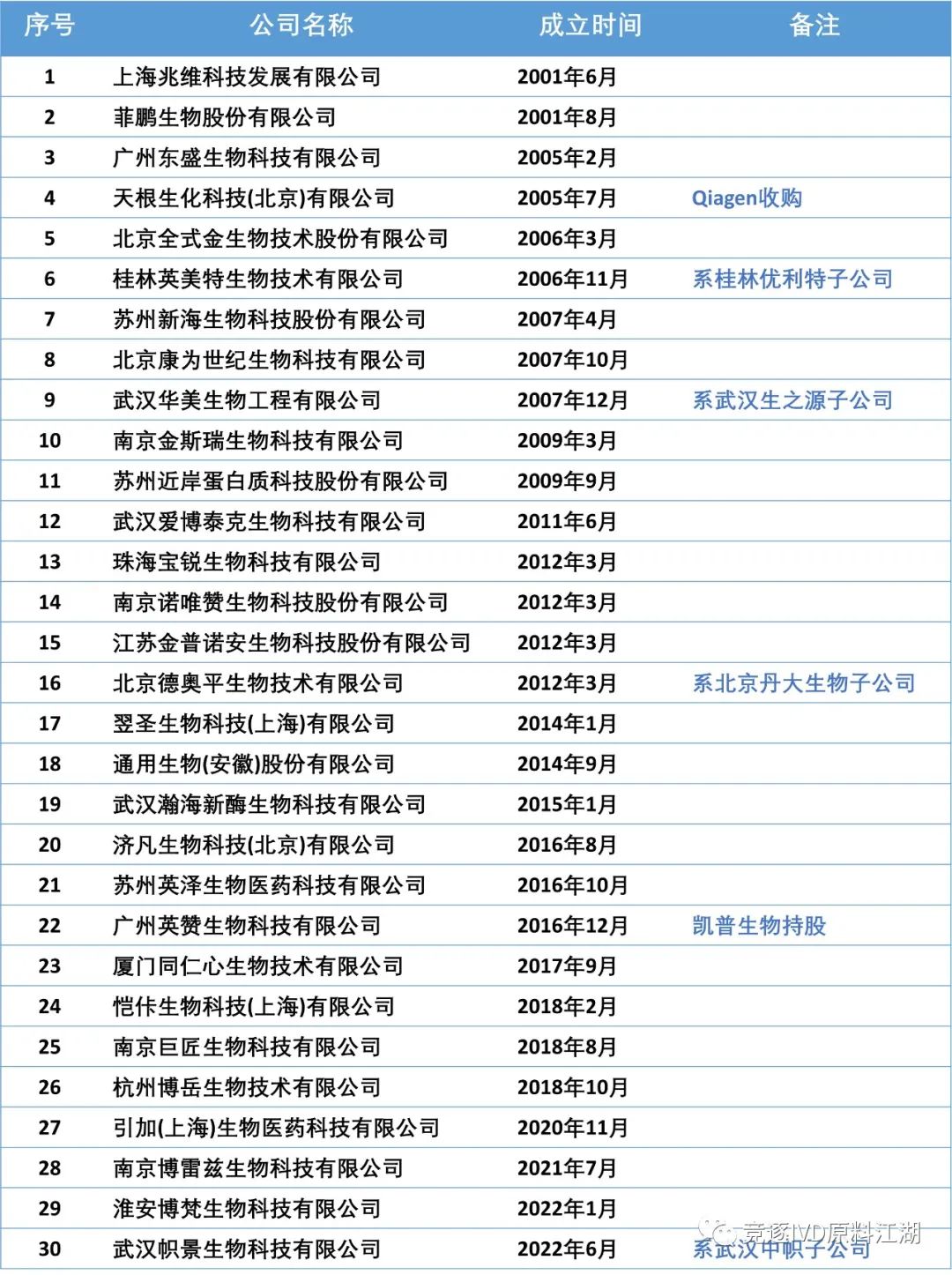 国产分子酶生产厂家统计如上,按成立时间先后排序。限于个人水平,统计名单必定有所遗漏,因此说国产分子诊断酶供应商超过30家,是没有问题的。另外绝大部分(近90%)的厂家成立于2020年之前,因此本文开头的说法不太准确,应该说是新冠疫情发生后,相当多国产分子酶厂家快速抢占市场,进入到IVD原料市场的舞台中央,形成与进口品牌分庭抗礼甚至东风压倒西风的格局。