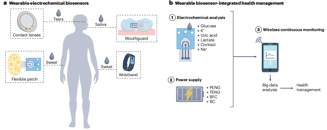 自1962年Leland-Clark Jr引入用于葡萄糖电流型传感器以来,生物传感器已被广泛应用于临床、工业、环境和农业分析。尽管已经开发了各种生物传感器来灵敏和选择性地检测一系列与疾病相关的分子,但由于难以将生物传感器集成到便携式设备中并使其小型化,生物传感器的临床转化仍然有限。 在不同的生物传感平台中,电化学生物传感器特别适合于设备集成,因为易小型化、批量制造,电流和电势等电化学信号可以通过简单、便携、低成本的低功耗外围仪器进行采集。科学技术的进步引领了电化学生物传感器在可穿戴和植入式设备中的集成,来实现对生理分子的微创或无创连续测量。电化学生物传感器可以集成到柔性薄膜、纺织品、眼镜、牙齿和尿布中,来实现对不同生物流体(例如脑脊液、间质液、汗液、唾液、眼泪和尿液)中分子的长期检测。 近日,来自南京大学、东南大学、南京邮电大学的研究团队在杂志Nature reviews bioengineering上发表了一篇题为“Device integration of electrochemical biosensors”的综述。在这篇综述中,研究团队讨论了用于个性化POC诊断设备的电化学生物传感的关键创新。讨论了用于疾病诊断、健康管理、细胞监测和神经科学的电流型、电位型、有机电化学晶体管(OECT)、光电化学和电化学发光生物传感器的设计和集成,以及未来需要努力的方向。 图片来源:Nature reviews bioengineering 一、电化学传感概述 电化学生物传感器是独立的分析设备,其中生物识别元件与电化学转导元件直接接触,以允许对分析物进行灵敏和特异的检测。根据设计和传感器类型,可以在不同体液(包括血液、唾液和眼泪)中快速分析与健康相关和疾病相关的生物标志物(如下图a),如碳水化合物、蛋白质、核酸和细胞。电化学生物传感器,包括电流法、伏安法、电位法、有机电化学晶体管、光电化学和电化学发光传感器,可以集成到可穿戴、便携式和植入式设备中,以实现护理点诊断和健康监测。 电流型生物传感器:电流型生物传感器是检测代谢物(例如葡萄糖、乳酸和尿酸)最常用的传感器。靶特异性酶(例如,葡萄糖氧化酶(GOx)、或乳酸氧化酶)固定在工作电极上,以恒定电位催化靶的氧化(如下图b)。电流型生物传感器制造简单,在目标检测中具有高灵敏度和高选择性,适用于可穿戴应用。纳米材料也可以添加到生物传感界面促进电子转移,从而提高灵敏度并降低检测极限。例如,Au-Pt双金属纳米催化剂与纳米多孔水凝胶相结合,能够以180 μA cm–2 mmol–1的灵敏度,0.01 mg dl−1(0.56 μM)的检测限,使生物传感器与用于泪液葡萄糖测量的智能隐形眼镜集成。 伏安法生物传感器:疾病生物标志物,如蛋白质和核酸,是通过亲和识别来检测的,不能在生物传感表面直接产生电子转移。大多数亲和传感器都是伏安生物传感器,操作繁琐(下图b)。一步亲和传感器提供了一种更简单的方案,靶标的检测依赖于结合诱导的探针DNA刚性的变化,导至氧化还原标签靠近或远离电极表面,导至靶标生物传感的电流信号相应增加或减少。该信号可以使用DNA杂交策略进行扩增以提高敏感性;发夹DNA探针可以进一步提高这种DNA传感器的灵敏度。 基于邻近结合的亲和电化学生物传感器适用于蛋白质生物标志物检测。在这种生物传感器中,一对抗体-DNA亲和探针双重识别靶蛋白,启动DNA组装,导至电极表面上的电活性分子标记的探针DNA处于“开”或“关”状态。此类传感器的灵敏度可以通过DNA扩增策略进一步提高降至皮克每毫升或亚皮摩尔水平。 电化学生物传感器。 图片来源:Nature reviews bioengineering 电位生物传感器:电位生物传感器通过测量与传感电极上的目标识别时表面电荷变化相关的电位信号,可以直接检测目标(下图c)。固体和液体膜电极可以集成到临床分析仪中,用于检测血液电解质(例如,Na+、K+、Ca2+、H+和Cl-)。酶、核酸和蛋白质可以通过将目标生物识别事件与离子反应相结合来检测。固体接触离子选择电极受益于坚固性和易于制造、修饰和小型化,允许通过检测从纳米粒子标记的探针释放的离子来进行蛋白质和核酸分析。所有固态离子选择电极也可以集成到可穿戴设备中,用于生物流体中的离子检测;例如,在柔性传感阵列上具有Na+和K+离子选择电极的可穿戴“智能腕带”能够对汗液中的Na+和K+进行原位分析。 有机电化学晶体管生物传感器:OECT生物传感器(下图d)与靶标的特定反应影响界面电位,从而产生用于靶标定量的通道电流响应。OECT生物传感器具有高灵敏度、低成本、灵活性、易于制造和低工作电压 ,允许通过静电相互作用或亲和力结合来检测电活性(例如多巴胺、葡萄糖和肾上腺素)和无电活性(例如皮质醇、DNA、蛋白质、细菌、细胞和聚糖)分子或生物大分子。 OECT生物传感器可以很容易地小型化、集成到设备中并设计成阵列。OECT生物传感器的灵活性和稳健性使其适用于可穿戴设备中生物分子的非侵入性检测。例如,织物OECT生物传感器可以嵌入尿布中,以监测人工尿液中的葡萄糖,通过蓝牙在手机上收集传感信号。 光电化学生物传感器:光电化学生物传感系统基于在生物传感器表面识别目标时光电流的变化,这由于电子供体和受体之间的光电化学反应而引起电荷或能量转移。光电化学生物传感器结合了光学和电化学分析的优势,特别是用于检测疾病相关分子,如谷胱甘肽、乳酸、DNA、miR