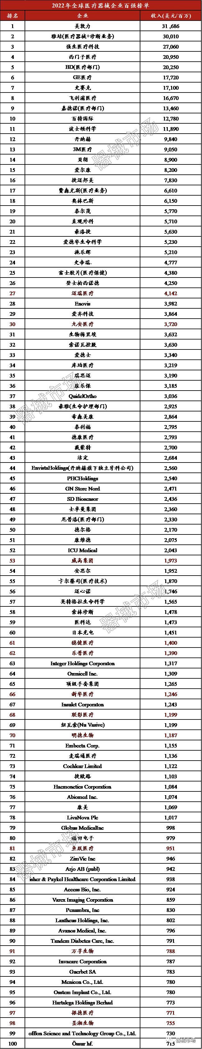 在医疗器械公司TOP100榜单中,共有12家中国企业上榜