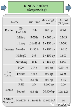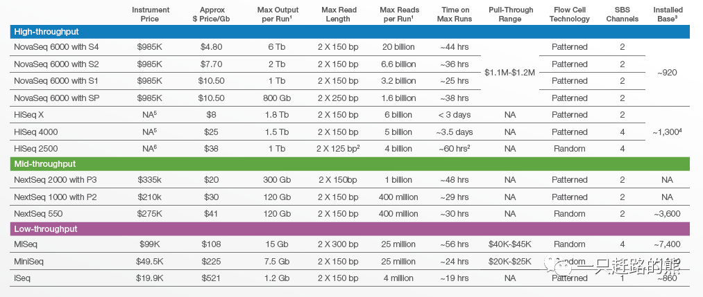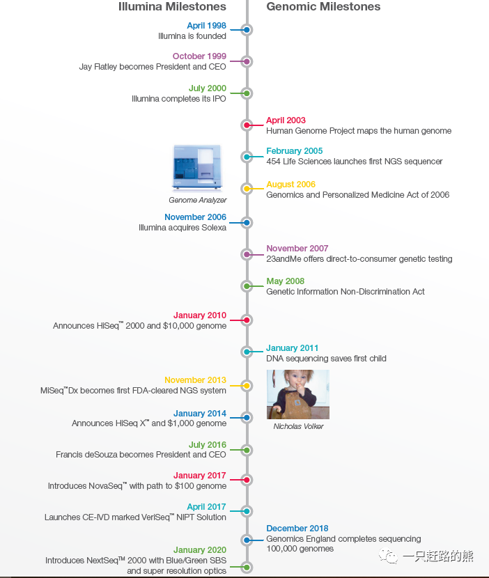 Chapter One 开宗明义 /// 长读长测序及其原理 测序技术发展多代,本质是对四种碱基通过不同类型的信号进行检测。一代测序Sanger法读取的是荧光信号;二代NGS测序中,illumina平台读取的是荧光信号,Ion Torrent测量的是pH值的变化。三代长读长测序的典型平台包括了Pacbio和ONT,Pacbio仍是读取荧光信号,而ONT则是通过电信号判断碱基类型。 长读长测序,顾名思义对应二代NGS技术的短读长测序。与短读长打碎再进行拼凑不同,检测长读长片段对整个待测样本的还原更为简易直观。此外,三代长读长测序无需进行PCR扩增,既节约时间,也可避免扩增带来的偏差。 虽同为长读长技术,Pacbio和ONT技术路线还是存在较大差别。故在代际分类时,也有人将先推出的Pacbio路线称为三代测序,将ONT的纳米孔测序路线称为四代测序。 Pacbio技术路线 测序原理 Pacbio采用的测序方式是边合成边测序,其测序芯片SMRT Cell的技术核心为零模波导孔(zero-mode waveguides, ZMWs),每个ZMW都能够包含一个DNA聚合酶及一条DNA样品链进行单分子测序,并实时检测插入碱基的荧光信号。 ZMW是在硅基材上覆盖的铝箔上加工的直径约100 nm、高度约70nm的圆柱形孔,其直径远小于检测激光的波长(>600nm),因此下方激光只能照亮ZMW底部约2-30nm而不能穿透小孔进入上方溶液区——只有进入这个范围的荧光染料才会被激发,避免了背景干扰。 测序流程 Pacbio的测序流程如下图所示,需要经历DNA打断、建库和测序几个关键环节。PacBio建库所采用的接头是环状单链,其两端分别与待测DNA双链的正负链相连,可得到一个哑铃型的DNA文库。 图源:安诺优达 制备完成的DNA文库加入测序芯片,通过自由扩散进入ZMW(底部锚定了DNA聚合酶)中,被聚合酶捕获,从而将DNA序列锚定在零模波导孔底部。ZMW中同时包含四种被不同荧光基团修饰的dNTP,当DNA与聚合酶形成的复合物被ZMW捕获后,4种不同荧光标记的dNTP通过布朗运动随机进入检测区域并与聚合酶结合,与模板匹配的碱基生成化学键的时间远远长于其他游离态碱基停留的时间,因而可通过荧光信息存在时间的长短区分匹配的碱基与游离碱基,进而通过统计4种荧光信息与时间的关系图对DNA模板序列进行测序。 测序效果 Pacbio现阶段有CLR和HiFi两种测序模式,其中CLR为超长测序模式(插入片段30kb以上),产生的数据是基于单循环测序的结果,一次插入片段只测序一次,准确度和PacBio常规测序保持一致,在85%左右。 Pacbio哑铃文库可以打开变成圆环型,在测序的过程中周而复始进行多次测序,减少随机误差,提高准确率。这种模式被称为HiFi模式,通常片段在10kb-20kb,多次测序后的准确率可以达到Q30级别,即99.9%,相应地,其成本会有所上升。 ONT技术路线 测序原理 与Pacbio相比,ONT的测序方式更为简洁。纳米孔测序将孔蛋白嵌在绝缘的人工膜上,通过记录DNA或RNA链过孔时产生的电流信号对碱基序列进行检测。其技术核心为通道孔蛋白,其中心由一至二个缩窄区形成数纳米的孔道(限制区),仅可容许单链DNA分子穿过。碱基穿过通道时会引起通道电学性质的变化,4种不同碱基理化性质的差异会导至其穿过纳米孔时引起的电学参数变化不同,检测这些变化可得到相应碱基的类型,进而实现测序。 测序流程 纳米孔测序的流程同样包括了DNA片段化、建库和测序几个环节。其建库要点是给待测DNA两端加上接头,接头具有Barcode和解螺旋(马达蛋白)的作用。建库好的DNA样本在马达蛋白的牵引下结合到孔蛋白上,将双链DNA解开成单链后,DNA单链在电场力作用下通过孔道蛋白。DNA分子停留在孔道时,离子通过会带来电流变化,不同的碱基带来的电流变化不同。基于电流变化的频谱,通过识别算法可得到碱基序列。 测序效果 多年来,ONT对测序化学进行不断改进,其flowcell已经有了多个版本的升级,目前最新的kit达到了单链Q20的准确率,通过duplex双链过孔的方法可实现接近Q30级别的准确度。 总体上,Pacbio与ONT的两条技术路线各有优缺。Pacbio准确率高,但读长相对较短、成本较高;纳米孔测序读长更长、更为便捷,但准确性略显不足。与二代测序相比,目前Pacbio和ONT的测序成本均较高。 Chapter Two 珠玉在前 /// illumina的发展史 illumina成立于1998年4月,于2000年上市。上市初的illumina只有105个员工,盈利似乎遥遥无期。经过20多年的发展,如今的illumina已经拥有超过1万名员工,成长为名副其实的行业巨头。 发展历程 研究illumina的发展历程,illumina的发展转折点主要发生在2006-2008年间。在本世纪初,illumina还是一家聚焦在基因芯片领域的企业,直到2006年才实现第一次盈利。同年,illumina做出了其发展路上的关键选择——收购Solexa,正式涉足基因测序领域。 随后几年,illumina利用Solexa的SBS技术已经对数量庞大的微生物、植物、动物和人类基因组进行了测序。新一代测序(NGS)数据产出增加的速度超过了摩尔定律——每年增长一倍以上,基因组测序的成本也从1千万美元迅速降到了1千美元。 现如今,illumina就像是测序领域的Windows系统,是机构眼中不会出错的选择。截止2022年,全球90%以上的测序数据由Illumina的仪器产出,illumina的年收入已经突破45亿美元,俨然是测序行业的绝对标杆。 发展特色 illumina是一家具备鲜明特点的公司,其发展路径被诸多Biotech企业津津乐道。概括illumina的发展历程,不难发现:技术、产品与商业模式相辅相成才能成就一家伟大的公司。 技术 illumina无