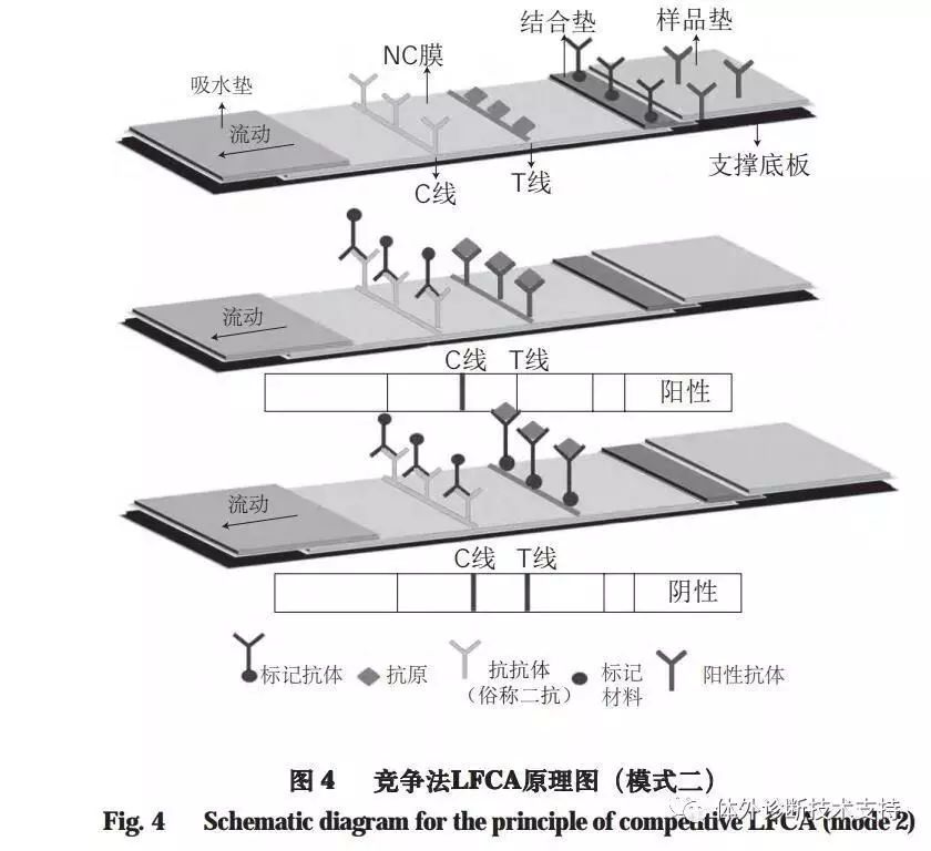 竞争法分两种模式,一种用于检测抗原,另一种是当抗原材料中的干扰物质不易除去或不易得到足够的纯化抗原时,用来检测特异性抗体。以胶体金标记为例,在第一种检测抗原的模式中,用胶体金标记一定量的靶标抗原并固定在结合垫上,T线与C线分别喷涂与靶标抗原特异性结合的抗体(一抗)以及抗种属特异性IgG的“抗抗体”:对于阴性样品,金标抗原随样品侧向流动,在T线处与一抗结合,在C线处与二抗结合,结果T线和C线均显现红色;对于阳性样品,样品中未被标记的靶标抗原和结合垫上金标的靶标抗原通过竞争与T线处的一抗结合,样品中的靶标抗原越多,结合在T线上的金标抗原越少,显色也就越浅,而过量的金标抗原与C线处的二抗结合,故只有C线显现红色(图3)。 在第二种检测抗体的模式中,将抗体用胶体金标记在结合垫上,T线和C线分别包含抗原与载体分子(通常为牛血清白蛋白(bovine serum albumin,BSA))的结合物以及抗种属特异性IgG的“抗抗体”。样品中的靶标抗体和结合垫上的金标抗体共同竞争T线上的抗原与载体分子的结合物:对于阴性样品,结合垫上的金标抗体分别与T线和C线上的固定物反应结合,使T线和C线均显现红色;对于阳性样品,样品中的靶标抗体会优先和T线上的抗原与载体分子的结合物特异性结合,样品中的靶标抗体越多,结合在T线上的金标抗体就越少,显色也越浅,而过量的金标抗体与C线处的二抗结合,故只有在C线处显现红色(图4)。