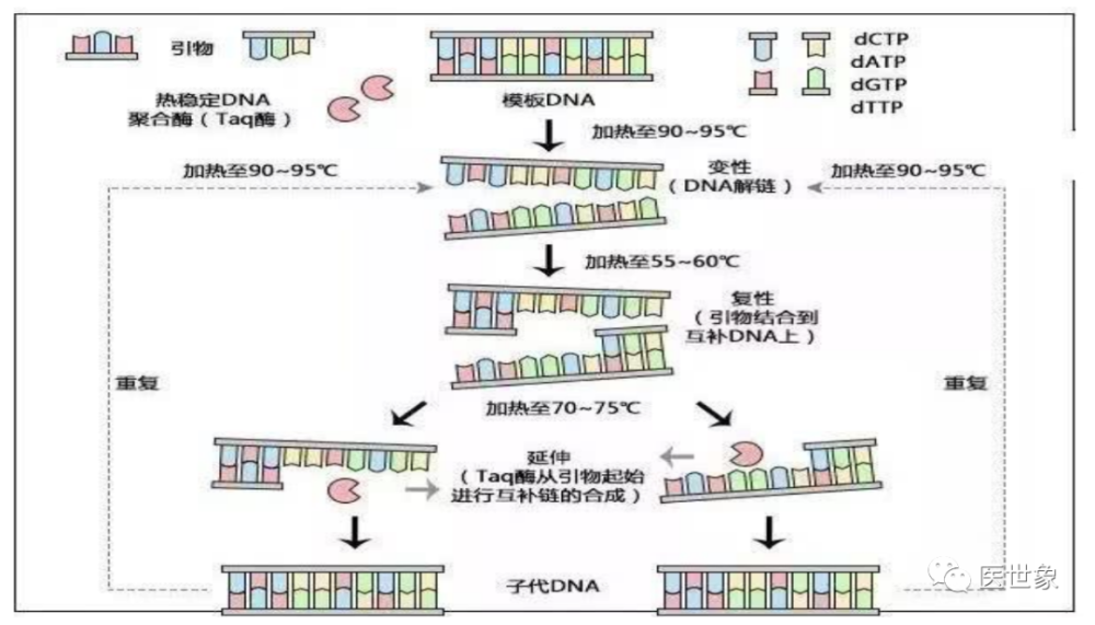 伴随诊断需要通过对样本进行基因测序等分析手段进行药物受体作用位点的确定,目前常用样本类型为组织以及体液。 对组织进行分子分析的技术称为组织活检,具体是指应诊断、治疗的需要,从患者体内切取、钳取或穿刺取出病变组织,对其进行分子分析。 对肿瘤伴随诊断来说,肿瘤组织活检是获取肿瘤 DNA 的金标准。对液体进行分析的技术称为液体活检,具体是指通过对患者的体液中的分析物(CTC、cfDNA、ctDNA 等)进行分子分析,以指导患者的个性化治疗及预后。 组织活检与液体活检技术优缺点对比 从临床应用上看,组织活检与液体活检各有优劣。虽然目前基于液体活检的肿瘤伴随诊断近年来处于蓬勃发展之中,但并非意味着其已经能取代组织活检技术,两者合作互补或许能大大提高诊断效率,减少过度治疗。随着液体活检技术不断发展,未来基于液体活检的肿瘤伴随诊断或将进一步替代组织活检技术,成为伴随诊断检测的主力军。 伴随诊断主要基因测序方法 伴随诊断是通过基因测序等手段进行药物受体作用位点的确定,随着靶向药的应用推广,伴随诊断逐步确立起指导治疗的重要地位。在伴随诊断所用检测技术中,PCR、NGS、FISH 是目前市场上应用最广泛的技术,其各有优劣,在各大伴随诊断企业中均有分布。 (一)PCR PCR(聚合酶链式反应)是一种用于放大扩增特定 DNA 片段的分子生物学技术,可以看作是生物体外的特殊 DNA 复制,其最大特点是能将微量的 DNA 大幅增加。在存在DNA模板、引物、dNTPs、适当缓冲液 (Mg2+) 的反应混合物中,在热稳定 DNA 聚合酶的催化下,对一对寡核苷酸引物所界定的核酸片段进行扩增,这种扩增是以模板 DNA与引物之间的变性、退火、延伸三步反应为一个周期,循环进行,使目标 DNA 片段得以扩增。 普通 PCR 原理图 最初的普通 PCR 技术只能通过对靶基因进行扩增,然后采用琼脂糖凝胶电泳对产物进行分析,实现简单的定性分析,这是第一代 PCR。鉴于(1)第一代 PCR 采用的核酸燃料对实验人员及环境造成较大伤害,(2)PCR 完成之后开盖检测易污染造成假阳性结果,(3)检测耗时长且操作麻烦易出错及(4)只能做定性检测,二代 PCR 得以发展并成为目前国内 PCR 技术主流。第二代 PCR 就是荧光定量 PCR 技术(Real-Time PCR),也叫做 qPCR, 是指通过应用荧光染料或荧光标记的特异性探针(如 Taqman Probe),在 PCR 反应体系中加入荧光基团对聚合酶链反应产物进行标记跟踪,实时监控反应过程,结合软件对荧光信号进行分析,实现基因检测的定性和定量分析。qPCR 常用于传染病病原体检测,疾病耐药基因研究,药物疗效考核,遗传疾病诊断。随着反应循环次数的增加,被扩增目的基因片段呈指数增长,通过实时检测对应的随扩增而变化荧光信号强度,求得 Ct 值,利用已知模板浓度的标准品作对照,即可得出待测标本目的基因数。由于 rPCR 定量过程通过 Ct 值间接反映,因此称为第二代 PCR。 实时荧光定量 PCR 原理图 应用荧光染料:SYBR green:在 PCR 反应体系中,加入过量 SYBR 荧光染料,SYBR 荧光染料特异性地掺入 DNA 双链后,发射荧光信号,而不掺入链中的 SYBR 染料分子不会发射任何荧光信号,从而保证荧光信号的增加与 PCR 产物的增加完全同步。 应用特异标记探针:Taqman Probe:PCR 扩增时在加入一对引物的同时加入一个特异性的荧光探针,该探针为一寡核苷酸,两端分别标记一个报告荧光基团和一个淬灭荧光基团。探针完整时,报告基团发射的荧光信号被淬灭基团吸收;PCR 扩增时,Taq酶的 5’-3’外切酶活性将探针酶切降解,使报告荧光基团和淬灭荧光基团分离,从而荧光监测系统可接收到荧光信号,即每扩增一条 DNA 链,就有一个荧光分子形成,实现了荧光信号的累积与 PCR 产物形成完全同步。 荧光染料 VS 荧光探针 随着 PCR 系统的进一步发展已经对检测,一种具备较高灵敏度和特异性的数字PCR 技术开始被广泛应用于肿瘤临床检测和科学研究中。数字PCR(Digitai PCR,dPCR)是一种新兴的核酸检测技术,通过将每个核酸分子分配到一个独立的空间内,避免选择性扩增对扩增结果的干扰,可实现核酸模板绝对定量、稀有突变检测、拷贝数变异、DNA 甲基化、基因重排等检测功能。由于数字 PCR 可以实现直接定量分析,被称为第三代 PCR。 数字 PCR 原理图 通过稀释样品 DNA 到对应的检测孔中,经过 PCR 扩增之后,向每个孔里加入特异性荧光探针与产物杂交,然后直接计数样本中突变型和野生型等位子的数量。dPCR 常用于大量正常细胞群中检测少数含突变的细胞,主要应用于突变分析、等位基因缺失、混杂 DNA 的癌症检测等等。 三代 PCR 的技术优劣 (二)NGS NGS(高通量测序技术)是指通过模板 DNA 分子的化学修饰,将其锚定在纳米孔或微载体芯片,利用碱基互补配对原理,在 DNA 聚合酶链反应或 DNA 连接酶反应过程中,通过采集荧光标记信号或化学反应信号,实现碱基序列的解读,一次性可完成几十万至上百万序列的测定。 NGS 是基于 PCR 和基因芯片发展而来的 DNA 测序技术。一代测序为合成终止测序,而二代测序开创性的引入了可逆终止末端,从而实现边合成边测序。二代测序在 DNA复制过程中通过捕捉新添加的碱基所携带的特殊标记(一般为荧光分子标记)来确定DNA 的序列。 目前高通量测序的主要平台代表有罗氏公司(Roche)的 454 测序仪(Roch GS FLX sequencer),Illumina 公司的 Solexa 基因组分析仪(Illumina Genome Analyzer)和 ABI的