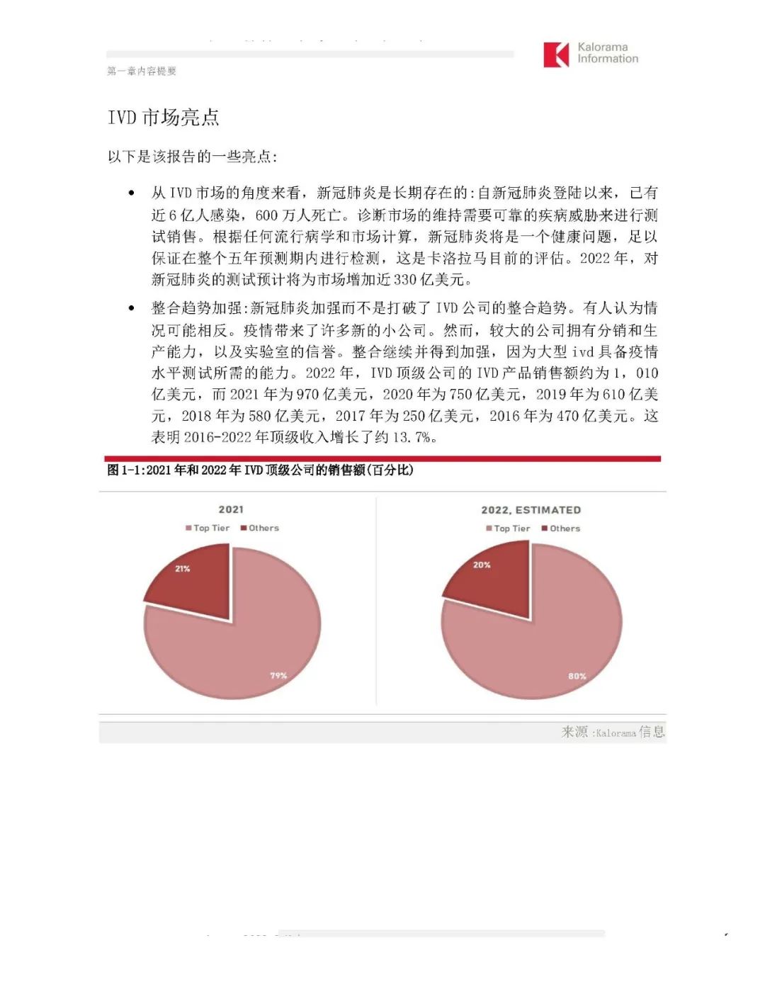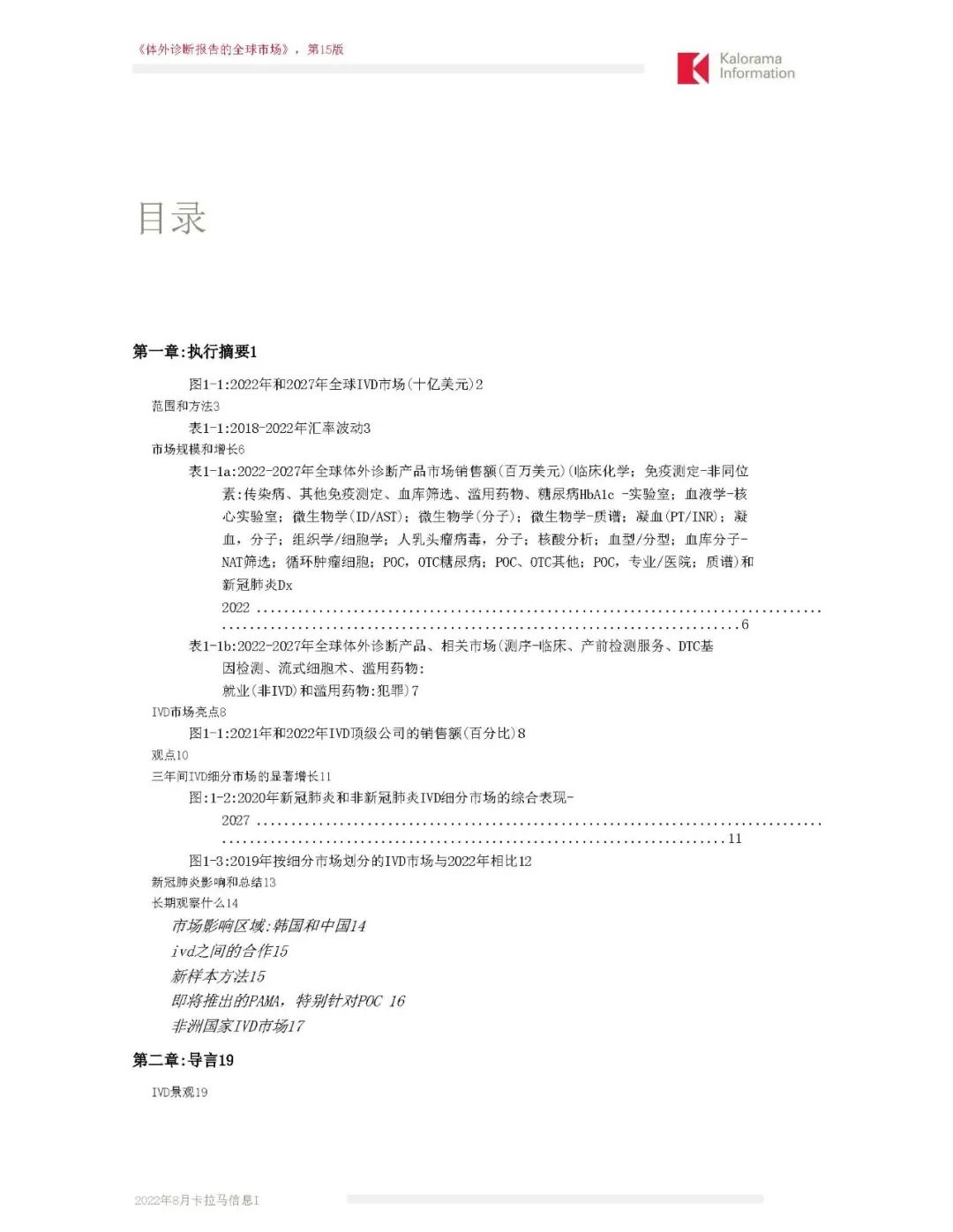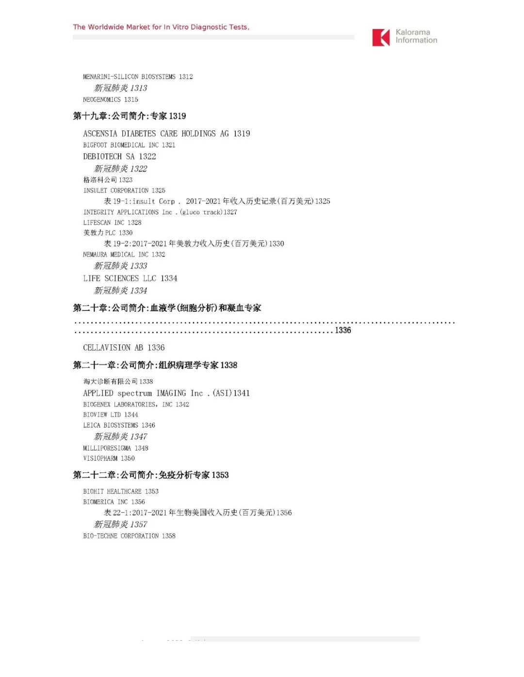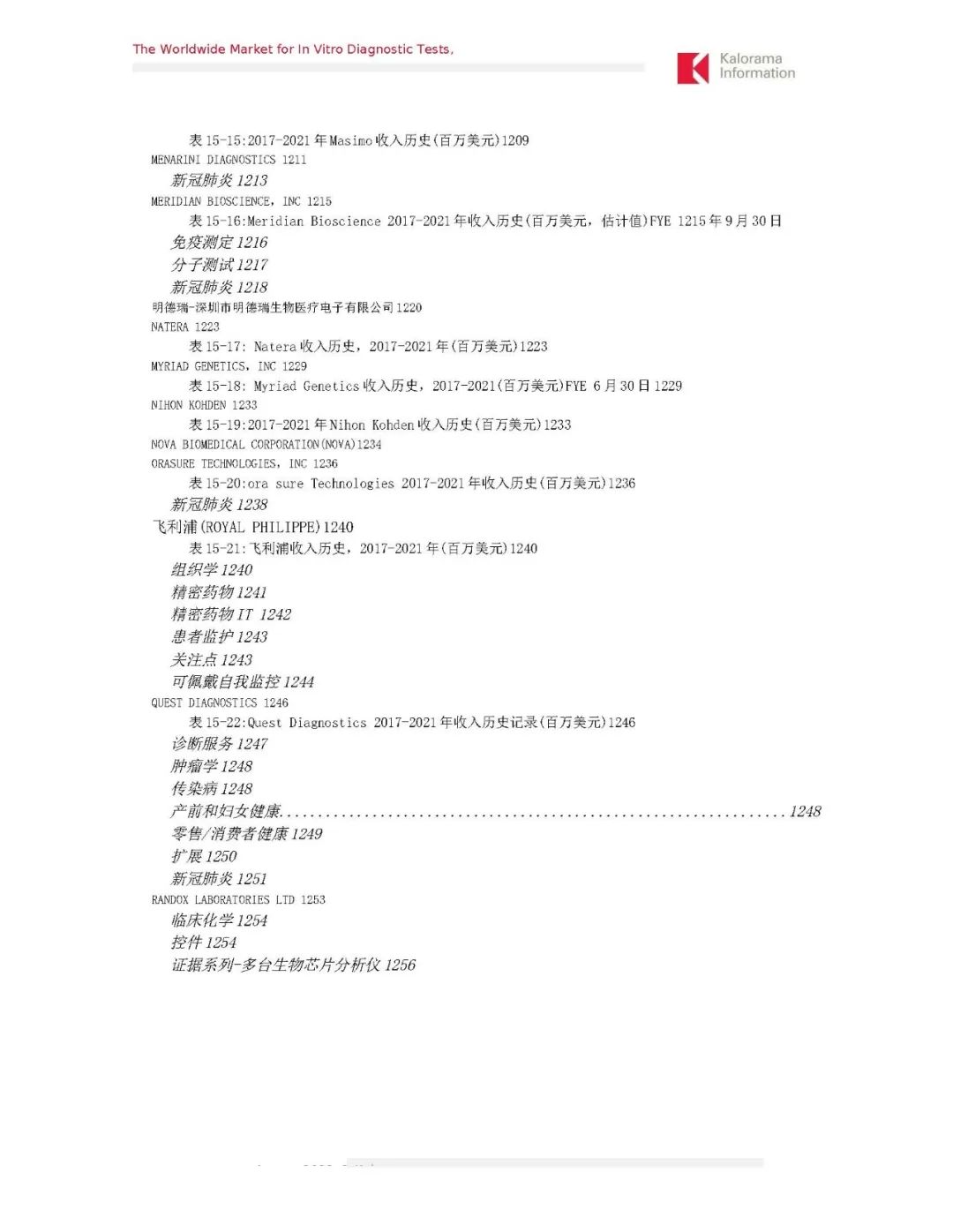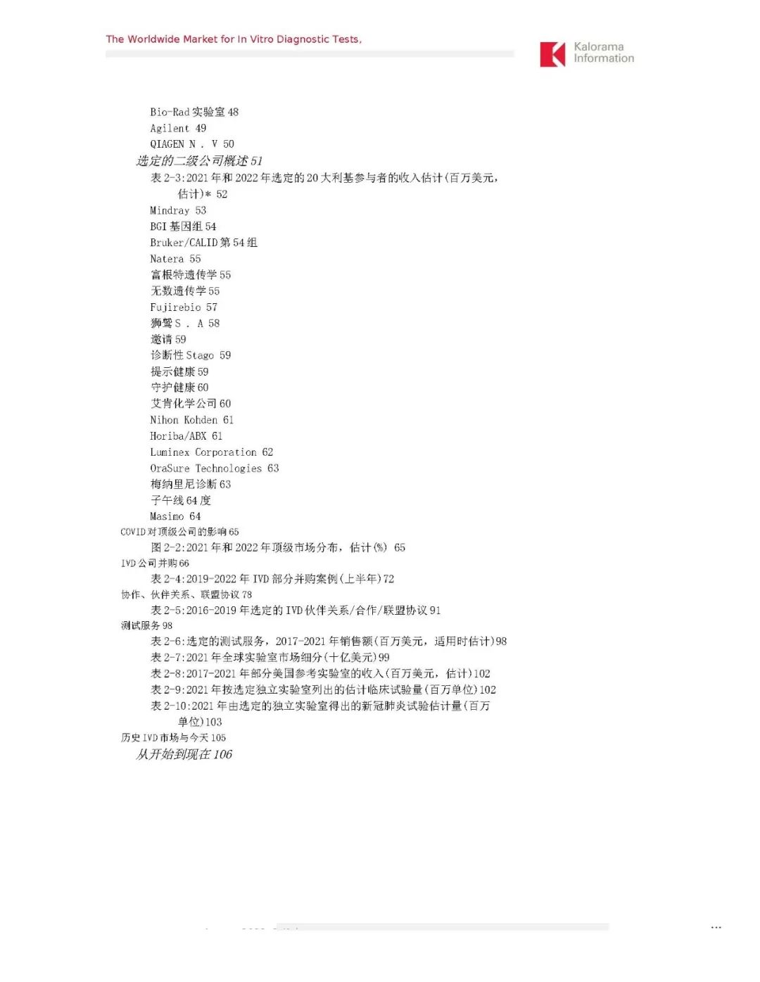 Kalorama Information在《全球IVD市场(第15版)》报告提供全球IVD (体外诊断) 检验市场相关调查,市场概要,各市场区隔/细分区隔的市场规模与预测,及主要各地区/国家的市场的分析与预测,以及各市场区隔的主要企业的简介等。 最近几年,体外诊断显然成为医疗健康产业与资本市场关注的重点,即使放在全球,体外诊断也是个极具潜力的风口行业,在精准医疗的风口之下,体外诊断行业迎来了非常好的发展时期,著名医疗保健市场调查公司Kalorama Information发布的报告《The World wide Market for In Vitro Diagnostic Tests,15th Edition》。 IVD市场亮点 以下是该报告的一些亮点: 从IVD市场的角度来看,新冠肺炎是长期存在的:自新冠肺炎登陆以来,已有近6亿人感染,600万人死亡。诊断市场的维持需要依赖疾病的威胁来进行测试销售。根据任何流行病学和市场计算,新冠肺炎将是一个健康问题,足以保证在整个五年预测期内进行检测,这是卡洛拉马目前的评估。2022年,对新冠肺炎的测试预计将为市场增加近330亿美元。 整合趋势加强:新冠肺炎加强而不是打破了IVD公司的整合趋势。有人认为情况可能相反,疫情带来了许多新的小公司。然而,较大的公司拥有更强的分销和生产能力,以及实验室的信誉。整合继续并得到加强,因为大型ivd具备疫情水平测试所需的能力。2022年,IVD顶级公司的IVD产品销售额约为1,010亿美元,而2021年为970亿美元,2020年为750亿美元,2019年为610亿美元,2018年为580亿美元,2017年为250亿美元,2016年为470亿美元。这表明2016-2022年顶级收入增长了约13.7%。 癌症检测的高增长率:与癌症检测相关的细分市场属于增长更快的收入细分市场:原位杂交、分子癌症标志物、免疫组织化学、人乳头瘤病毒分子检测。 除癌症外,增长明显的细分市场包括:滥用药物免疫测定、心脏标志物、FOB、Hba1c关注点检测和连续血糖将显示出高于市场的增长率。器官移植的遗传测试和分子测试也是市场高度增长的领域。 雅培诊断公司引领IVD市场:这标志着全球体外诊断市场头部公司的领导地位发生了变化。在我们的上一版中,罗氏和雅培并列市场领先地位。现在雅培领先了。原因是什么?雅培在快速诊断的地位源于其对Alere的收购、新冠肺炎疫情以及持续存在的检测市场。血糖检测销售也有所贡献。 这可能是暂时的领导层变动:罗氏的业务在COVID测试和非COVID测试市场都保持了实力和稳定性。罗氏的分子检测业务在与制药公司合作开发伴随检测方面具有未来的潜力。 增长将来自新兴市场销售:新冠肺炎迫使美国暂时扩大在IVD 市场的份额。2022年的形势恢复到2019年的状态,大多数IVD测试类别和美国以外的市场都将寻求增长。越南、土耳其、韩国、阿联酋、沙特阿拉伯、中国和拉丁美洲是主要的新兴市场选择。 质谱继续成为市场的重要组成部分,不仅仅是微生物领域。Kalorama估计,到2027年,质谱市场将达到16亿美元。糖尿病和维生素C是将进入该市场的细分市场之一。AB Sciex引入了HbA1c检测,该公司还提供维生素d的质量规格试剂盒。Newomics Inc .因其Sciex 质量规格系统上的25-OH-维生素D2/D3的IVD-MS试剂盒获得CE认证。脂肪科学正在开发一种用于HgA1c的硅微流控芯片LC-MS。其他测试必然也会随之而来;请继续关注。第7章免疫测定中更详细地讨论了质谱在诊断中的作用! |