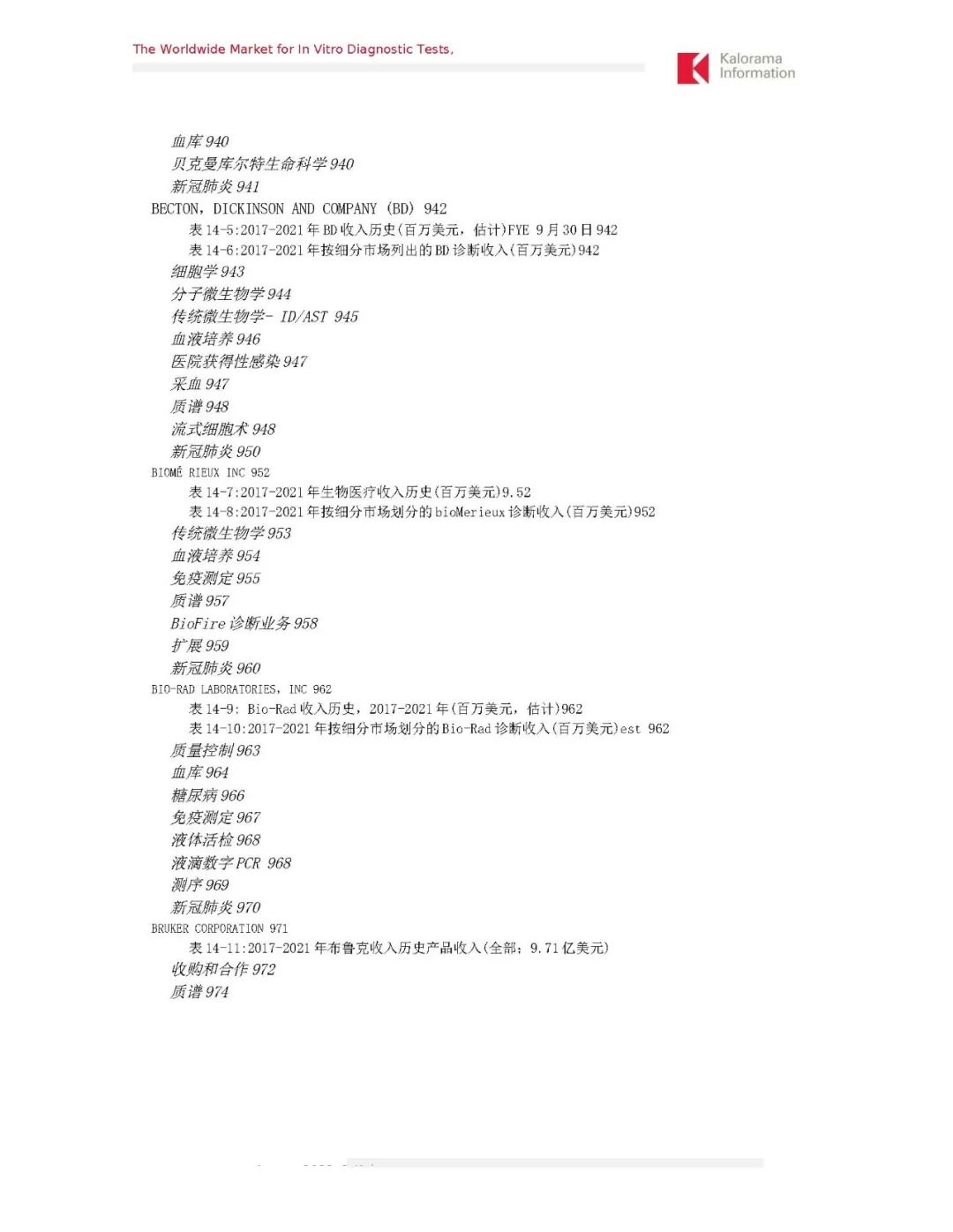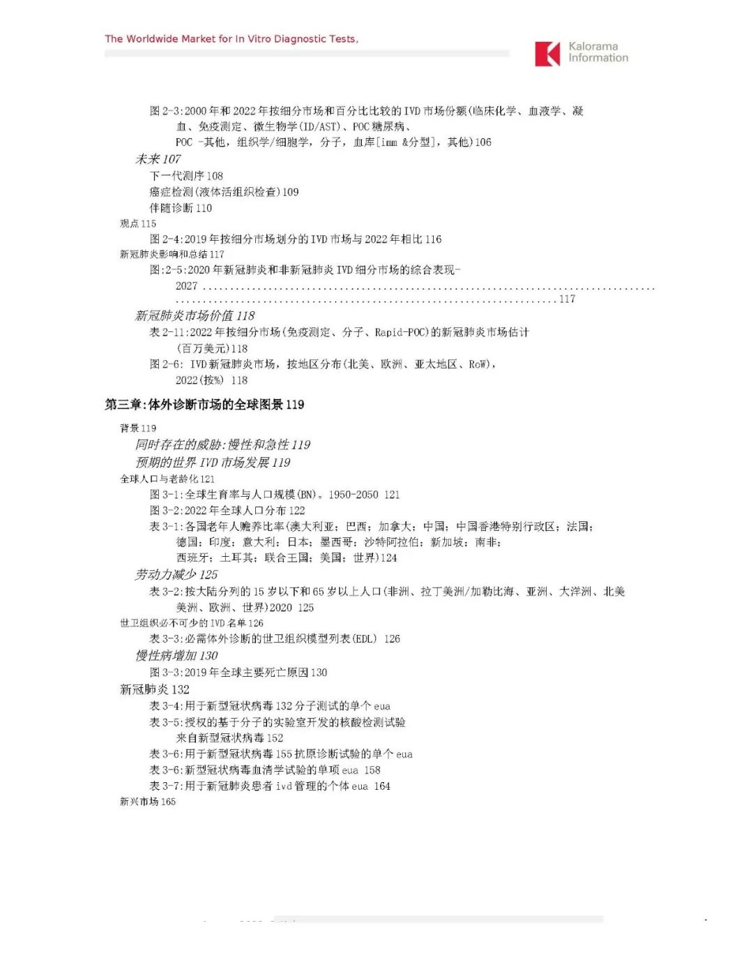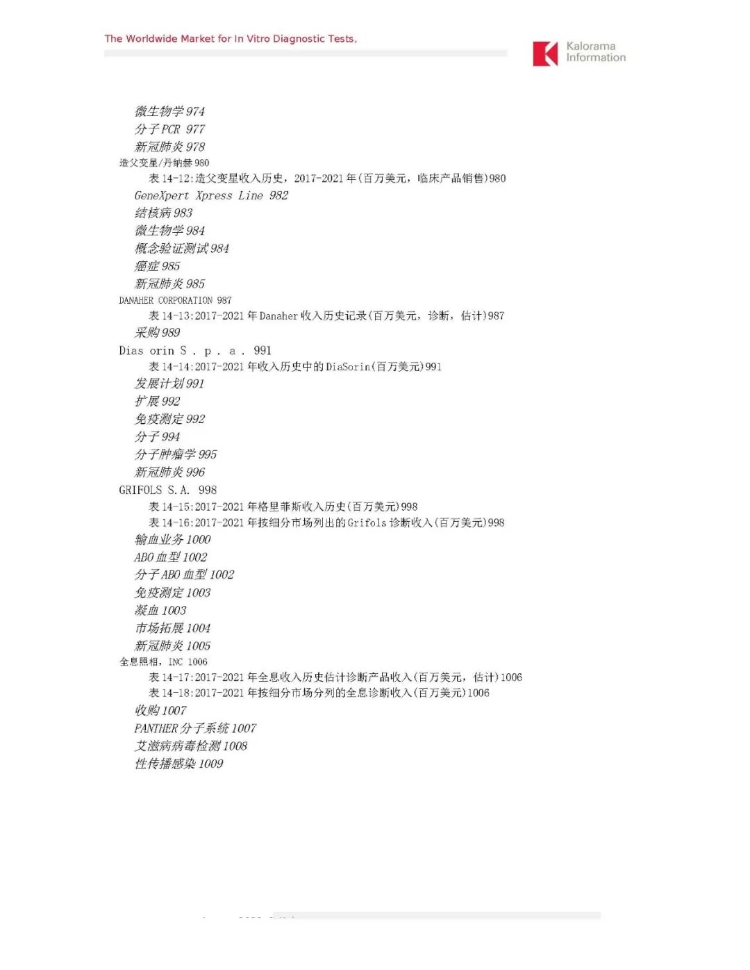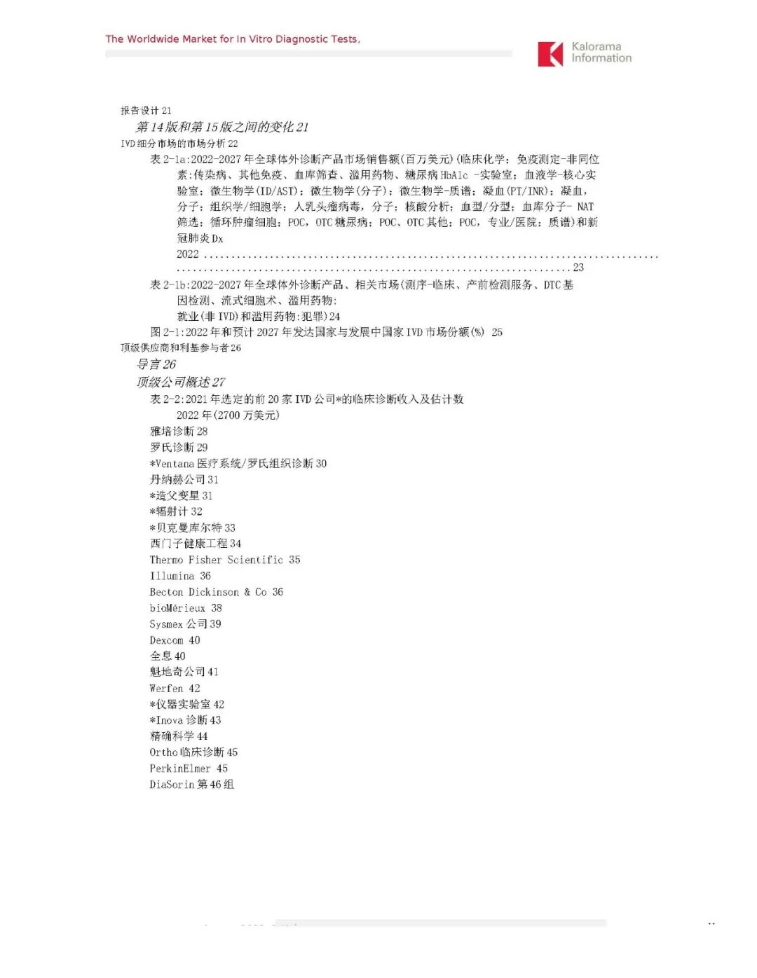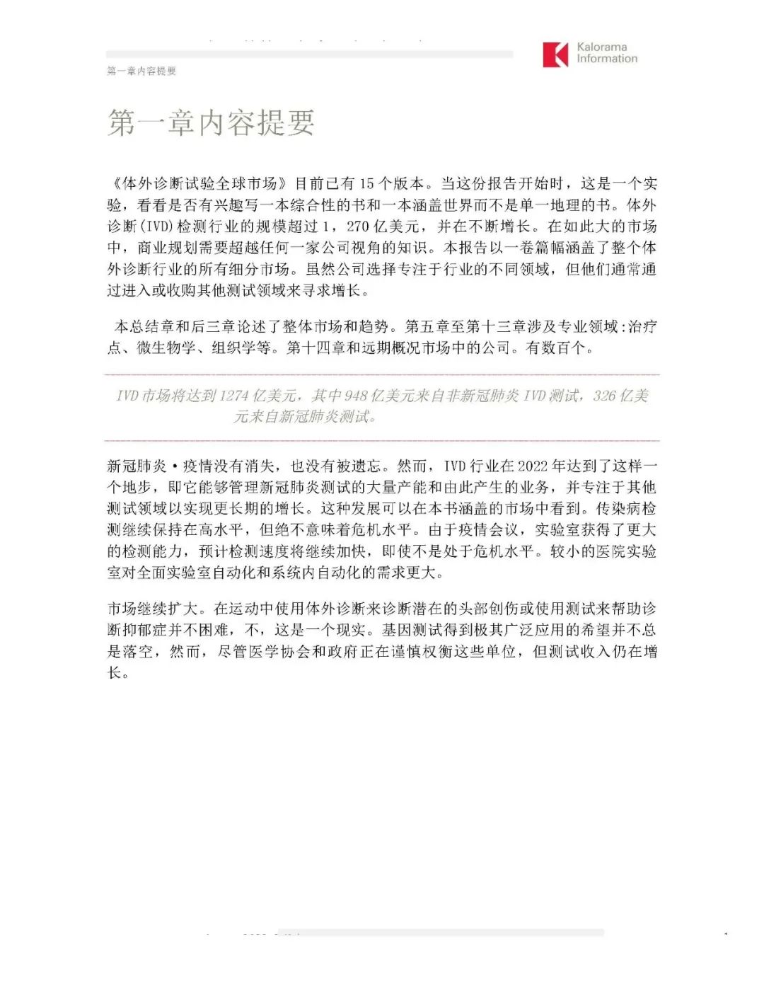 Kalorama Information在《全球IVD市场(第15版)》报告提供全球IVD (体外诊断) 检验市场相关调查,市场概要,各市场区隔/细分区隔的市场规模与预测,及主要各地区/国家的市场的分析与预测,以及各市场区隔的主要企业的简介等。 最近几年,体外诊断显然成为医疗健康产业与资本市场关注的重点,即使放在全球,体外诊断也是个极具潜力的风口行业,在精准医疗的风口之下,体外诊断行业迎来了非常好的发展时期,著名医疗保健市场调查公司Kalorama Information发布的报告《The World wide Market for In Vitro Diagnostic Tests,15th Edition》。 IVD市场亮点 以下是该报告的一些亮点: 从IVD市场的角度来看,新冠肺炎是长期存在的:自新冠肺炎登陆以来,已有近6亿人感染,600万人死亡。诊断市场的维持需要依赖疾病的威胁来进行测试销售。根据任何流行病学和市场计算,新冠肺炎将是一个健康问题,足以保证在整个五年预测期内进行检测,这是卡洛拉马目前的评估。2022年,对新冠肺炎的测试预计将为市场增加近330亿美元。 整合趋势加强:新冠肺炎加强而不是打破了IVD公司的整合趋势。有人认为情况可能相反,疫情带来了许多新的小公司。然而,较大的公司拥有更强的分销和生产能力,以及实验室的信誉。整合继续并得到加强,因为大型ivd具备疫情水平测试所需的能力。2022年,IVD顶级公司的IVD产品销售额约为1,010亿美元,而2021年为970亿美元,2020年为750亿美元,2019年为610亿美元,2018年为580亿美元,2017年为250亿美元,2016年为470亿美元。这表明2016-2022年顶级收入增长了约13.7%。 癌症检测的高增长率:与癌症检测相关的细分市场属于增长更快的收入细分市场:原位杂交、分子癌症标志物、免疫组织化学、人乳头瘤病毒分子检测。 除癌症外,增长明显的细分市场包括:滥用药物免疫测定、心脏标志物、FOB、Hba1c关注点检测和连续血糖将显示出高于市场的增长率。器官移植的遗传测试和分子测试也是市场高度增长的领域。 雅培诊断公司引领IVD市场:这标志着全球体外诊断市场头部公司的领导地位发生了变化。在我们的上一版中,罗氏和雅培并列市场领先地位。现在雅培领先了。原因是什么?雅培在快速诊断的地位源于其对Alere的收购、新冠肺炎疫情以及持续存在的检测市场。血糖检测销售也有所贡献。 这可能是暂时的领导层变动:罗氏的业务在COVID测试和非COVID测试市场都保持了实力和稳定性。罗氏的分子检测业务在与制药公司合作开发伴随检测方面具有未来的潜力。 增长将来自新兴市场销售:新冠肺炎迫使美国暂时扩大在IVD 市场的份额。2022年的形势恢复到2019年的状态,大多数IVD测试类别和美国以外的市场都将寻求增长。越南、土耳其、韩国、阿联酋、沙特阿拉伯、中国和拉丁美洲是主要的新兴市场选择。 质谱继续成为市场的重要组成部分,不仅仅是微生物领域。Kalorama估计,到2027年,质谱市场将达到16亿美元。糖尿病和维生素C是将进入该市场的细分市场之一。AB Sciex引入了HbA1c检测,该公司还提供维生素d的质量规格试剂盒。Newomics Inc .因其Sciex 质量规格系统上的25-OH-维生素D2/D3的IVD-MS试剂盒获得CE认证。脂肪科学正在开发一种用于HgA1c的硅微流控芯片LC-MS。其他测试必然也会随之而来;请继续关注。第7章免疫测定中更详细地讨论了质谱在诊断中的作用! |