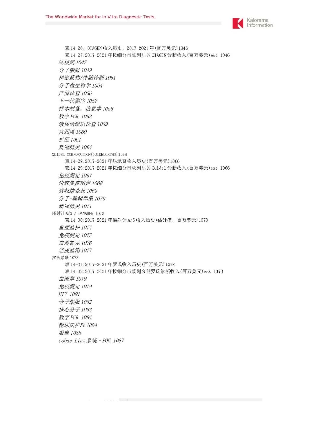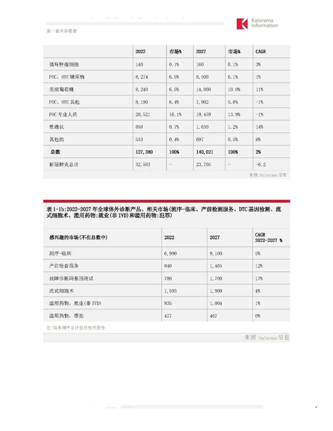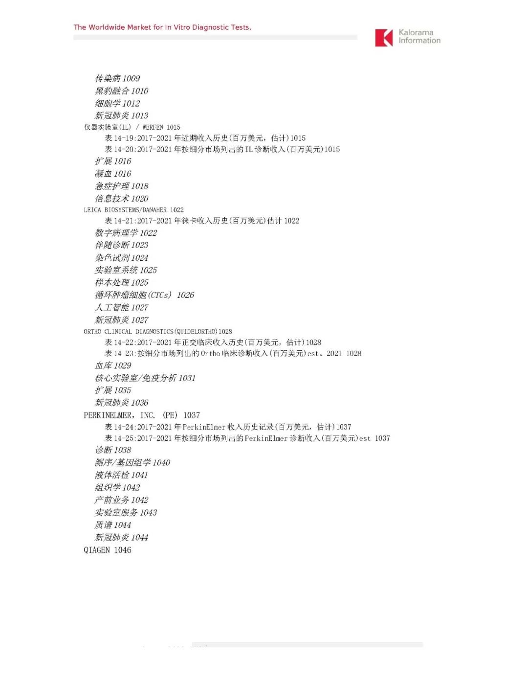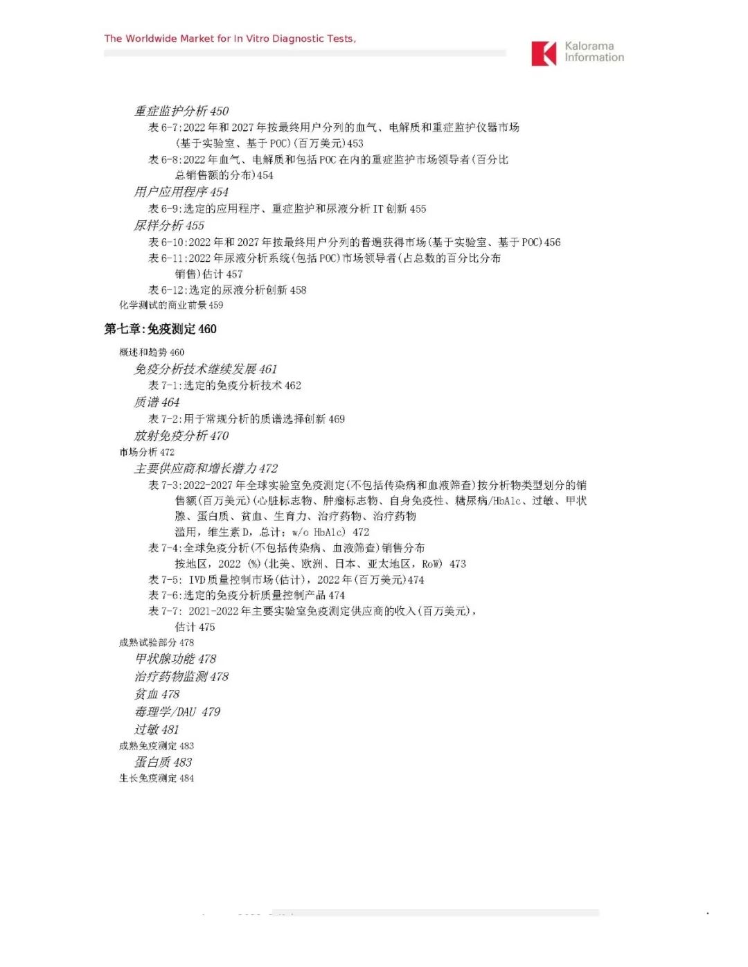 Kalorama Information在《全球IVD市场(第15版)》报告提供全球IVD (体外诊断) 检验市场相关调查,市场概要,各市场区隔/细分区隔的市场规模与预测,及主要各地区/国家的市场的分析与预测,以及各市场区隔的主要企业的简介等。 最近几年,体外诊断显然成为医疗健康产业与资本市场关注的重点,即使放在全球,体外诊断也是个极具潜力的风口行业,在精准医疗的风口之下,体外诊断行业迎来了非常好的发展时期,著名医疗保健市场调查公司Kalorama Information发布的报告《The World wide Market for In Vitro Diagnostic Tests,15th Edition》。 IVD市场亮点 以下是该报告的一些亮点: 从IVD市场的角度来看,新冠肺炎是长期存在的:自新冠肺炎登陆以来,已有近6亿人感染,600万人死亡。诊断市场的维持需要依赖疾病的威胁来进行测试销售。根据任何流行病学和市场计算,新冠肺炎将是一个健康问题,足以保证在整个五年预测期内进行检测,这是卡洛拉马目前的评估。2022年,对新冠肺炎的测试预计将为市场增加近330亿美元。 整合趋势加强:新冠肺炎加强而不是打破了IVD公司的整合趋势。有人认为情况可能相反,疫情带来了许多新的小公司。然而,较大的公司拥有更强的分销和生产能力,以及实验室的信誉。整合继续并得到加强,因为大型ivd具备疫情水平测试所需的能力。2022年,IVD顶级公司的IVD产品销售额约为1,010亿美元,而2021年为970亿美元,2020年为750亿美元,2019年为610亿美元,2018年为580亿美元,2017年为250亿美元,2016年为470亿美元。这表明2016-2022年顶级收入增长了约13.7%。 癌症检测的高增长率:与癌症检测相关的细分市场属于增长更快的收入细分市场:原位杂交、分子癌症标志物、免疫组织化学、人乳头瘤病毒分子检测。 除癌症外,增长明显的细分市场包括:滥用药物免疫测定、心脏标志物、FOB、Hba1c关注点检测和连续血糖将显示出高于市场的增长率。器官移植的遗传测试和分子测试也是市场高度增长的领域。 雅培诊断公司引领IVD市场:这标志着全球体外诊断市场头部公司的领导地位发生了变化。在我们的上一版中,罗氏和雅培并列市场领先地位。现在雅培领先了。原因是什么?雅培在快速诊断的地位源于其对Alere的收购、新冠肺炎疫情以及持续存在的检测市场。血糖检测销售也有所贡献。 这可能是暂时的领导层变动:罗氏的业务在COVID测试和非COVID测试市场都保持了实力和稳定性。罗氏的分子检测业务在与制药公司合作开发伴随检测方面具有未来的潜力。 增长将来自新兴市场销售:新冠肺炎迫使美国暂时扩大在IVD 市场的份额。2022年的形势恢复到2019年的状态,大多数IVD测试类别和美国以外的市场都将寻求增长。越南、土耳其、韩国、阿联酋、沙特阿拉伯、中国和拉丁美洲是主要的新兴市场选择。 质谱继续成为市场的重要组成部分,不仅仅是微生物领域。Kalorama估计,到2027年,质谱市场将达到16亿美元。糖尿病和维生素C是将进入该市场的细分市场之一。AB Sciex引入了HbA1c检测,该公司还提供维生素d的质量规格试剂盒。Newomics Inc .因其Sciex 质量规格系统上的25-OH-维生素D2/D3的IVD-MS试剂盒获得CE认证。脂肪科学正在开发一种用于HgA1c的硅微流控芯片LC-MS。其他测试必然也会随之而来;请继续关注。第7章免疫测定中更详细地讨论了质谱在诊断中的作用! |