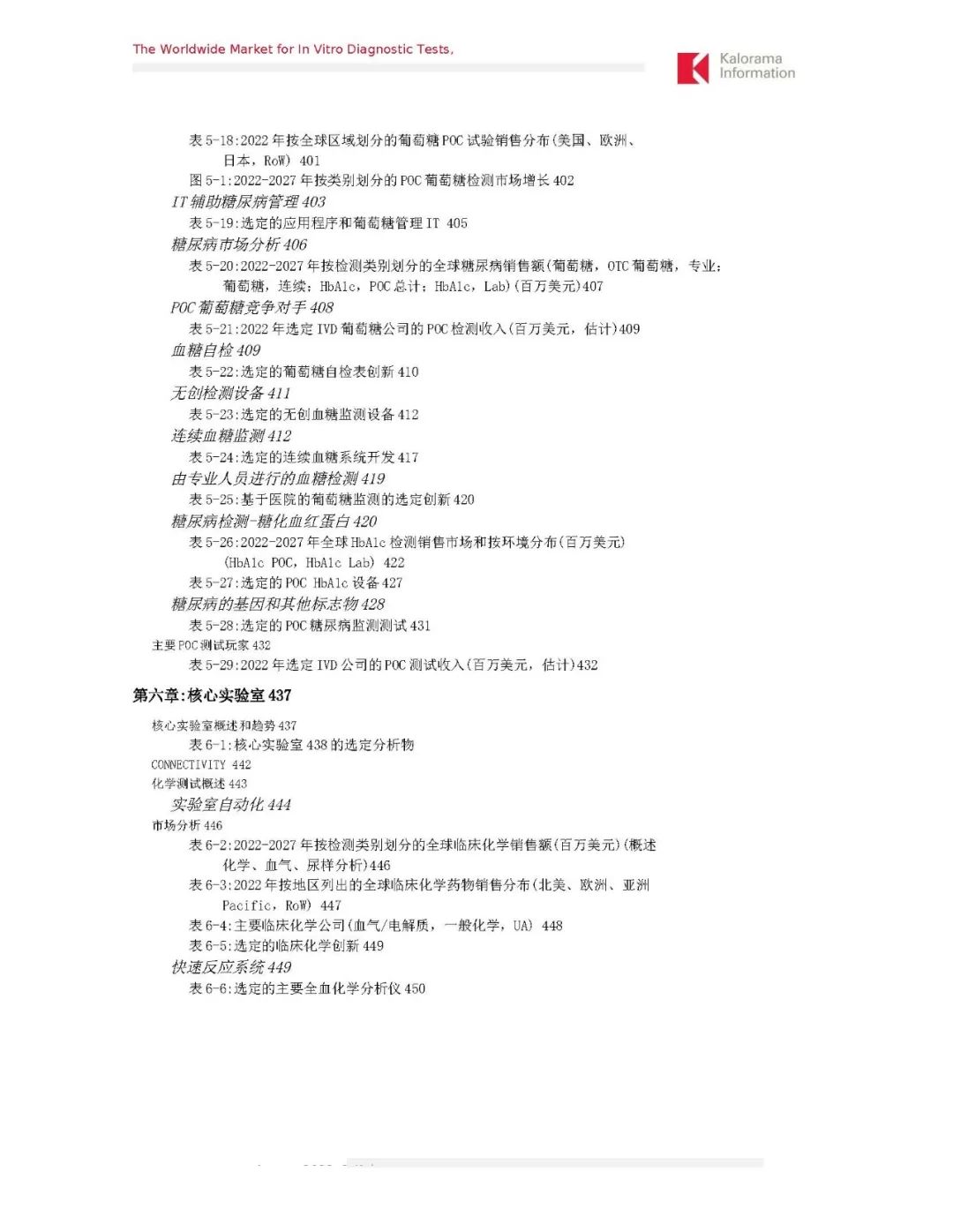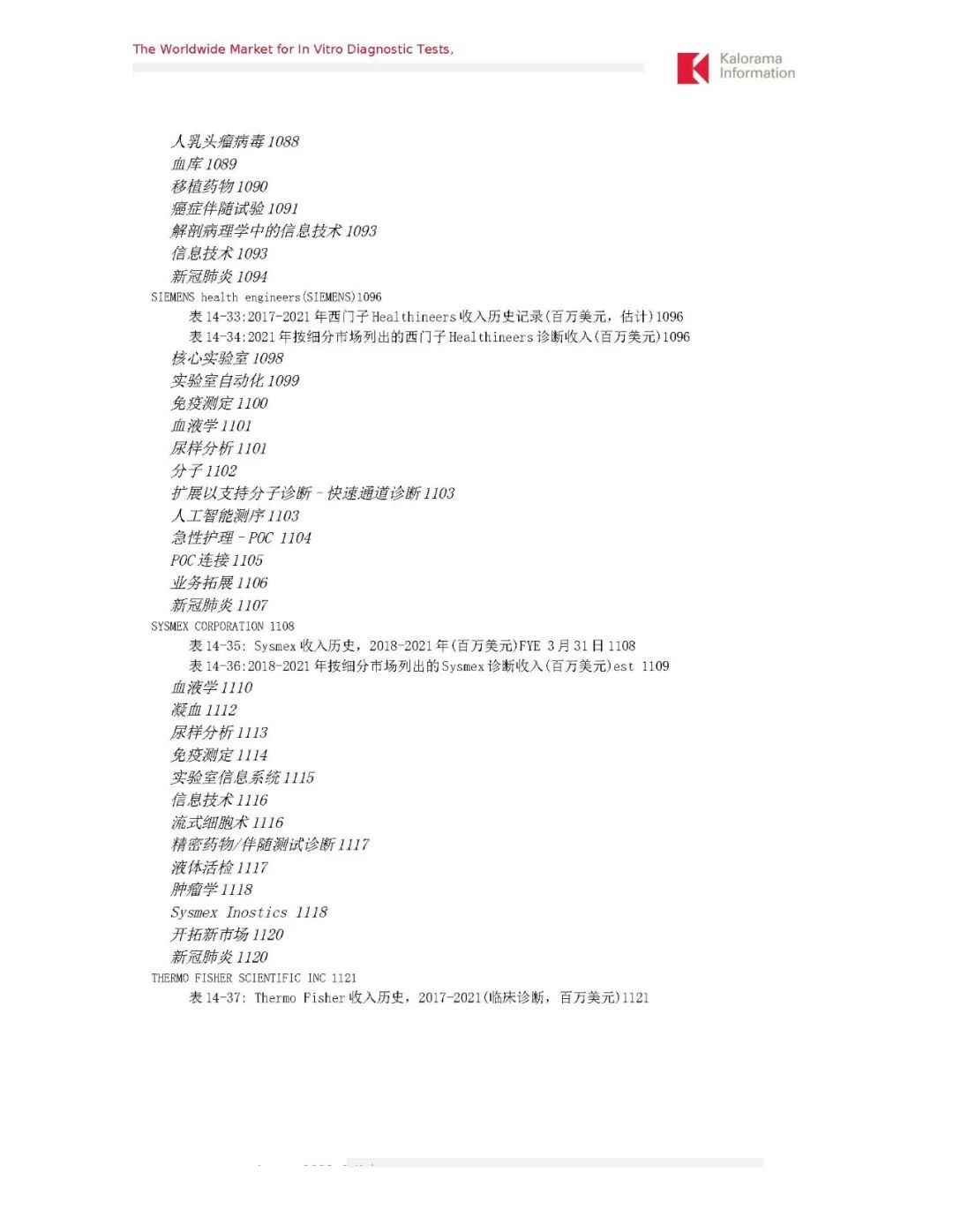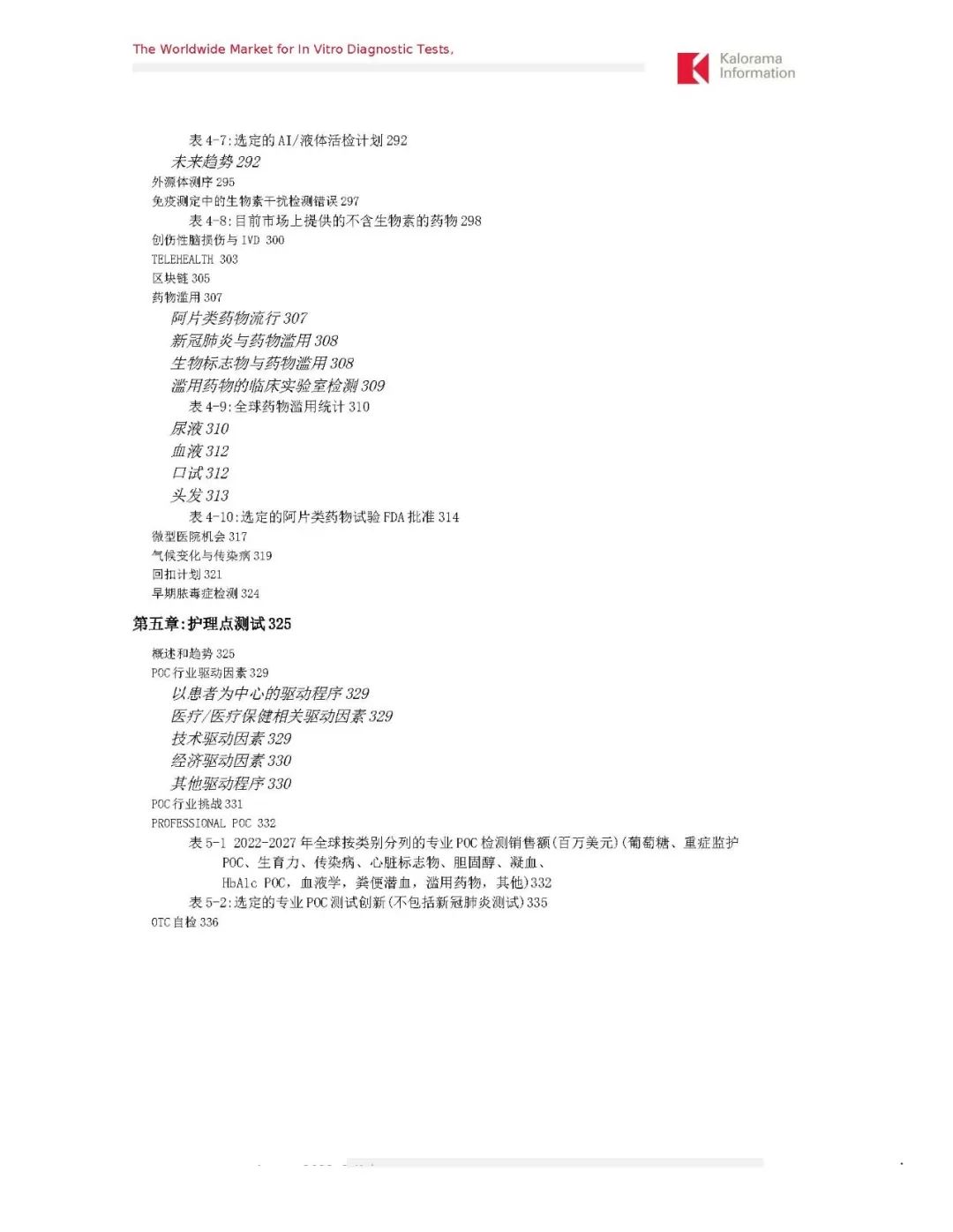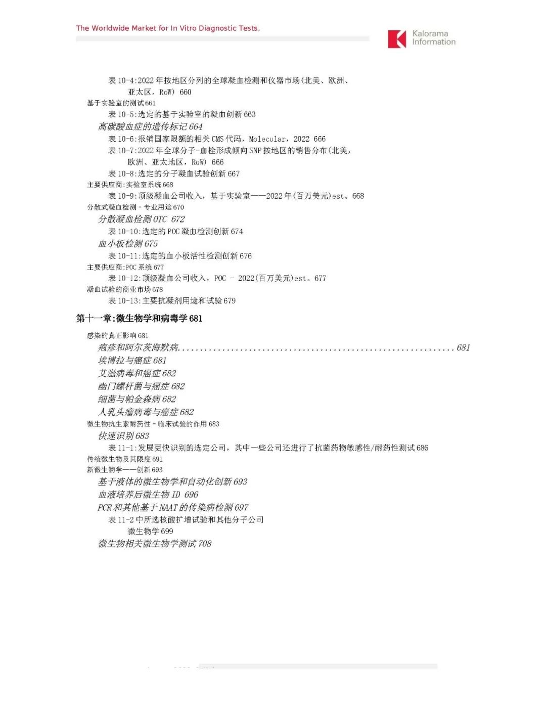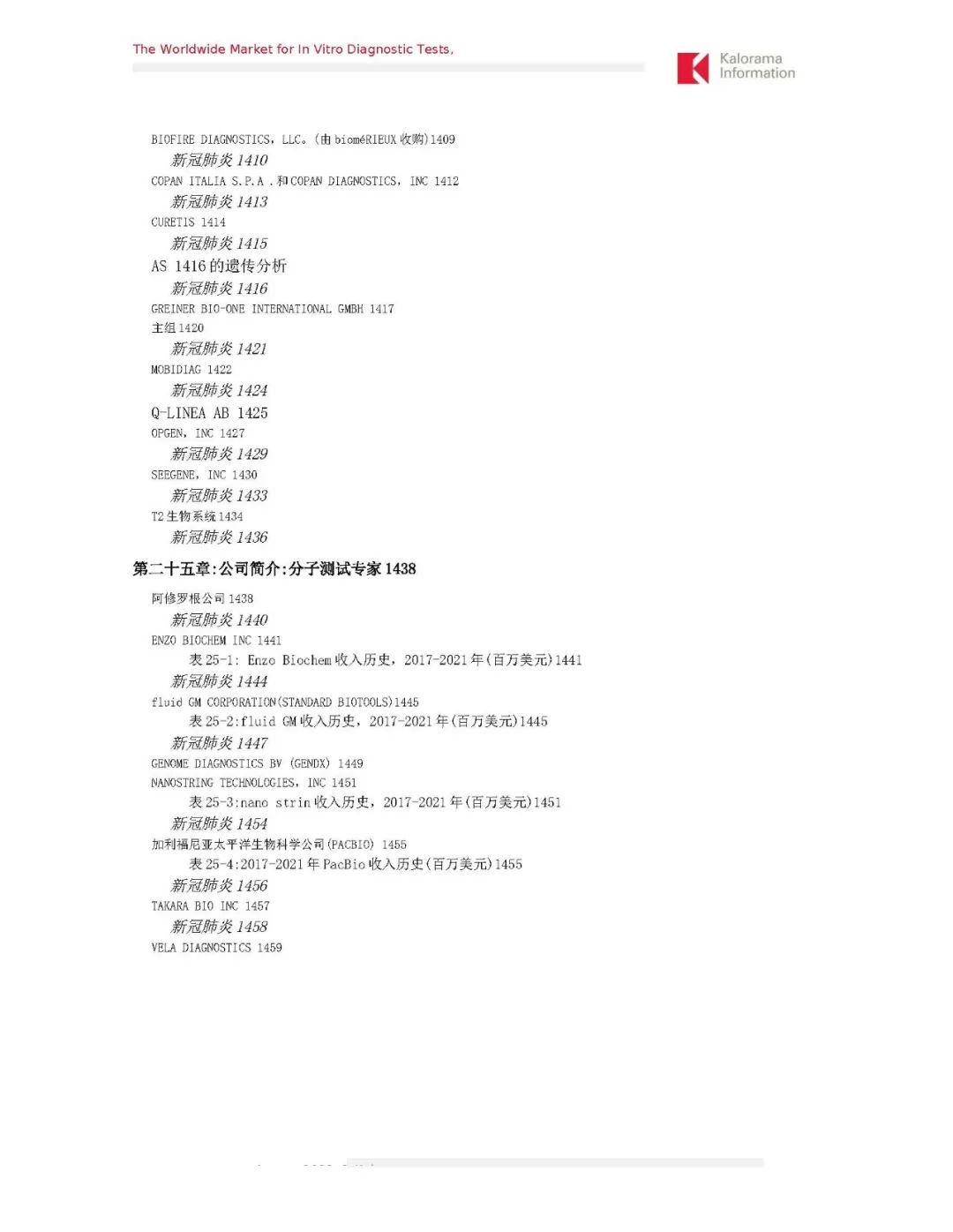 Kalorama Information在《全球IVD市场(第15版)》报告提供全球IVD (体外诊断) 检验市场相关调查,市场概要,各市场区隔/细分区隔的市场规模与预测,及主要各地区/国家的市场的分析与预测,以及各市场区隔的主要企业的简介等。 最近几年,体外诊断显然成为医疗健康产业与资本市场关注的重点,即使放在全球,体外诊断也是个极具潜力的风口行业,在精准医疗的风口之下,体外诊断行业迎来了非常好的发展时期,著名医疗保健市场调查公司Kalorama Information发布的报告《The World wide Market for In Vitro Diagnostic Tests,15th Edition》。 IVD市场亮点 以下是该报告的一些亮点: 从IVD市场的角度来看,新冠肺炎是长期存在的:自新冠肺炎登陆以来,已有近6亿人感染,600万人死亡。诊断市场的维持需要依赖疾病的威胁来进行测试销售。根据任何流行病学和市场计算,新冠肺炎将是一个健康问题,足以保证在整个五年预测期内进行检测,这是卡洛拉马目前的评估。2022年,对新冠肺炎的测试预计将为市场增加近330亿美元。 整合趋势加强:新冠肺炎加强而不是打破了IVD公司的整合趋势。有人认为情况可能相反,疫情带来了许多新的小公司。然而,较大的公司拥有更强的分销和生产能力,以及实验室的信誉。整合继续并得到加强,因为大型ivd具备疫情水平测试所需的能力。2022年,IVD顶级公司的IVD产品销售额约为1,010亿美元,而2021年为970亿美元,2020年为750亿美元,2019年为610亿美元,2018年为580亿美元,2017年为250亿美元,2016年为470亿美元。这表明2016-2022年顶级收入增长了约13.7%。 癌症检测的高增长率:与癌症检测相关的细分市场属于增长更快的收入细分市场:原位杂交、分子癌症标志物、免疫组织化学、人乳头瘤病毒分子检测。 除癌症外,增长明显的细分市场包括:滥用药物免疫测定、心脏标志物、FOB、Hba1c关注点检测和连续血糖将显示出高于市场的增长率。器官移植的遗传测试和分子测试也是市场高度增长的领域。 雅培诊断公司引领IVD市场:这标志着全球体外诊断市场头部公司的领导地位发生了变化。在我们的上一版中,罗氏和雅培并列市场领先地位。现在雅培领先了。原因是什么?雅培在快速诊断的地位源于其对Alere的收购、新冠肺炎疫情以及持续存在的检测市场。血糖检测销售也有所贡献。 这可能是暂时的领导层变动:罗氏的业务在COVID测试和非COVID测试市场都保持了实力和稳定性。罗氏的分子检测业务在与制药公司合作开发伴随检测方面具有未来的潜力。 增长将来自新兴市场销售:新冠肺炎迫使美国暂时扩大在IVD 市场的份额。2022年的形势恢复到2019年的状态,大多数IVD测试类别和美国以外的市场都将寻求增长。越南、土耳其、韩国、阿联酋、沙特阿拉伯、中国和拉丁美洲是主要的新兴市场选择。 质谱继续成为市场的重要组成部分,不仅仅是微生物领域。Kalorama估计,到2027年,质谱市场将达到16亿美元。糖尿病和维生素C是将进入该市场的细分市场之一。AB Sciex引入了HbA1c检测,该公司还提供维生素d的质量规格试剂盒。Newomics Inc .因其Sciex 质量规格系统上的25-OH-维生素D2/D3的IVD-MS试剂盒获得CE认证。脂肪科学正在开发一种用于HgA1c的硅微流控芯片LC-MS。其他测试必然也会随之而来;请继续关注。第7章免疫测定中更详细地讨论了质谱在诊断中的作用! |