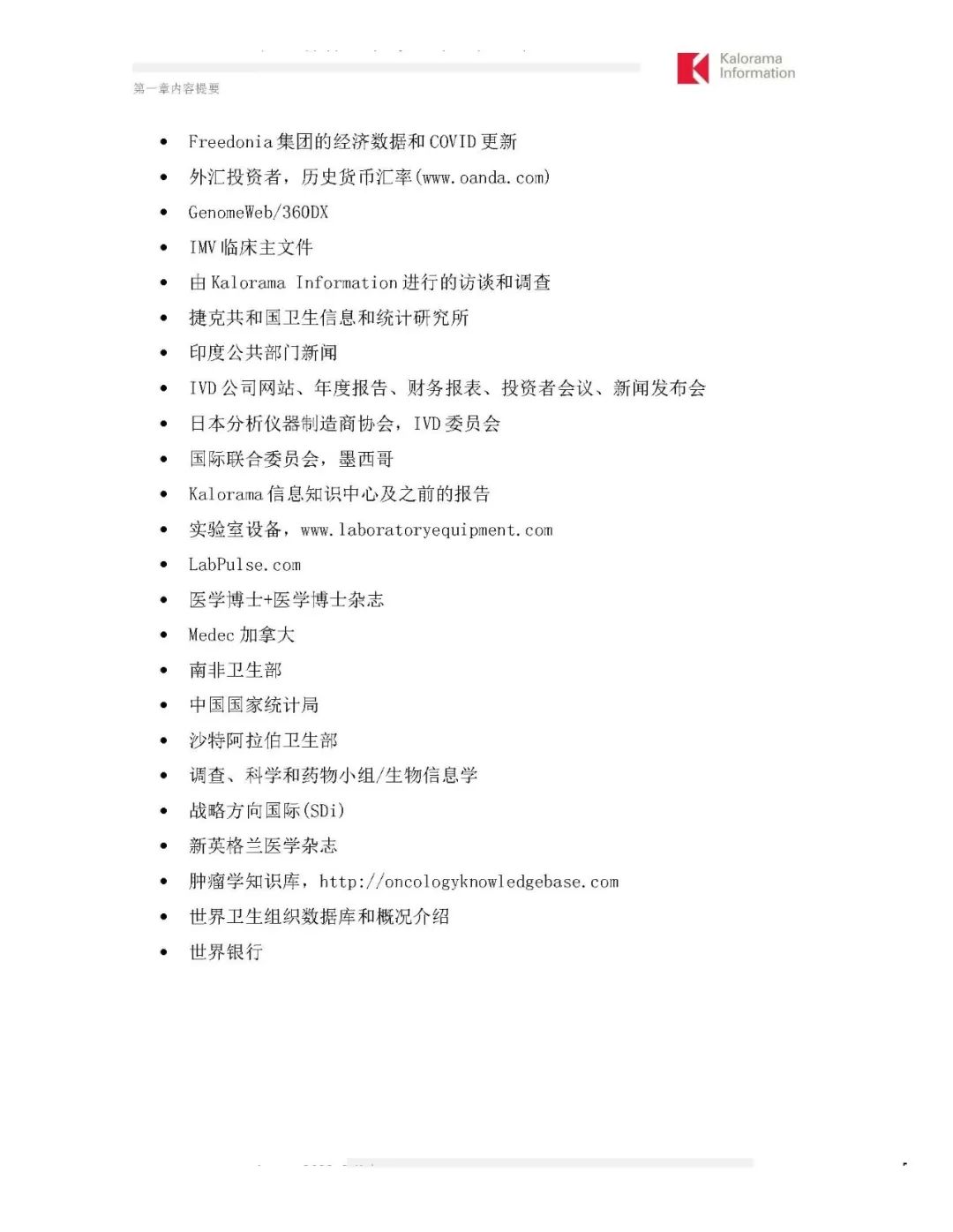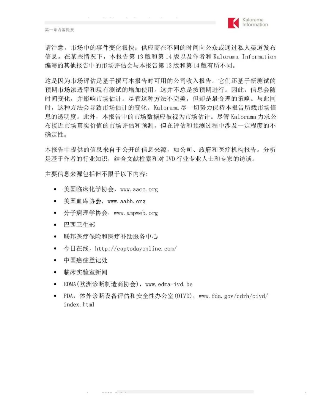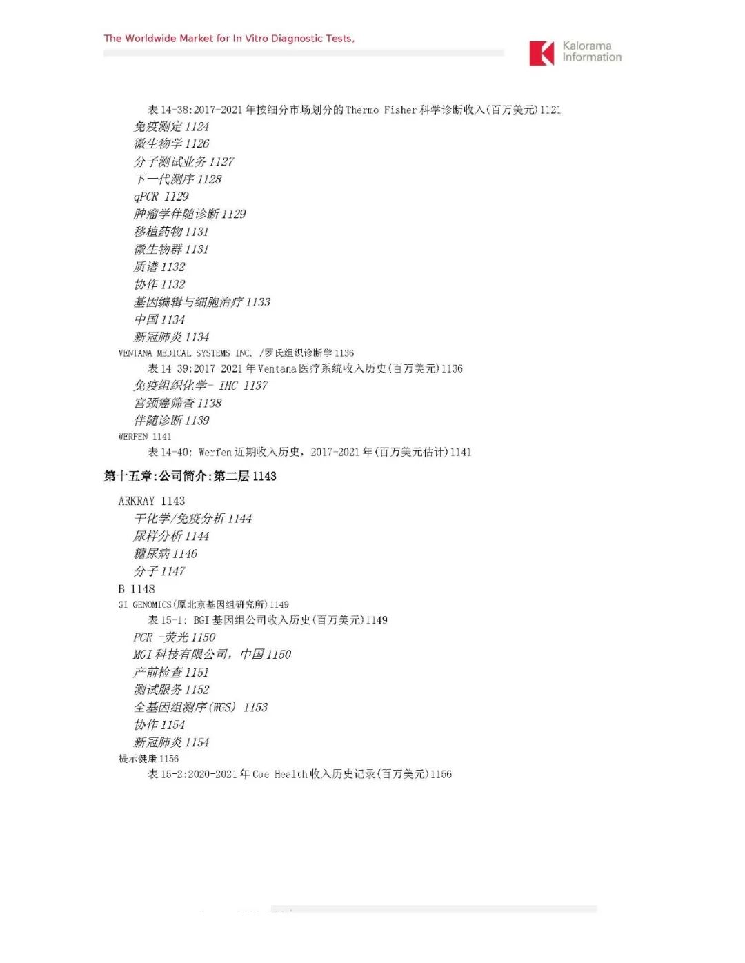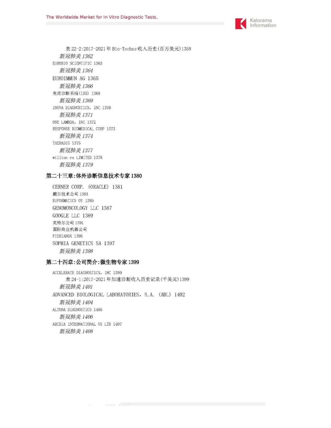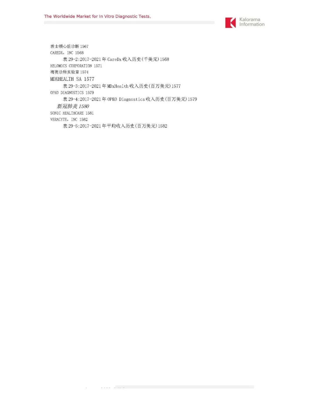 Kalorama Information在《全球IVD市场(第15版)》报告提供全球IVD (体外诊断) 检验市场相关调查,市场概要,各市场区隔/细分区隔的市场规模与预测,及主要各地区/国家的市场的分析与预测,以及各市场区隔的主要企业的简介等。 最近几年,体外诊断显然成为医疗健康产业与资本市场关注的重点,即使放在全球,体外诊断也是个极具潜力的风口行业,在精准医疗的风口之下,体外诊断行业迎来了非常好的发展时期,著名医疗保健市场调查公司Kalorama Information发布的报告《The World wide Market for In Vitro Diagnostic Tests,15th Edition》。 IVD市场亮点 以下是该报告的一些亮点: 从IVD市场的角度来看,新冠肺炎是长期存在的:自新冠肺炎登陆以来,已有近6亿人感染,600万人死亡。诊断市场的维持需要依赖疾病的威胁来进行测试销售。根据任何流行病学和市场计算,新冠肺炎将是一个健康问题,足以保证在整个五年预测期内进行检测,这是卡洛拉马目前的评估。2022年,对新冠肺炎的测试预计将为市场增加近330亿美元。 整合趋势加强:新冠肺炎加强而不是打破了IVD公司的整合趋势。有人认为情况可能相反,疫情带来了许多新的小公司。然而,较大的公司拥有更强的分销和生产能力,以及实验室的信誉。整合继续并得到加强,因为大型ivd具备疫情水平测试所需的能力。2022年,IVD顶级公司的IVD产品销售额约为1,010亿美元,而2021年为970亿美元,2020年为750亿美元,2019年为610亿美元,2018年为580亿美元,2017年为250亿美元,2016年为470亿美元。这表明2016-2022年顶级收入增长了约13.7%。 癌症检测的高增长率:与癌症检测相关的细分市场属于增长更快的收入细分市场:原位杂交、分子癌症标志物、免疫组织化学、人乳头瘤病毒分子检测。 除癌症外,增长明显的细分市场包括:滥用药物免疫测定、心脏标志物、FOB、Hba1c关注点检测和连续血糖将显示出高于市场的增长率。器官移植的遗传测试和分子测试也是市场高度增长的领域。 雅培诊断公司引领IVD市场:这标志着全球体外诊断市场头部公司的领导地位发生了变化。在我们的上一版中,罗氏和雅培并列市场领先地位。现在雅培领先了。原因是什么?雅培在快速诊断的地位源于其对Alere的收购、新冠肺炎疫情以及持续存在的检测市场。血糖检测销售也有所贡献。 这可能是暂时的领导层变动:罗氏的业务在COVID测试和非COVID测试市场都保持了实力和稳定性。罗氏的分子检测业务在与制药公司合作开发伴随检测方面具有未来的潜力。 增长将来自新兴市场销售:新冠肺炎迫使美国暂时扩大在IVD 市场的份额。2022年的形势恢复到2019年的状态,大多数IVD测试类别和美国以外的市场都将寻求增长。越南、土耳其、韩国、阿联酋、沙特阿拉伯、中国和拉丁美洲是主要的新兴市场选择。 质谱继续成为市场的重要组成部分,不仅仅是微生物领域。Kalorama估计,到2027年,质谱市场将达到16亿美元。糖尿病和维生素C是将进入该市场的细分市场之一。AB Sciex引入了HbA1c检测,该公司还提供维生素d的质量规格试剂盒。Newomics Inc .因其Sciex 质量规格系统上的25-OH-维生素D2/D3的IVD-MS试剂盒获得CE认证。脂肪科学正在开发一种用于HgA1c的硅微流控芯片LC-MS。其他测试必然也会随之而来;请继续关注。第7章免疫测定中更详细地讨论了质谱在诊断中的作用! |