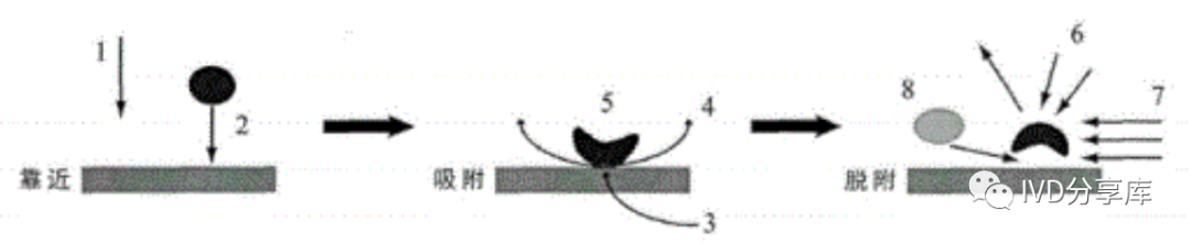 1-运输性质;2-溶剂介导的蛋白质和材料之间的相互作用;3-蛋白质和材料之间的短程相互作用;4-释放结合水和抗衡离子作用引起的熵增;5-蛋白质变性引起的熵增;6-溶剂热扰动;7-溶剂剪切流动;8-其他吸附质的取代