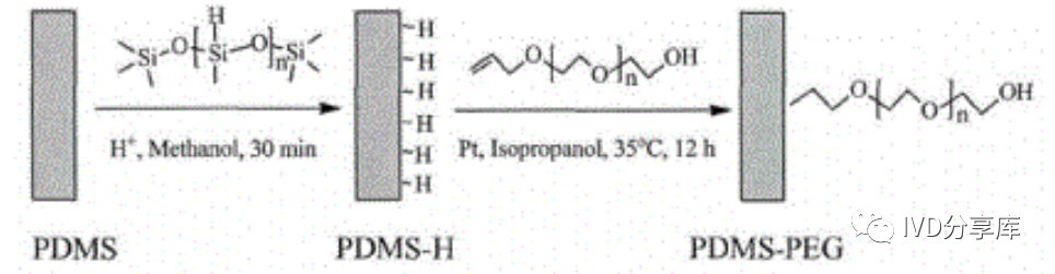 PDMS表面枝接聚乙二醇实验过程如下图所示。由于PDMS具有一定的惰性,因此,在进行表面接枝反应之前需对其进行表面官能化以引入活性反应位点。首先通过在PDMS表面引入Si-H键的方法来达到表面活化的目的。在浓盐酸的催化作用下,PDMS表层的Si-O键和含氢硅油中的Si-O键同时断裂并发生重排,从而在PDMS表面引入Si-H键。烯丙基聚乙二醇的一端带有双键,利用此双键与PDMS-H上的Si-H键反应将PEG接枝PDMS表面。