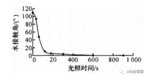PDMS紫外光照改性前的表面水接触角为110°,表现出极大的疏水性质,但经过真空紫外光照处理后,表面水接触角变小,亲水性增强。由下图PDMS表而水接触角随光照时间变化图可以看出,随着真空紫外光照时间的延长,PDMS表面水接触角逐渐下降,在光照时间为10min时,水接触角接近 0°,表面变得几乎完全亲水但这种良好的亲水性难以得到长久的保持。