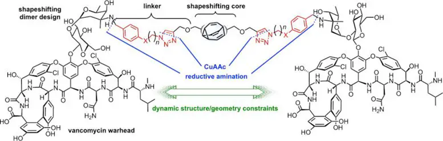 近期,关于耳念珠菌(Candida auris,C. auris)在美国一半以上州传播的消息引发网民关注。虽然这种真菌的主要威胁集中在需要用到辅助医疗器械的特殊人群身上,但值得注意的是,出现了许多对棘白菌素耐药的病例,而棘白菌素是最推荐用于治疗耳念珠菌感染的抗真菌药物。美国疾病控制与预防中心因此将C. auris认定为一种紧迫的抗生素耐药性(antimicrobial resistance,AR)威胁。 耐药性一直是一项严重的公共卫生威胁,被世界卫生组织列为前十大威胁之一。每年仅在美国就有近300万人感染耐药细菌和真菌,导至约3.5万人死亡。虽然抗生素在治疗感染方面至关重要,但过度使用已导至耐药菌株的发展。这些感染对治疗构成了重大挑战。 现在,冷泉港实验室(Cold Spring Harbor Laboratory,CSHL)的John E. 图1 研究成果(图源:[1]) Moses教授从观察军事训练演习的坦克中得到了形态变化抗生素的灵感。坦克具有旋转炮塔和灵活的移动能力,可以快速应对可能的威胁。他开始思考能否创造出一种具有类似灵活结构的药物,可以根据环境改变形状。“这个想法非常疯狂,我不知道该怎么实现它。”他说。 几年后,Moses教授了解到了一种叫做牛烯(bullvalene)的分子。牛烯是一种流动分子,意味着它的原子可以交换位置,从而赋予它超过一百万种可能的构象——正是Moses教授所寻找的流动性。 新抗生素的化学结构是由Moses教授设计并由其实验室合成的。Moses教授的合作伙伴、澳大利亚纽卡斯尔大学的Thomas Fallon博士提供了形态变化的牛烯核心。Moses教授表示,有一个评论者称这项研究是“我见过的最酷、最复杂的天然产物衍生物论文”。 万古霉素是一类糖肽类抗生素,用于治疗从皮肤感染到脑膜炎的各种耐药性细菌感染。然而,近几十年来,出现了一些对之产生耐药性的细菌,包括MRSA(耐甲氧西林的金黄色葡萄球菌)、VRSA(耐万古霉素的金黄色葡萄球菌)和VRE(耐万古霉素的肠球菌属细菌)等。Moses教授认为,将其与牛烯结合起来可以提高万古霉素对抗细菌的效果。 他转向了快速、高产率的“点击化学”技术,该技术又被称为“链接化学”、“速配接合组合式化学”,可以通过小单元的拼接,快速可靠地“点击”分子在一起,使反应更有效率。2022年,该技术的主要贡献者获得了诺贝尔化学奖。 “点击化学很棒,”Moses教授说道,他曾在两届诺奖得主K. Barry Sharpless的指导下学习这一革命性的技术,“这给了你确定性和制造复杂物质的最好机会。” 利用这种技术,Moses教授和他的同事创造了一种新的抗生素,具有两个万古霉素“弹头”和一个流动的牛烯中心。 图2 新型“变形”抗生素结构示意(图源:[2]) 万古霉素能够杀灭细菌的关键机制在于,它能够与细菌细胞壁生物合成途径中的一个重要分子结合,从而破坏细菌细胞壁的合成过程,导至细菌死亡。而细菌如果改变了该分子与万古霉素结合部位的关键二肽,或通过发生变异,表达一种能够催化替代合成途径的酶,就能够继续合成细胞壁,形成对万古霉素的耐药性。不过,这次Moses教授合成的可变形万古霉素二聚体则无惧于这种变化。另外,Moses教授还发现,“变形”万古霉素能够破坏翻转酶 MurJ和脂质II之间形成的复合物的稳定性,该复合物同样对细菌细胞壁的生长和维护十分关键,这意味着“变形”万古霉素又开辟了一条杀死细菌的新通道。 Moses教授与阿德莱德大学的Tatiana Moses教授解释说,研究人员可以利用点击化学和形态变化的抗生素创造出多种新药物。这样的抗感染武器甚至可能是我们物种生存和进化的关键。 “如果我们能发明能够决定生死的分子,”他说,“那将是最伟大的成就。” 责编|风立宵 End 参考资料: |