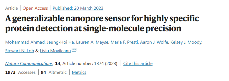 [1]M. Ahmad, J.-H. Ha, L.A. Mayse, et al. Movileanu. A Generalizable Nanopore Sensor for Highly Specific Protein Detection at Single-Molecule Precision. Nature Communications, 2023 DOI: 10.1038/s41467-023-36944-9