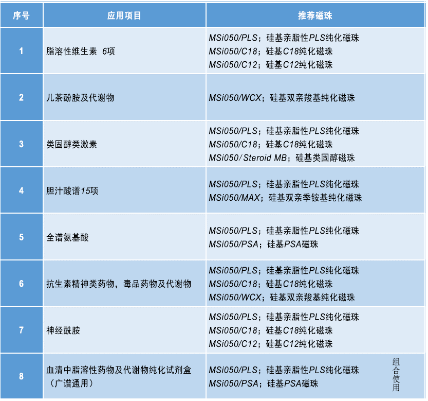 萃取应用 儿茶酚胺 | 脂溶性维生素 | 全谱氨基酸 胆汁酸 | 抗生素 突破:磁性固相萃取 质谱分析作为高端定量检测分析,在检验的灵敏度、特异性、分析速度、多指标同时检测分析等方面具有明显优势,临床上主要应用于新生儿遗传筛查、维生素D检测、微生物诊断、药物检测等检测领域。 但检测分析过程中,由于样品组分复杂,且目标物含量极低,不能直接用于仪器分析,检测前需对样品进行有效处理、分离和富集目标物。目前一般采用固相萃取法(SPE)进行样品前处理分离操作,但该方法整个过程繁琐、耗时、且有机溶剂使用量大。 近年来,核酸检测的普及将磁珠法·自动化推向了一个新高度,同时也将磁性固相萃取(MSPE)的应用场景更为丰富化:环境、食品、生物、医药等领域样品的分离和富集。该方法可避免普通固相萃取技术繁琐的过柱操作、吸附柱容易堵赛、重复性差等问题,且具有操作简单、萃取时间短、有机试剂使用量少、易于自动化操作等优点,深受关注。 英芮诚基于多年的纳米磁珠研发应用经验,开发了一系列可应用质谱检测前处理的纳米磁珠,组合超声辅助萃取功能,突破传统小柱的萃取效率瓶颈,外加磁场快速分离,免离心,轻松实现高效自动化样品富集。如血清/血浆中儿茶酚胺、脂溶性维生素、全谱氨基酸、胆汁酸、抗生素及毒品药物等目标物的快速自动化萃取。 01 ✦ MSi050/WCX