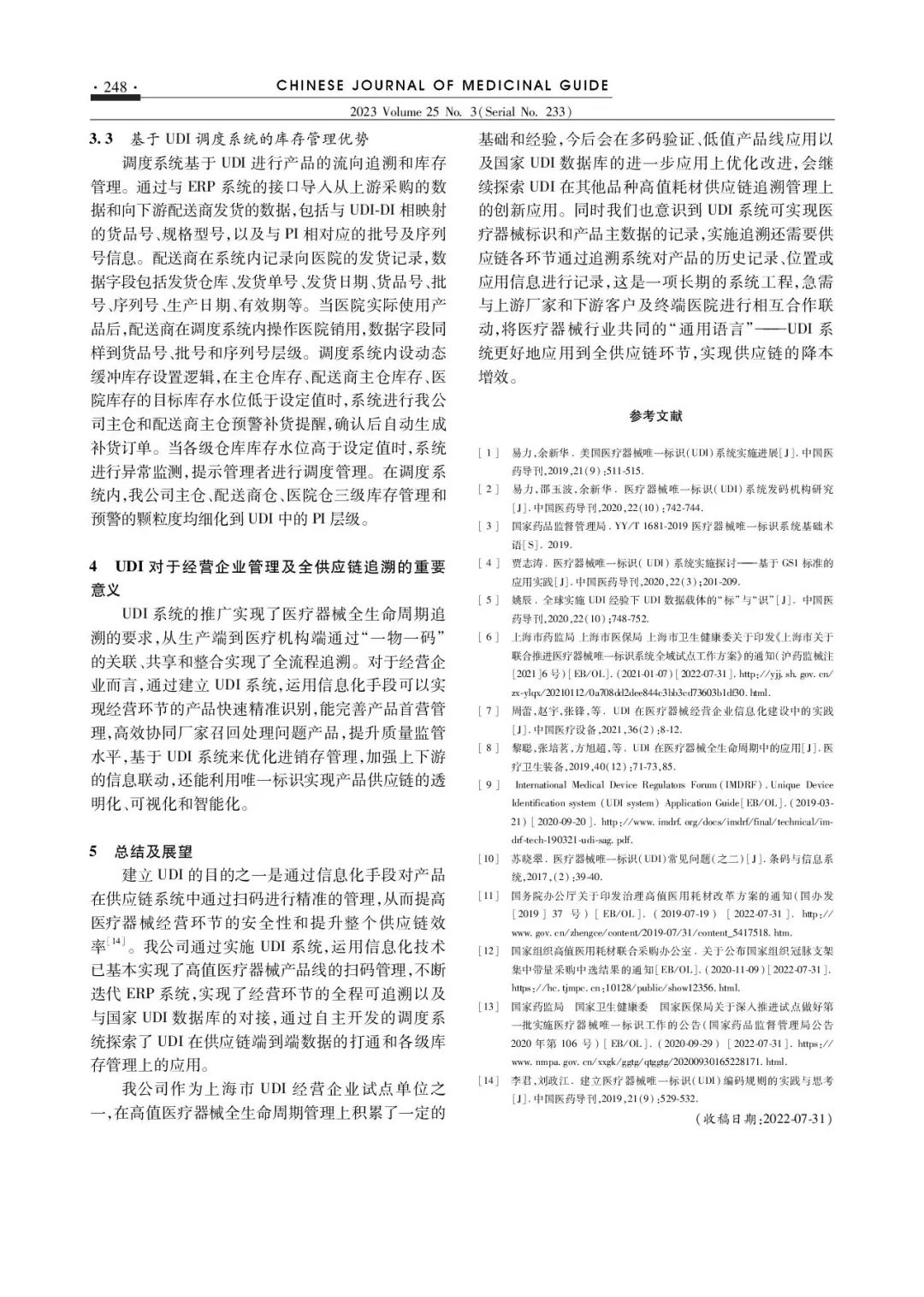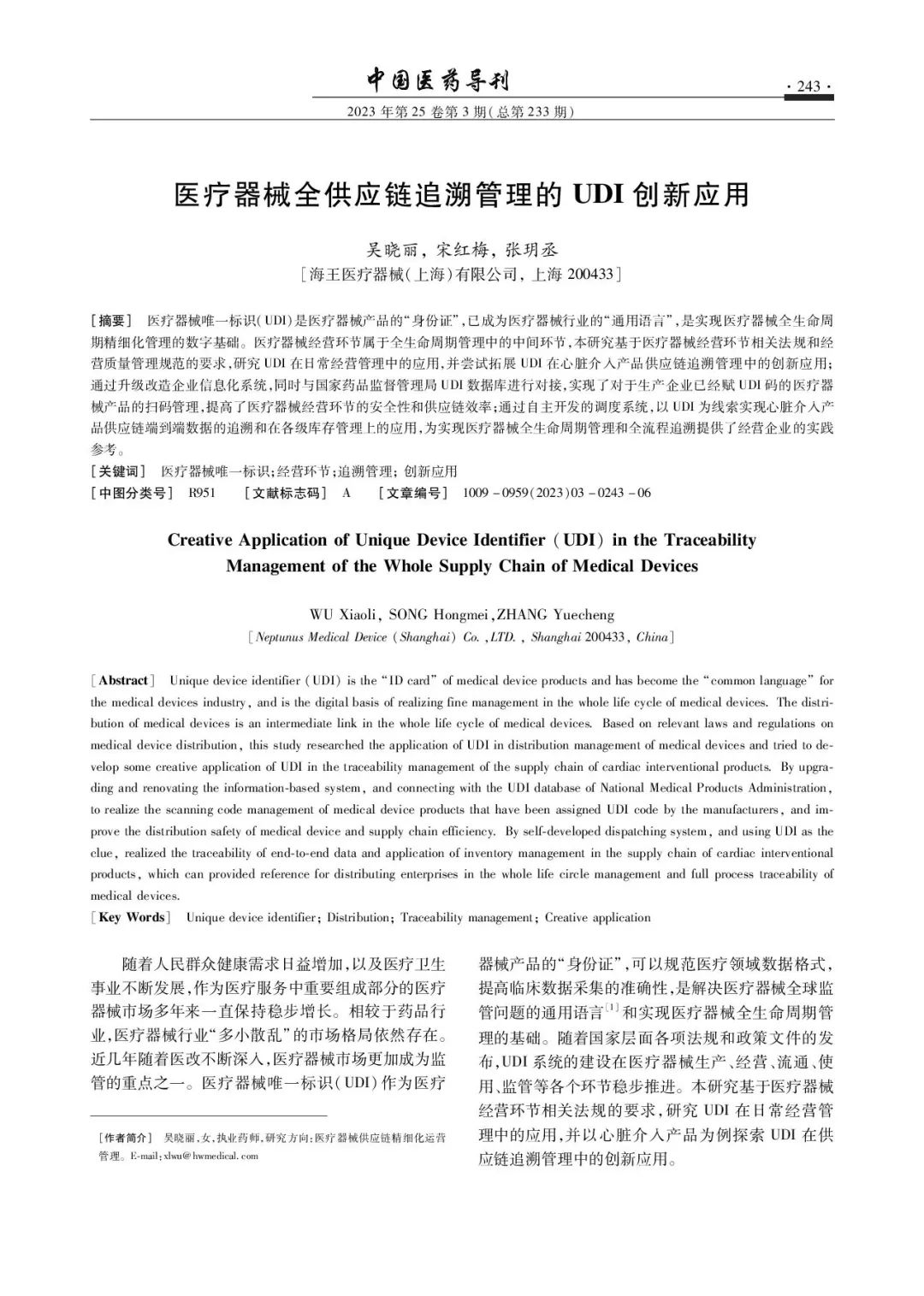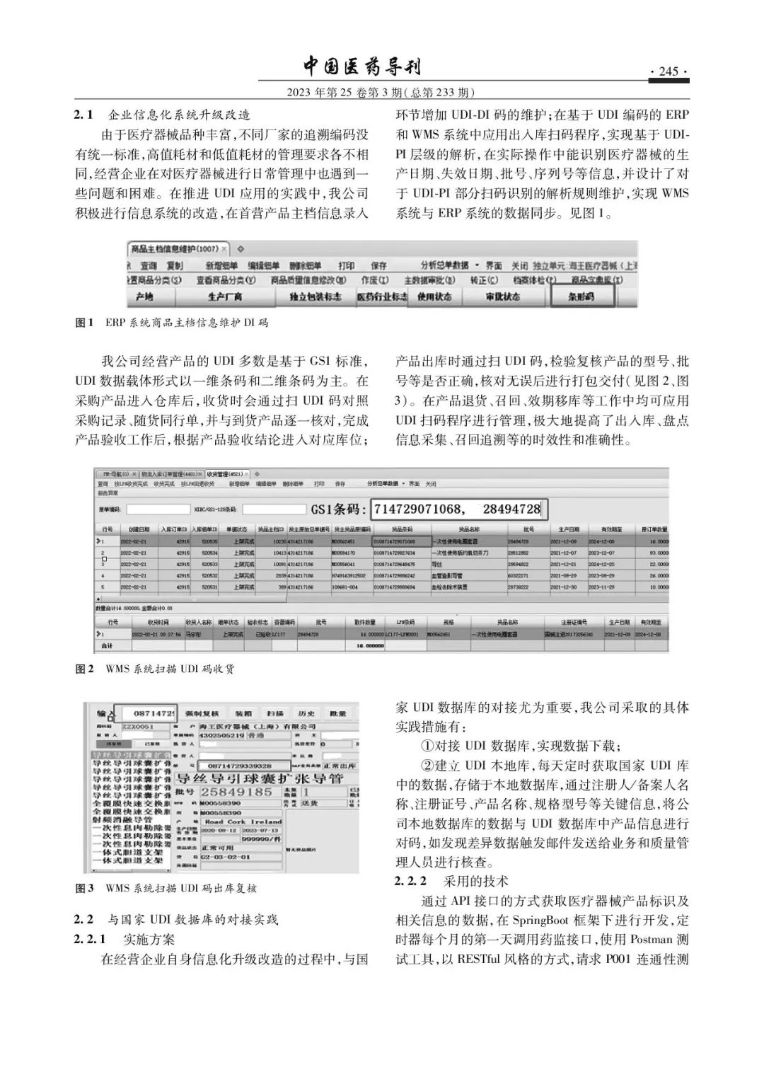 医疗器械全供应链追溯管理的UDI创新应用 •引用格式• 吴晓丽, 宋红梅, 张玥丞. 医疗器械全供应链追溯管理的UDI创新应用[J]. 中国医药导刊,2023,25(3):243-248. 【作者】吴晓丽,宋红梅,张玥丞 【单位】海王医疗器械(上海)有限公司,上海 200433 •摘 要• 医疗器械唯一标识(UDI)是医疗器械产品的“身份证”,已成为医疗器械行业的“通用语言”,是实现医疗器械全生命周期精细化管理的数字基础。医疗器械经营环节属于全生命周期管理中的中间环节,本研究基于医疗器械经营环节相关法规和经营质量管理规范的要求,研究UDI在日常经营管理中的应用,并尝试拓展UDI在心脏介入产品供应链追溯管理中的创新应用;通过升级改造企业信息化系统,同时与国家药品监督管理局UDI数据库进行对接,实现了对于生产企业已经赋UDI码的医疗器械产品的扫码管理,提高了医疗器械经营环节的安全性和供应链效率;通过自主开发的调度系统,以UDI为线索实现心脏介入产品供应链端到端数据的追溯和在各级库存管理上的应用,为实现医疗器械全生命周期管理和全流程追溯提供了经营企业的实践参考。 •关键词• 医疗器械唯一标识;经营环节;追溯管理;创新应用 本文刊登于《中国医药导刊》2023年第3期,更多精彩内容可登陆《中国医药导刊》网站。热忱欢迎医药领域相关研究人员积极投稿、荐稿。 |