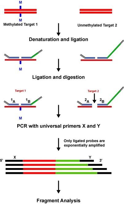后基因组时代,研究的重点从基因组的结构转移到基因的功能,即从分子层面上探索生命的奥秘和多样性。本文分享一种不是“很新”的但实用的分子诊断技术---MLPA技术,它可以同时检测多个基因组靶区域的拷贝数变异和甲基化水平,从而诊断由基因组缺失/重复或由表观遗传异常所导至的遗传性疾病,如脊髓性肌萎缩症、假性肥大型肌营养不良、Prader-Willi/Angelman综合征等。具有成本较低、灵敏度高、特异性强、操作简便等优点,只需少量的DNA样本,就可以获得可靠的结果。还可以在产前诊断中发挥重要作用,通过对羊水或绒毛样本进行检测,可以及时发现胎儿是否存在染色体异常或其他遗传缺陷。 MLPA法是“多重连接依赖探针扩增的技术”的简称,是一种高通量、针对待测核酸中靶序列进行定性和定量分析的检测技术。它的基本原理是利用简单的探针和靶序列DNA进行杂交,之后通过连接、PCR扩增,产物通过毛细管电泳分离及数据收集,分析软件对收集的数据进行分析最后得出结论。它可以同时检测多达50种核苷酸序列的拷贝数变化,并且可以检测小于60bp的片段。它可以用于检测一些与疾病相关的基因或染色体的缺失或扩增。 MLPA法的历史可以追溯到2002年,当时荷兰学者Dr.Schouten提出了这种多重连接依赖探针扩增的技术。他在一篇论文中描述了这种方法的原理和应用。MLPA法是由MRC-Holland公司开发和商业化的,该公司提供了各种MLPA试剂盒和分析软件。MLPA法自从提出以来,就受到了许多实验室的欢迎,因为它可以快速、灵敏、准确地检测基因的拷贝数变化和甲基化状态。MLPA法也被用于检测一些与疾病相关的基因或染色体的缺失或扩增,如遗传性乳腺癌、结肠癌、遗传性胃癌、神经母细胞瘤等。 MLPA主要用来检测DNA中的拷贝数变化(CNV)。DNA拷贝数变异(CNV)是指染色体上大于1 kb(有些文献认为大于50 bp) 的DNA片段的增加或者减少,主要表现为亚显微水平的缺失和重复。CNV是基因组结构变异(SV)的重要组成部分,是人类最常见(占人类基因组变异总量约10%) 的变异形式。CNV可以由基因组重排(如染色体缺失、重复、插入和易位)或非等位基因重组(如同源序列之间的错误配对和交换)导至。CNV可以影响基因的表达和功能,与许多遗传病和癌症相关。MLPA的原理是使用一对特异性探针来识别目标DNA序列,然后用连接酶将相邻的探针连接成一个可以被PCR扩增的分子。每对探针的长度是不同的,所以PCR产物可以通过电泳分离和荧光检测。通过比较样本和参照样本的峰值图案,可以计算出目标序列在样本DNA中的相对数量。MLPA可以用来检测与疾病相关的CNV,例如遗传性乳腺癌、结肠癌、杜氏肌营养不良等。MLPA也可以用来检测肿瘤中的CNV,以优化肿瘤分型。 01 实验步骤 •第一步:探针和靶序列DNA的杂交。将样品DNA与特异性探针混合,加入杂交缓冲液,置于恒温仪或水浴中进行杂交反应,使探针和靶序列DNA完全互补配对。 •第二步:探针的连接。将杂交反应体系转移到新的PCR管中,加入连接缓冲液和连接酶,置于恒温仪或水浴中进行连接反应,使相邻的探针连接成一个可以被PCR扩增的分子。 •第三步:探针的扩增。将连接反应体系转移到新的PCR管中,加入PCR缓冲液、dNTPs、通用引物和PCR酶,置于PCR仪器中进行扩增反应,使连接的探针分子被指数级扩增。 •第四步:扩增产物的电泳分析。将扩增反应体系与分子量内标和甲酰胺混合,置于毛细管电泳仪器中进行电泳分离和荧光检测,得到不同长度的探针分子的峰值图案。 •第五步:数据分析和结果解读。使用专业的软件对电泳数据进行峰值检测、归一化、质量控制和结果评估,判断样品DNA中是否存在拷贝数变化。 02 MLPA探针设计的原则 图源自premierbiosoft网站 •探针的长度应在40-70个核苷酸之间,最好在50-60个核苷酸之间。 •探针的Tm值应在55-65°C之间,最好在60°C左右,并且两条探针的Tm值应相差不超过5°C。 •探针的GC含量应在30-70%之间,最好在40-60%之间,并且两条探针的GC含量应相差不超过10%。 •探针的末端应避免出现G或C,以防止形成二级结构或非特异性杂交。 •探针应避免出现重复序列、同源序列或互补序列,以防止形成二级结构或非特异性杂交。 •探针应避免出现SNP位点,以防止影响杂交效率或特异性。 03 质量控制标准 •样品质量:样品DNA的质量和数量对MLPA反应的结果有很大影响,因此需要使用合适的DNA提取方法,避免DNA降解和污染,使用纯化的水或TE缓冲液稀释DNA,使用纳米光谱仪或荧光法测定DNA浓度。 •反应条件:反应条件的优化对MLPA反应的效率和特异性也很重要,因此需要按照试剂盒的说明书准确配制反应体系,避免引物二聚体和非特异性扩增,使用恒温仪或水浴进行杂交和连接反应,使用高保真(或者称为长片段) 的PCR酶进行扩增反应。 •电泳分析:电泳分析的质量控制主要包括荧光校准、分子量内标、峰值检测和归一化等步骤,需要使用与探针标记相匹配的荧光校准标准品进行光谱校准,以准确检测引物上的染料标记 ,需要使用与探针长度相匹配(通常是130-480 bp) 的分子量内标确定样品峰大小并校正进样误差(通常是ROX) ,需要使用专业(如Coffalyser) 的软件进行峰值检测和归一化,以消除不同样品间的变异。 •结果评估:结果评估的质量控制主要包括对参照样本、质控样本和检测样本的数据进行分析和解读,需要使用合适(如正常