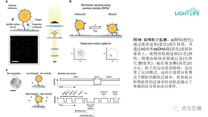 束缚粒子监测可以用于在免疫测定中监测单分子结合事件。7.无标记检测 等离子体纳米结构的排列对分析物结合非常敏感。局部表面等离子体共振(LSPR)可用于追踪等离子体纳米颗粒附近局部折射率的变化,从而与分析物的存在联系起来。例如,使用金纳米棒检测生物素和抗生物素抗体的相互作用(图20)。