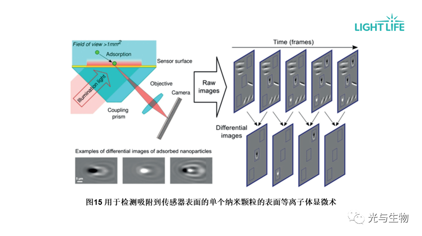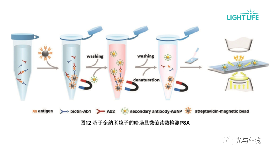 一种基于平衡态统计涨落提取亲和常数的方法。 一种基于数字适配体的检测凝血酶的方法。 共振光散射相关光谱(RLSCS)测量由于单个纳米颗粒的布朗运动而引起的小体积共振光散射的波动(图14)。已有研究用于甲胎蛋白的夹心免疫测定(LOD 1 pm)以及甲胎蛋白(LOD 100 pm)和17-b-雌二醇(LOD 10 pm)的竞争性测定。RLSCS的主要限制之一是纳米颗粒标记聚集的显著效应。表面等离子体显微镜可以实时跟踪单个等离子体纳米颗粒的吸附。开发了一种检测和量化单个纳米颗粒的宽场方法,并将其用于分析复杂样品(如葡萄酒、苹果汁和防晒霜)中的金和银纳米颗粒(图15),该方法的LOD为106 NPs/mL,工作范围为10^6–10^10 NPs/mL。使用金纳米棒作为标记在蛋白质微阵列上检测乙型肝炎病毒表面抗原(HBsAg),LOD可达到3.2 pg/ml。6.微球标记 - 采用掺铕磁珠通过时间分辨荧光(TRF)检测PSA,LOD达0.38 pg/ml;