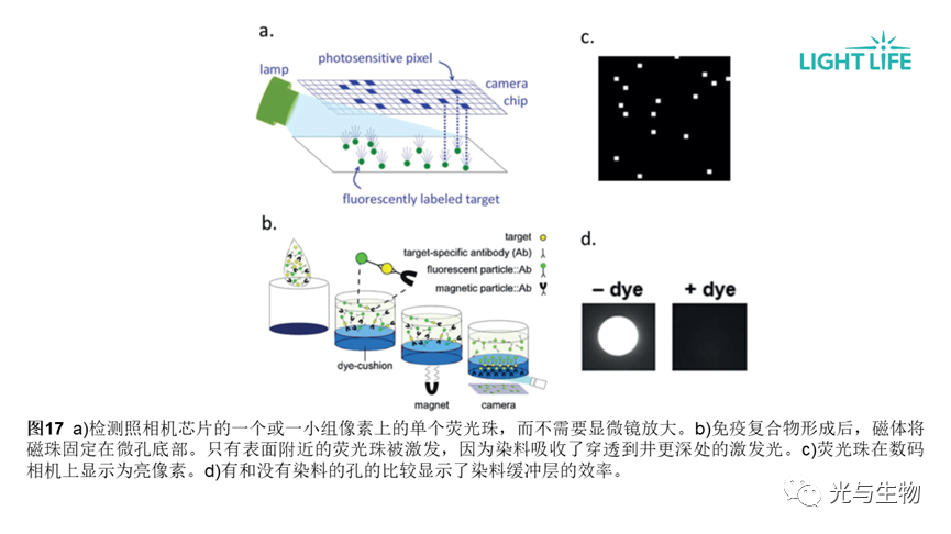 6.2 明视野显微术 - 开发了一种基于微流体的磁珠计数法,用于检测血清中的蛋白质(图18)。将磁性预浓缩步骤与微流控芯片中结合的磁珠的数字计数相结合,用于检测TNF-α,LOD达到1 fg/ml。