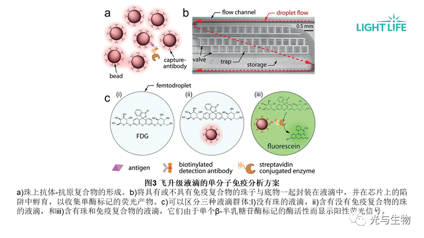 该系统检测前列腺特异性抗原(PSA)和肿瘤坏死因子-a (TNF-a)的检测限(LOD)达到了1.5 fg/mL和2.5 fg/mL。其他临床相关分析物包括癌症生物标记物、尿液生物标记物、HIV的p24蛋白、以及血液中神经丝轻链蛋白(NFL)、tau蛋白、唾液中的皮质醇小分子等。此外还可通过使用两种不同的酶/底物标记进行多重分析。基于产生油包水微滴的不同方法,乳化方法产生的微液滴往往不均匀,而微流体装置可以产生和处理更均匀的微液滴,可用于建立磁珠酶联免疫分析(图3)。LOD可达到46 fM,线性范围可达到0.046-4.62 pM。3.用于PCR扩增的DNA标记 微芯片上的微流体能够在皮升或飞升反应容器中快速分离单链DNA,随后进行PCR扩增,LOD可达到每毫升40个RNA分子。基于液滴的数字免疫PCR (ddIPCR)使用磁珠作为固体支持物,DNA作为标记物,PCR用于信号放大,较标准ELISA可将LOD降低100-10000倍(图4),但清洗步骤不易实现。数字PCR与邻位连接技术(PLA)相结合可进一步提高分析的精确度。4.荧光分子标记 单个荧光分子的检测依赖于共焦显微镜和全内反射显微镜(TIRF)。根据不同的检测形式可分为:- 用于检测增强型绿色荧光蛋白(EGFP)和肿瘤抑制蛋白p53的单分子检测(图6)