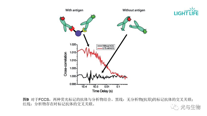 与分析物结合的带有荧光标记的抗体具有较低的电泳迁移率,在毛细管电泳中可与游离抗体区分开,通过宽视野显微镜记录。例如Erenna平台检测心肌肌钙蛋白(LOD达0.2-1.7 pg/ml)、可溶性Ab低聚物(LOD达1.56 pg/ml)、突变型亨廷顿蛋白mHTT(LOD达40 fm)、人促性腺激素卵泡刺激素(LOD达34 fm)。 - 荧光交叉相关光谱(FCCS)使用两种光谱不同的荧光探针,通过不同的激发波长同时激发,并在两个不同的通道中检测,计算互相关曲线的振幅,以测量荧光探针与分析物的相互作用(图9)。可提高定量测定的灵敏度。