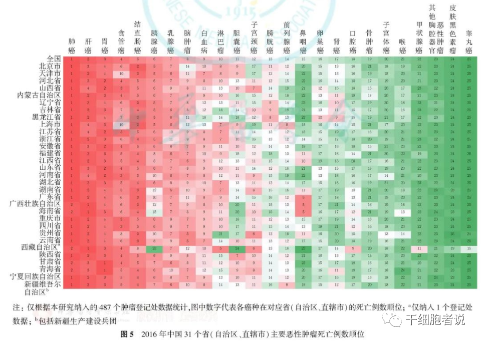 癌症报告中庞大的数据背后是一个个鲜活的生命,提高公众癌症认知,呼吁健康生活,定期体检,才能从根源上降低癌症发病率。养成良好的生活习惯,不肥胖,不熬夜,常运动,保持一个好心情!2023年3月22日,国家癌症中心在《中华肿瘤杂志》发布了最新一期的全国癌症统计数据,公布2016年中国恶性肿瘤流行数据,首次提供各省主要癌谱流行情况。全国肿瘤登记中心负责全国肿瘤登记数据收集、质量控制、汇总、分析及发布工作。(由于全国肿瘤登记中心的数据一般滞后,本次报告发布数据为全国肿瘤登记中心收集汇总全国肿瘤登记处2016年登记资料,一般会滞后3年) 结果显示,中国当前的主要恶性肿瘤包括肺癌、结直肠癌、胃癌、肝癌、女性乳腺癌等,前5位恶性肿瘤发病约占全部新发病例的57.27%。肺癌、肝癌、胃癌、结直肠癌、食管癌是主要的肿瘤死因,约占全部肿瘤死亡病例的69.25%。 -01- 各省主要恶性肿瘤发病情况 1)基本情况 2016年全国恶性肿瘤新发约406.40万,其中男性223.43万例,女性182.96万例。肺癌位居我国恶性肿瘤发病首位,2016年我国肺癌新发病例约82.81万。其他高发恶性肿瘤依次为结直肠癌、胃癌、肝癌、女性乳腺癌等,前5位恶性肿瘤发病约占全部恶性肿瘤发病的57.27%。 2)男女差异 3)城乡差异 4)各省恶性肿瘤死亡情况 年龄别肿瘤死亡率 死亡率随年龄增加而逐渐上升,在城市和农村,男性死亡率均较女性更高,但在低年龄段中,男女年龄死亡率接近。死亡率在35岁之前呈现交替上升趋势,35岁之后男性各年龄组死亡率均高于女性,且差异随年龄的增加而增大。 文末总结 目前,我国恶性肿瘤发病、死亡数持续上升。我国依旧以肺癌、肝癌、胃癌、结直肠癌和食管癌等为主。鼻咽癌在广东、广西和海南的恶性肿瘤发病居第6位,在江西和贵州也位居前10位。而前列腺癌的高发出现在北京、上海、江苏、浙江等。 城乡分析结果显示,农村的发病率略低于城市,但死亡率高于城市,说明农村死亡风险相对较高。城市以乳腺癌、结直肠癌等恶性肿瘤高发,农村以食管癌、胃癌、肝癌等消化系统肿瘤高发。在经济相对发达的地区,以肺癌、结直肠癌、乳腺癌、甲状腺癌和前列腺癌高发为主,但在经济相对落后的地区,仍然呈现消化道肿瘤如胃癌、食管癌和肝癌等恶性肿瘤高发,同时伴有结直肠癌、乳腺癌等位居前列的情况。 男性前列腺癌上升趋势明显,应当格外关注。肺癌位居我国恶性肿瘤死亡的第1位,不论男性还是女性,这可能和我国居高不下的吸烟率有关。我国当前的男性肺癌死亡约24%归因于吸烟,女性肺癌死亡约4.8%归因于吸烟。 甲状腺癌发病在天津、浙江和新疆已经上升到第2位,且主要发生在女性中。近10年来,女性甲状腺癌的发病每年增幅超过20%,可能与当前恶性肿瘤诊疗水平和居民健康意识提高有关。甲状腺癌的死亡率在过去10年来维持较低的增幅,每年增幅约1.6%,说明当前的发病增加可能与过度诊断有关。消化道肿瘤(如食管癌、胃癌和肝癌),已经显示出快速下降的趋势。因此,我国应在扩大相关肿瘤的筛查及早诊早治覆盖面、肿瘤临床诊治规范化和同质化推广应用两方面共同发力,降低我国恶性肿瘤死亡率。 总之,我国恶性肿瘤负担日益加重,城乡差异较大,地区分布不均衡,癌症防控形势严峻;发达国家和发展中国家癌谱并存,防治难度巨大。 [1]https://www.sciencedirect.com/science/article/pii/S2667005422000047 [2]https://rs.yiigle.com/CN112152202303/1450406.htm [3]《国家癌症中心发布:2022年全国癌症报告》2022.03.22 干细胞者说. |