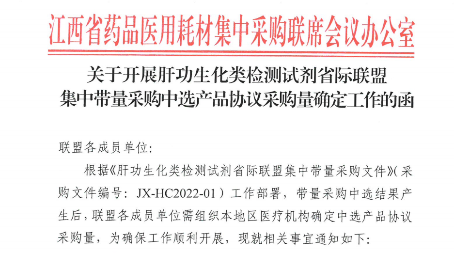 从公布的文件来看,大家的描述基本相同,就是在原来报量的基础上,根据此次肝功集采中选厂家产品的排名,按照《肝功生化类检测试剂省际联盟集中带量采购文件JX-HC2022-01》约定的规则,进行分量确认,签订供货协议。