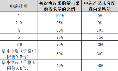 第一步:按中选排名确定初次协议采购量,初次协议采购量占采购需求的比例见下表。根据医疗机构的采购需求量,四舍五入取整,计算各品种各企业的初次协议采购量。初次分配协议采购量(固定量),根据医疗机构的采购需求量和企业中选排名,由系统自动计算,为固定量,不可调整。