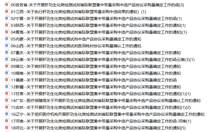 江西医保局向联盟成员单位发布通知后,各联盟成员单位省份,也开始发布各自省份的肝功生化类检测试剂省际联盟集中带量采购中选产品协议采购量确定工作的通知。截止目前为止,已经公布的18个省份:江西省、山西省、内蒙古自治区、湖北省、重庆市、云南省、山西省、青海省、宁夏回族自治区、湖南省、福建省、新疆维吾尔自治区、吉林省、广东省、甘肃省、辽宁省、河南省、河北省