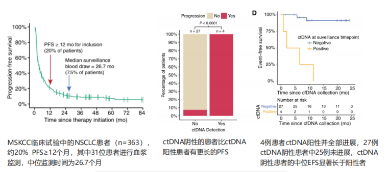 该研究证明,靶向治疗第8周经MRE评估EGFR清除的患者具有更长的PFS及OS。 另外,一项奥希替尼治疗72例EGFR T790M阳性IIIB-IV期NSCLC患者4,显示靶向治疗第6周MRE清除的患者具有更长的PFS及OS。 图注:在奥希替尼治疗第6周ctDNA清除与更好的PFS (12.5 vs. 5.8 months, P=0.022) 和OS (NR vs. 13.1 months, P=0.009) 有关。 进一步患者精细化分层: 另外,MRE也可在免疫治疗第6周筛选出OS更长的SD患者。 图注:C:C3D1的ctDNA 水平在LOD检测限以下的患者OS更长 (<1 MTM/mL, ctDNA 低风险)(精确P值为0.00029871)。D、E:治疗第6周的SD及PR患者通过C3D1进一步分层,ctDNA低风险患者OS更长。 而且在靶向治疗中,有研究提示MRE与RECIST结合可以更精准评估EGFR突变型NSCLC(尤其是SD患者)的治疗疗效6。 图注:靶向+化疗治疗8周时,与未清除相比,ctDNA清除的SD患者mPFS (16mon vs 10mon)和mOS(NR vs 10mon)延长。 29个PD黑色素瘤患者(20个真PD+9个假进展)进行ctDNA动态监测(从基线到治疗12周)7,显示MRE也可以进一步区分哪些患者是“真进展”,哪些患者是“假进展”,“ctDNA分子应答”型来预测真进展的灵敏度是90%,特异性为100%! 早期提示进展风险: MSKCC临床试验中的NSCLC患者(n=363)8,约20% PFS≥12个月,其中31位患者进行血浆监测,中位监测时间为26.7个月。研究表明,MRE阳性的免疫治疗获益患者具有进展风险,4例患者ctDNA阳性并全部进展,27例ctDNA阴性患者中25例未进展,ctDNA阴性患者的中位EFS显著长于阳性者。 同样在靶向治疗中,研究提示MRE变化早于影像学,可通过MRE升高的靶向治疗患者具有进展风险9。 在TATIN 2线队列(n=23)10,19例PD患者中有13例(68%)在影像学PD前或同时检测到原发性EGFR驱动基因升高: