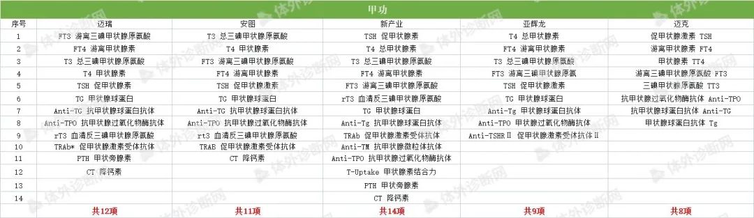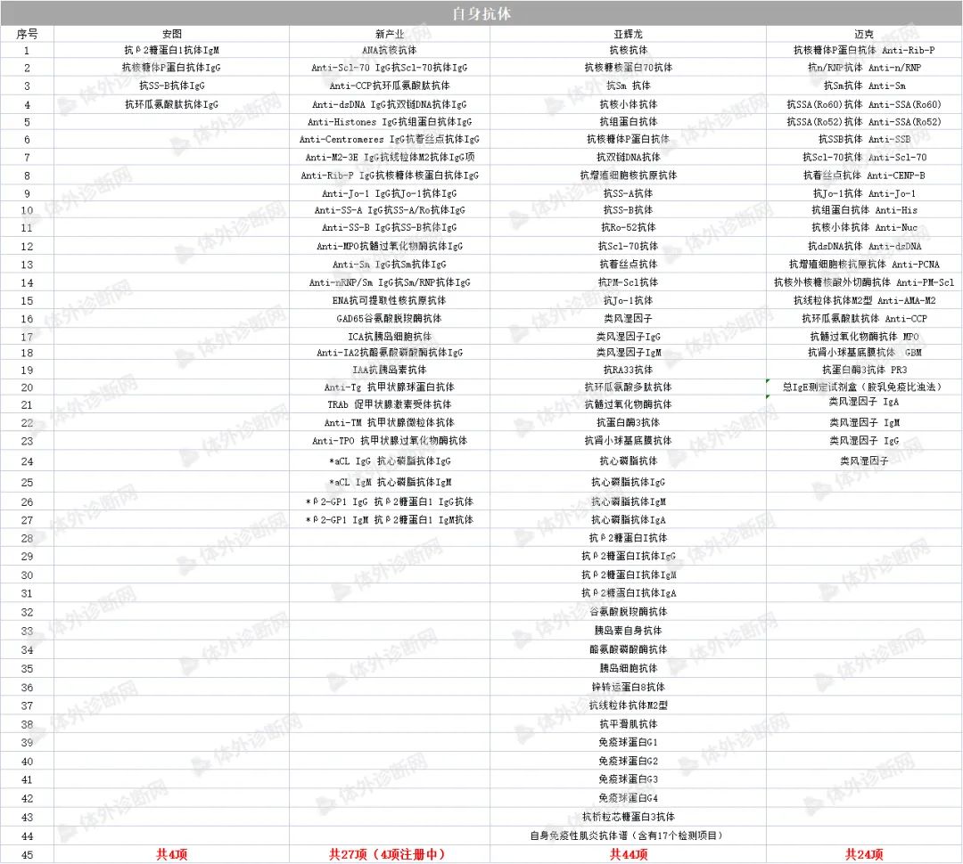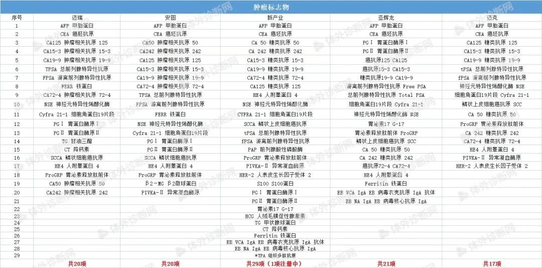 肿瘤标志物新产业获证最多,为29项(1项注册中) 性激素新产业获证最多,为17项 甲功新产业获证最多,为14项 贫血新产业、亚辉龙获证最多,为5项 骨代谢&糖代谢新产业获证最多,为17项 感染安图获证最多,为16项 心肌标志物新产业获证最多,为16项 传染性疾病安图获证最多,为17项 自身抗体亚辉龙获证最多,为44项 整体来看,化学发光九大项目中,新产业获证项目数量位居榜首,为150项(15项注册中)。如有遗漏,欢迎留言,我们将随时进行补充! 化学发光免疫分析技术是将具有高灵敏度的化学发光测定技术与高特异性的免疫反应相结合,用于各种抗原、半抗原、抗体、激素、酶、脂肪酸、维生素和药物等的检测分析技术。是继放免分析、酶免分析、荧光免疫分析和时间分辨荧光免疫分析之后发展起来的一项最新免疫测定技术,具有灵敏度高、检测快速、试剂稳定无生物毒性、易全自动等特点,成为免疫分析技术中最具发展前景的发光之一,在许多疾病的临床诊断中具有重大意义。 化学发光免疫分析法以标记方法的不同而分为两种: (1)化学发光标记免疫分析法 (2)酶标记、以化学发光底物作信号试剂的化学发光酶免疫分析法 国内发光大部分市场仍被进口品牌占据,《医药器械蓝皮书》显示,罗氏、雅培、贝克曼以及西门子为代表的进口品牌占据超过80%的市场份额,罗氏在化学发光诊断市场的占有率最高,达到35.5%。 可见,国产品牌想要在这一领域实现超越可谓是困难重重,但更大的挑战也意味着更大的机会。 第一,国内化学发光领域并未出现具有绝对垄断优势的头部企业; 第二,随着中国体外诊断行业的蓬勃发展和国产替代化浪潮的兴起,国产品牌的市场认可度、产品性价比都在不断提高; 第三,化学发光诊断项目众多,每一个细分项目所占份额十分接近,处于快速发展阶段,对想要进入这一领域的企业来说,有很大的发展空间。 图源:IVD Daily 因此,研发能力、技术水平与性价比兼备的企业,仍可以在这条黄金赛道上找到一席之地。 目前国内已有超过200家生产厂家获得化学发光注册证,上百家IVD企业也竞相涌入化学发光领域,根据国内的市场需求及时调整产品策略,竞争异常激烈。其中,被誉为“化学发光五虎”的迈瑞、安图,新产业、亚辉龙,迈克表现出强劲的实力和竞争力。 如有遗漏,欢迎留言,我们将随时进行补充! 发光五虎在肿瘤标志物领域的获证情况呈现百花齐放态势,各家获证数量差距不大。 AFP、CEA、CA125、CA15-3、CA19-9、TPSA、FPSA、CA72-4、NSE、CYFRA 21-1、HE4、ProGRP、CA50、CA242基本各家都有;胃蛋白酶原ⅠPGⅠ、胃蛋白酶原ⅡPGⅡ、铁蛋白FERR目前迈瑞、安图、新产业、亚辉龙获证;PIVKA-Ⅱ 异常凝血酶原只有安图、新产业、迈克获证。 癌症一直是我国最大的民生健康问题之一。福建省医保局于去年年末带头将临床必需的肿瘤检测项目纳入医保,报销比例高达90%,体现了国家对肿瘤早筛的重视。在刚刚结束的上海肿瘤标志物大会上,与会专家也纷纷表示,肿瘤标志物技术目前虽然有了量的改变,但是仍任重而道远,早诊早筛仍有巨大发展空间。 未来,肿瘤标志物领域仍会是各大企业竞相争夺的化学发光市场,除了在“量”上的完善,更为重要的应该是“质”上的比拼了。 LH 促黄体生成素、PROG 孕酮、E2 雌二醇、AMH 抗缪勒氏管激素、人绒毛膜促性腺激素、泌乳素基本各家都有,在获证数量上,新产业、亚辉龙较多,分别为17项和16项,迈瑞12项,安图11项,迈克11项。 甲功方面,新产业获证最多,为14项。 FT4 游离甲状腺素、FT3 游离三碘甲状腺原氨酸、TG 甲状腺球蛋白、Anti-TG 抗甲状腺球蛋白抗体、Anti-TPO 抗甲状腺过氧化物酶抗体等常规标志物基本各家都有;PTH甲状旁腺素目前只有迈瑞、新产业获证。 贫血领域各家的铁蛋白试剂均获证,整体数量较少。 代谢领域,新产业发力最为强劲,获证项目有17项,骨代谢与糖代谢基本持平。 安图在感染领域获证数量最多,为16项。PCT降钙素原最受企业青睐。 心标市场向来是IVD企业竞相争夺的领地。新冠疫情发生以来,多项研究证实心肌损伤标志物的升高广泛存在于COVID-19感染者中,为迅速占领市场高地,把握后疫情红利,发光五虎对心肌标志物也是极为重视。 目前来看,新产业在心肌标志物领域一骑绝尘,获证项目有16项,其余四家在获证数量上差距不大。 传染性疾病一直是全球面临的最严重的公共卫生问题之一。在该领域,安图项目最多,为17项(新产业18项,但有7项为注册中)。结核感染目前只有安图和迈克获证。 除了各家争相竞逐的第一大领域——肿标,最为大火的应该就是自身抗体。目前亚辉龙在该领域有44项产品获证,新产业也不甘示弱,拥有27个项目(4项注册中),迈克、安图紧随其后。 当前,自身抗体的检测已经成为临床常规检测项目,据头豹研究院数据显示,自身抗体检测市场规模呈现逐年上升的态势,预计2023年市场规模可达22.3亿元人民币。这一前景巨大的蓝海市场正在吸引各IVD新老玩家加速入局,强势分羹。 图源:头豹研究院 今年两会期间,国家重点提到要强化基层卫生体系建设,部分地区已经响应号召加快推动县域医疗次中心建设,完善医疗设备配置,全自动化学发光仪器未来将会成为乡镇卫生院标配,这也是向IVD企业释放出的巨大信号,化学发光领域仍有巨大的市场缺口。 通观目前发光五小龙的化学发光试剂菜单,可以看到在品类