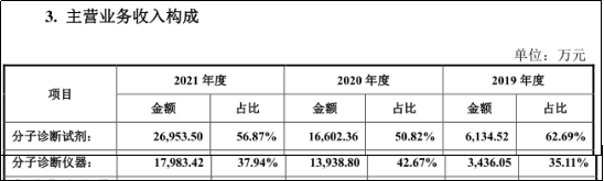 我们来看看收入结构,2019~2021年分子诊断试剂的销售额分别为0.61亿元、1.66亿元和2.69亿元,占总营收比分别为62.69%、50.82%和56.87%,成为第一大构成部分。诊断仪器的销售额分别为0.34亿元、1.39亿元和1.79亿元,占总营收比分别为35.11%、42.67%和37.94%。