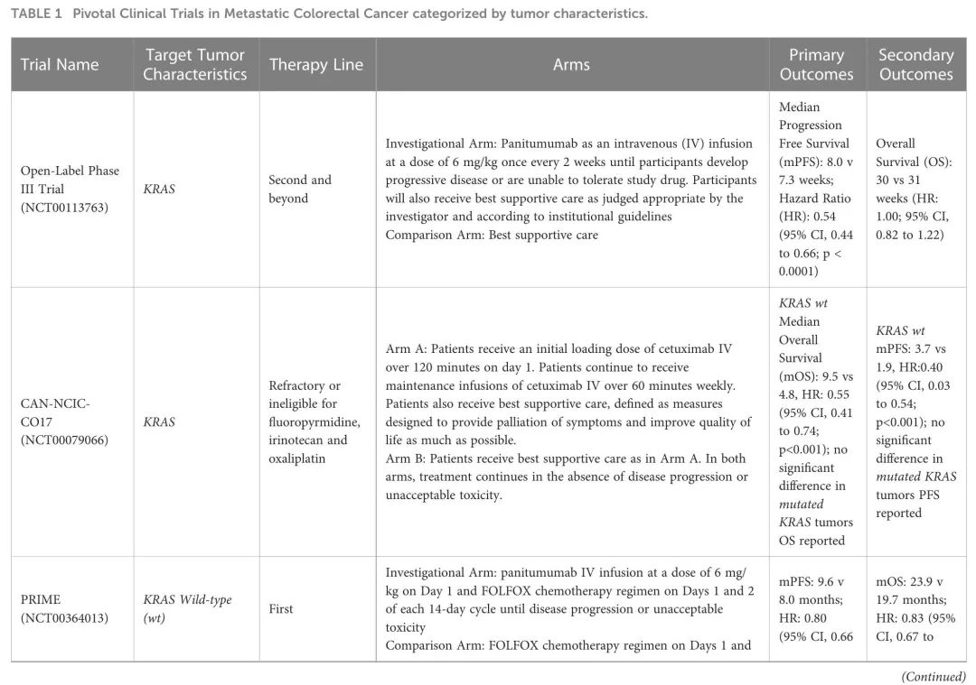 结直肠癌每年导至全球数十万患者死亡,预计未来二十年发病率将上升。对于转移性患者,细胞毒性药物治疗选择仍然有限,生存率提升甚微。因此,重点已转向识别结直肠癌突变和开发靶向药物。本文基于转移性结直肠癌分子变异,回顾了最新治疗进展。 研究背景 在美国,结直肠癌(CRC)发病率和死亡率仍然较高,仅2023年,估计就有153000例新诊断病例和超过52000例死亡病例。近四分之一的患者在出现症状时已发生转移(mCRC),而另外20%的患者最初诊断为局部疾病,随后进展为IV期疾病。IV期疾病预示着预后很差,估计5年生存率仅为14%。虽然在过去几十年中,美国和全球所有分期的CRC生存率都有所提高,但mCRC生存率保持稳定,没有显著进展。因此,广泛了解mCRC的分子谱以及开发相关靶点,对于治疗进展和改善患者预后非常重要。本综述基于mCRC分子特征,回顾了最新的试验数据,有助于改善治疗选择。 EGFR抑制剂 EGFR在细胞信号通路中的作用及EGFR抑制剂 许多已知的人类肿瘤的繁殖是由表皮生长因子受体(EGFR)及随后的信号通路激活驱动的。激活配体与EGFR结合导至EGFR酪氨酸激酶磷酸化,触发参与细胞增殖和代谢的下游信号通路。EGFR涉及多条通路,包括磷脂酰肌醇3激酶(PI3K)/Akt/哺乳动物雷帕霉素靶标(mTOR)通路以及RAS/RAF/丝裂原活化蛋白激酶(MAPK)通路。这些通路的激活或失调或敏感反馈环的不平衡导至促进细胞存活、抗细胞凋亡、增殖、血管生成和转移潜力的基因转录。 西妥昔单抗和帕尼单抗是针对EGFR的单克隆抗体,用于治疗转移性结肠癌。西妥昔单抗是一种嵌合型IgG-1单克隆抗体,而帕尼单抗是一种重组人源化IgG-2κ型单克隆抗体,两者都可竞争性抑制EGFR细胞外配体,限制上述导至肿瘤发生的异常细胞信号通路。两者疗效相似,西妥昔单抗更容易导至过敏反应,风险比约为5.47。这种过敏反应可能继发于先前开发的针对西妥昔单抗重链Fab部分存在的半乳糖-α-1,3-半乳糖的IgE抗体。这种预先存在的IgE抗体在美国东南部较常见,被认为与区域暴露有关。 RAS突变状态与EGFR抑制剂疗效 在mCRC中,编码参与EGFR介导的细胞信号通路的蛋白的基因(特别是KRAS,NRAS和BRAF)突变与抗EGFR治疗缺乏反应有关。RAS基因家族突变导至蛋白表达,造成RAS/RAF/MAPK信号通路的不适当组成性激活,不太可能受到上游EGFR与激活配体相互作用受到抑制的影响。因此,检测这些突变非常重要,使这些突变携带者不进行无效治疗,避免潜在严重毒性和费用。 2008年,一项研究首次评估了EGFR抑制剂在mCRC中的应用,比较了西妥昔单抗与最佳支持治疗(表1)。作者发现,接受西妥昔单抗治疗的KRAS野生型肿瘤患者OS显著改善(9.5 vs 4.8个月; HR 0.55; 95% CI 0.41-0.74),而KRAS突变肿瘤患者的OS或PFS没有差异(表1)。随后有研究探索了EGFR抑制剂与细胞毒性化疗联用。 表1. 转移性结直肠癌关键临床试验,按肿瘤特征分类 一项分析回顾了三项随机对照试验,比较了mCRC患者各治疗阶段化疗或最佳支持治疗联合或不联合帕尼单抗治疗的结局,得出的结论是,KRAS突变mCRC患者不太可能从EGFR抑制剂中获益(表1)。同样,CRYSTAL试验中,未经治疗的mCRC患者随机接受FOLFIRI联合或不联合西妥昔单抗治疗,亚组分析发现,与仅接受FOLFIRI治疗的患者相比,接受FOLFIRI和西妥昔单抗治疗的KRAS外显子2野生型肿瘤患者的中位PFS更长(9.9 vs 8.7个月; HR 0.68; 95% CI 0.50–0.94; p = 0.02)。对CRYSTAL试验数据的更新分析显示,接受西妥昔单抗治疗的患者总生存期(OS)更长(23.5 vs 20.0个月; p = 0.009),这种优势主要来自于RAS野生型肿瘤患者(HR 0.69; 95% CI 0.54-0.88)。RAS突变肿瘤患者未实现生存获益(1.05; 95% CI 0.86-1.28)。在III期PRIME试验中也观察到了类似的情况,该试验比较了FOLFOX联合或不联合帕尼单抗用于未经治疗的mCRC患者的疗效(表1)。接受FOLFOX加帕尼单抗的KRAS和NRAS野生型mCRC患者PFS(HR 0.72; 95% CI 0.58-0.90; p = 0.004)和OS(HR 0.77; 95% CI 0.64-0.94; p = 0.009)改善。重要的是,KRAS/NRAS突变患者PFS较差。这些结果反映了当前的临床实践,RAS野生型肿瘤患者采用抗EGFR治疗,而RAS突变肿瘤患者避免这类治疗,因为缺乏疗效或可能导至更糟糕的结果。图1展示了基于突变状态的推荐治疗方案。 图1. 转移性结直肠癌基于肿瘤突变状态的治疗方案流程图 原发性肿瘤位于哪一侧与EGFR抑制剂疗效 EGFR抑制剂疗效与原发性结肠肿瘤位于哪一侧相关。这被认为是肿瘤位于哪一侧替代不同累积分子亚型的结果。 一项多中心分析纳入了75 例RAS 和 BRAF 野生型mCRC患者,这些患者接受了西妥昔单抗单药,帕尼单抗单药或伊立替康加西妥昔单抗(任何治疗阶段)治疗,分析发现,右侧原发性肿瘤患者未观察到缓解,而左侧原发性肿瘤患者的缓解率为 41%(p = 0.003)。左侧肿瘤患者的无进展生存期(PFS)(2.3 vs 6.6个月)也更长(HR 3.97; 95% CI 2.09–7.53; p < 0.0001)。 对具有里程碑意义的CRC试验进行回顾性分析,也发现了这一现象。在上面提到的患者随机分配接受FOLFIRI加西妥昔单抗或仅FOLFIRI治疗的CRYSTAL试验中,以及在比较FOLFIRI加西妥昔单抗与FOLFIRI加贝伐珠单抗的FIRE-3试验中,加用西妥昔单抗的RAS野生型左侧肿瘤患者客观缓解率(ORR)、PFS和OS较优,而右侧野生型肿瘤疗效甚微(表1)。CALGB/SWOG 80405显示,右侧CRC预后较差,此外,在接受西妥昔单抗联合化疗时,KRAS野生型右侧肿瘤相比KRAS野生型左侧肿瘤,中位OS明显更差(16.7个月(95% CI 13.1-19.4)vs 36个月(95% CI 32.6-40.3))(表1)。