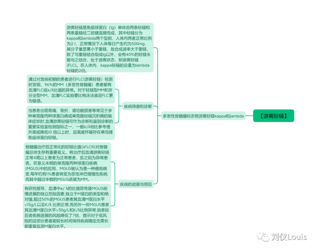 【游离轻链】 多发性骨髓瘤标志物游离轻链kappa和lambda 游离轻链是免疫球蛋白(Ig)单体由两条轻链和两条重链经二硫键连接而成,其中轻链分为kappa和lambda两个型别,人体内两者正常比例为2:1,正常情况下人体每日产生约为500mg,其分子量显著小于重链,故合成速率大于重链,除了与重链结合组成Ig以外,会有40%的轻链未能与之结合,处于游离状态,即游离轻链(FLC)。在人体内,kappa轻链的总量为lambda轻链的2倍。 疾病筛查和诊断 通过对发病初期的患者进行FLC(游离轻链)检测时发现,96%的MM(多发性骨髓瘤)患者都有血清FLC或κ/λ比值的异常。对于轻链型MM和非分泌型MM,血清FLC实验要比电泳法鉴定FLC更为敏感。 当患者出现骨痛、骨折、肾功能损害等常见于多种单克隆丙种球蛋白病或单克隆轻链沉积病的临床症状时,血清游离轻链可作为诊断和鉴别诊断的重要实验室检测指标之一,一般k/λ相比参考值升高或降低10 倍以上时,应高度怀疑存在单克隆免疫球蛋白轻链。 疾病的进展与预后 骨髓瘤治疗后正常化的轻链比值(sFLCR)对骨髓瘤总体生存有重要意义。将治疗后血清游离轻链正常4周以上患者为正常患者,反之则为异常患者。在意义未明的单克隆丙种球蛋白疾病(MGUS)中的应用,MGUS被认为是一种癌前病变,每年约有1%患者转变为恶性淋巴增殖性疾病,而其中超过半数的MGUS进展为MM。 有研究报导,血清中κ/ λ的比值异常是MGUS病情进展的独立危险因素,独立于M蛋白的类型和绝对值,超过50%的MGUS患者其血清M蛋白水平<15g/L以及K/λ 比例正常,而另外一些MGUS患者其血清M蛋白水平>30g/L和K/λ比例异常,前者较后者疾病进展的风险降低了7倍,提示对于低风险的这部分患者能较长时间保持疾病稳定无需长期重复监测M蛋白水平。