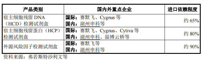 湖州申科生物产品包括标准化试剂盒,用于检测检测生物制品中残留 DNA/RNA/蛋白质、工艺添加物、降解产物等杂质。 公司基于DNA/RNA 残留检测技术平台、微生物快检技术开发平台、生物制品样本前处理技术平台、HCP 多克隆抗体制备及覆盖率分析评估平台等技术平台,多款产品为最早实现商业化的国产自研产品之一。 2022 年,中国生物制品质量控制解决方案市场规模达到149.9 亿元,目前在中国国内,进口产品占据了宿主细胞残留 DNA(HCD)检测试剂盒市场份额的约65%;对于宿主细胞残留蛋白(HCP)检测试剂盒,进口产品则占比约80%以上;国产产品市场占比近年来有显著提升。目前湖州申科稳居该领域国产市场地位第一。 |