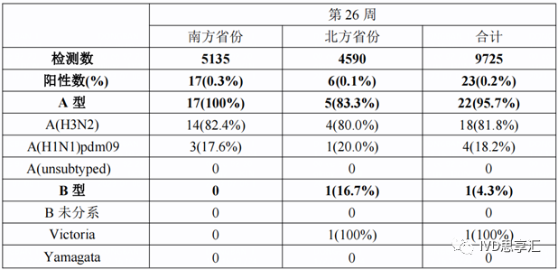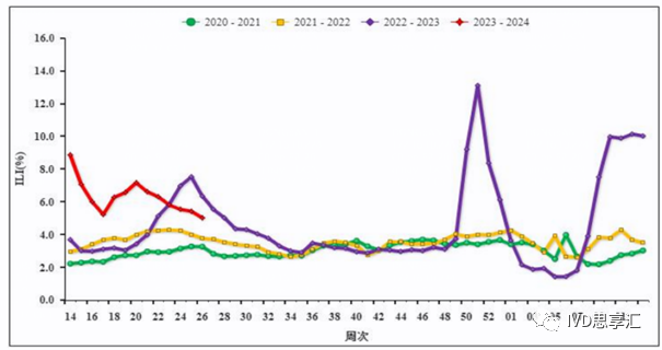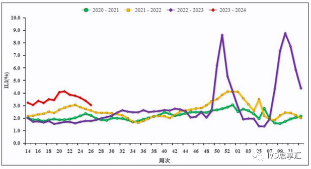 2023年第26周,北方省份哨点医院报告的ILI%3.1%,低于前一周水平(3.4%),高于2020~2022年同期水平(2.2%2.6%1.8%)。