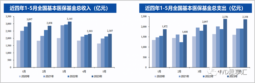 疫情防控之下2020年~2022年诊疗相对疲软,推动医保结余不断创历史新高,但医保支出降速亦使下游企业业绩增长承压。伴随外部因素扰动消除,1-5M23医保支出同比+24%(收入同比+8%),居民诊疗强劲复苏。