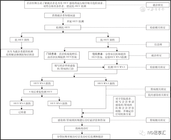 要点4:戊型肝炎院内会诊和转诊流程。-HEV结果阴性可基本排除HEV感染。如果患者出现抗HEVIgM阳性,应及时信息反馈给就诊临床科室,建议患者进行HEVRNA检测并前往肝病及感染相关科室会诊,适时转诊。