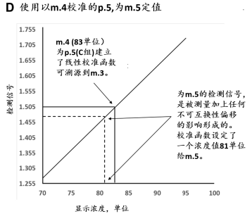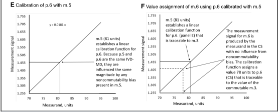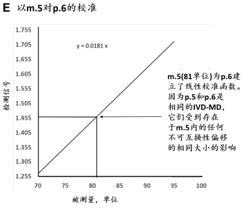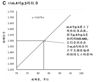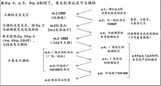 若可能,可要求替代一个有证参考物质(CRM),它与该组CS处于m.3位置的是可互换的,使得IVD-MD厂商在实施计量溯源性较早,并较少的费用。同于m.3位置的CRM,为二级CRM,有别于在m.1位置的一级(纯物质)CRM。二级m.3 CRM经常具有的基质类似于CS,促使与未改变的CS具有互换性。为该被测量的可互换的m.3 CRM,由国家计量研究院产生,预期被用于所有IVD厂商,作为它们各自的内部基质等级,去实现为CS在许多不同厂商IVD-MD对某个可用被测量的等同结果。一个可互换的m.3 CRM被预期尽可能相似于CS的反应特性(不存在干扰物质或其他对被使用IVD-MD特定影响)以至于对任何厂商的终端用户IVD-MD检测检测值,没有显著的与基质有关的不可互换的偏移被添加到被任何厂商的终端用户IVD-MD检测的最后值。一个二级m.3 CRM与CS与某个给定组IVD-MD为可互换被接受的,当不可互换性偏移小于预定限值,与被测量要求一致且适合用于医疗决策(5-7)。这样的二级CRM是,它与CS在所有终端用户IVD-MD是可互换的,它被预期被用作共同的校准品(1,5)。若某个m.3 CRM与CS是可互换的,用于许多IVD-MD,但有一个或少数IVD-MD,与CS是不可互换的,它有可能在某个受影响的终端用户IVD-MD的校准等级中加入一个不可互换性的偏移的纠正(8)。纠正步骤可以在校准等级任何有意义positioned确定位置中,包括在用于p.6的终端用户IVD-MD的校准算法。