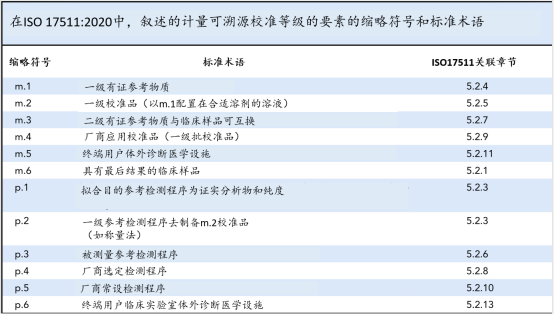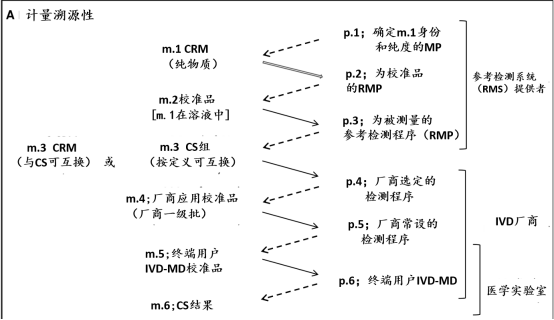 计量溯源性到较高等级的参考系统组分。使得在不同时间和地点,和不同终端用户IVD-MD间得到一致的校准等级。ISO 17511:2020叙述了校准等级的示例,说明溯源性到SI和较高等级的参考系统组分是可能的,其他情况仅为可用的技术方式,是校准等级没有包括较高等级RM和/或检测程序(MP),作为厂商选定的指定RM(1)