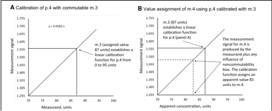 一个 “完整”计量溯源性到SI,如在ISO 17511:2020,5.2内叙述的,被展现在图1A。被广泛接受的做法是,使用一组真实CS(m.3),将一个p.3 RMP的值转换到m.4和/或p.6终端用户IVD-MD,对于m.3 RM去用于临床实验室为CS(m.6)确定值。按照定义一组真实CS被接受为可互换的,以及被选定的CS组在制备和储存中没有变化,该组没有包括具有干扰物质或其他标本-特定的已知影响的CS,会不利地影响p.4 MP的性能,其中该组CS被用于进行校准(5)。作为p.5常设MP的校准品的功能,m.4厂商的应用校准品(一级批校准品),通常由IVD-MD厂商制备,应是稳定和可用许多年,去支持未来正在序列批的m.5终端用户IVD-MD校准品设定值(该校准品一年内有多批)。使用m.4应用校准品,替代了m.3一组CS。去校准p.5常设MP,为此节省了连续的、设定值、和保持CS组等的费用。