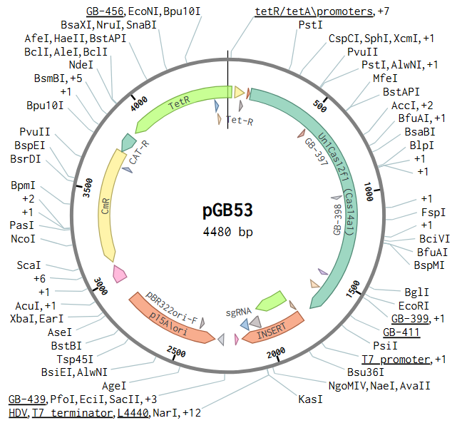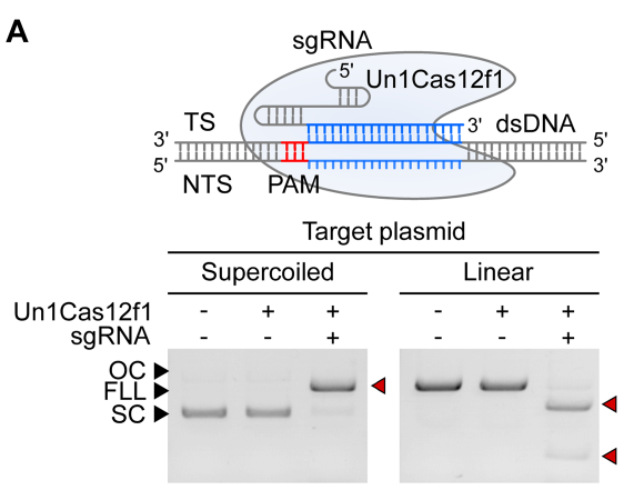 Virginijus Siksnys团队2020年在《Nucleic Acids Research》发表的文章PAM recognition by miniature CRISPR–Cas12f nucleases triggers programmable double-stranded DNA target cleavage[1]。文章表明,Cas12f(旧称Cas14)不但能够靶向ssDNA[2],而且也具有PAM依赖性靶向dsDNA的活性。这与前期Jennifer Doudna团队发现Cas12f只能切割靶标ssDNA的结论不同[2]。因此,Siksnys的工作不仅修正了我们之前对于Cas14家族切割靶标的认知,更为Cas14家族的使用提供了更广阔的前景。 大家熟悉的Cas9、Cas12、Cas13蛋白,它们的分子量都偏大,这对于将该系统递送入细胞是不利的,这可能会限制它们的某些应用。而该文所研究的Cas12f蛋白的分子量则普遍只有400~700 AA,几乎是最小的Cas9或Cas12蛋白的一半。 与Cas12a蛋白的比较可以发现,Cas12f主要差异位于蛋白的N端,Cas12f蛋白的N端明显要短了许多(图1)。由于这一差异,先前的研究认为其可能是V型CRISPR/Cas系统进化的残留物或中间体,可识别和剪切ssDNA,而不具备识别和剪切dsDNA的能力[2]。 图1.Cas14在蛋白N端比Cas9与Cas12短很多[1] 研究者使用了之前报道的方法[4]来寻找Cas12f所对应的PAM序列。他们首先构建了一个含7-bp随机PAM的质粒文库(图2),靶标的spacer长度取决于这些Cas12f系统在各自菌株中观察到的平均长度。接着,他们体外转录并纯化了这些Cas12f的sgRNA,sgRNA中的spacer长度暂定为20 nt。然后,他们在大肠杆菌中表达各种Cas12f蛋白,收菌后在含PMSF的lysis buffer中超声裂解,直接取裂解产物的上清,加入RNase抑制剂与纯化后的相应sgRNA,得到Cas12f/sgRNA复合体。 下一步,该复合体被直接用于剪切随机PAM文库,剪切完成后的双链DNA为粘性末端。接下来,为了测序,要先用T4 DNA聚合酶补齐为平末端,再用Taq酶对3′端进行了加A处理,去除RNA并纯化后,将加A产物与3′-dT的双链DNA接头进行连接,之后即可进行PCR扩增并测序得到这些剪切产物中的PAM。最后,研究者们就得到了各种不同Cas12f对PAM的偏好(图3)。结果表明,大多数Cas12f偏好富T的5′-PAM序列。 图3.不同Cas12f蛋白识别和剪切dsDNA的PAM序列偏好[1] 确定了这些Cas12f的PAM偏好后,研究者又进一步以纯化的Un1Cas12f1蛋白为对象,探索了其dsDNA剪切的最佳反应条件。结果表明,Un1Cas12f1是一种Mg2+依赖性的核酸内切酶,在低盐浓度(5-25 mM)下功能最佳,在∼37-50℃的宽温度范围内具有活性,最佳温度为∼46℃,sgRNA的最佳spacer长度为~20 nt。在此优化的反应条件下,Un1Cas12f1能够将超螺旋质粒DNA完全转化为线性形式(图4)。突变失活两处RuvC活性位点会消除这种剪切活性,证实了RuvC结构域对于这一剪切活性至关重要(图5)。 图4. 最佳反应条件下,Un1Cas12f1能够将超螺旋质粒完全转化为线性形式[1] 图5. Un1Cas12f1对dsDNA的剪切需要依赖RuvC结构域[1] 他们首先在大肠杆菌中转入了一个质粒,该质粒可以表达Cas12f蛋白以及T7转录相应的sgRNA。接着,在该能够产生Cas12f与sgRNA的大肠杆菌中,通过电转化引入携带靶标序列的低拷贝质粒。最后,将这些细胞10倍梯度稀释后生长于含有诱导剂与抗生素的平板上。 图6.能表达Un1Cas12f1与转录sgRNA的质粒[1] 实验结果令人意外,大部分的Cas12f并没能干扰低拷贝靶标质粒的进入,与对照组的生长情况没有肉眼可见的区别(仅AsCas12f1与SpCas12f1产生了显著的质粒干扰)。不过,这与先前的一项研究结果是一致的——Un1Cas12f1不能耗尽大肠杆菌中的PAM质粒文库,这也可能是它没有被检测到PAM依赖性的dsDNA剪切活性的原因之一。作者在文中也没有对这一现象做进一步的推测(图7)。 图7.大部分Cas12f不能在大肠杆菌中产生显著的质粒干扰[1] 参考文献: [1].Karvelis T, Bigelyte G, Young JK, Hou Z, Zedaveinyte R, Budre K, Paulraj S, Djukanovic V, Gasior S, Silanskas A, Venclovas Č, Siksnys V. PAM recognition by miniature CRISPR-Cas12f nucleases triggers programmable double-stranded DNA target cleavage. Nucleic Acids Res. 2020 May 21;48(9):5016-5023. doi: 10.1093/nar/gkaa208. PMID: 32246713; PMCID: PMC7229846. [2].Harrington LB, Burstein D, Chen JS, Paez-Espino D, Ma E, Witte IP, Cofsky JC, Kyrpides NC, Banfield JF, Doudna JA. Programmed DNA destruction by miniature CRISPR-Cas14 enzymes. Science. 2018 Nov 16;362(6416):839-842. doi: 10.1126/science.aav4294. Epub 2018 Oct 18. PMID: 30337455; PMCID: PMC6659742. [3].Makarova KS, Wolf YI, Iranzo J, Shmakov SA, Alkhnbashi OS, Brouns SJJ, Charpentier E, Cheng D, Haft DH, Horvath P, Moineau S, Mojica FJM, Scott D, Shah SA, Siksnys V, Terns MP, Venclovas Č, White MF, Yakunin AF, Yan W, Zhang F, Garrett RA, Backofen R, van der Oost J, Barrangou R, Koonin EV. Evolutionary classification of CRISPR-Cas systems: a burst of class 2 and derived variants. Nat Rev Microbiol. 2020 Feb;18(2):67-83. doi: 10.1038/s41579-019-0299-x. Epub 2019 Dec 19. PMID: 31857715; PMCID: PMC8905525. |