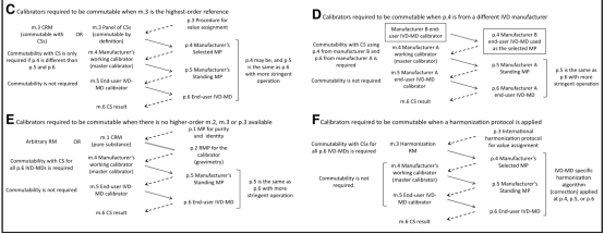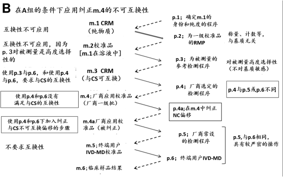 在计量上可溯源的校准等级中 哪个校准品必须与临床样品是可互换的 接上文 图3、(A)组为p.4是与p.5和p.6不同的MP(它们的每一个是相同IVD-MD的示例)下,校准品必须与临床样品是可互换的校准等级。(B)组为没有满足m.4互换性的要求下,将纠正不可互换性偏移的步骤添加到校准等级。步骤p.4a是纠正程序,应用在为m.4定值,去实现m.4a新的定值,再用于校准p.5。(C)组为加注的校准等级,说明校准品必须与临床样品是可互换的,m.3 CRM或CS组是最高等级参考系统的组分。(D)组为加注的校准等级,说明校准品必须与临床样品是可互换的,在p.4选定MP是不同厂商的终端用户IVD-MD,没有其他较高等级参考系统组分可用。(E)组为加注的校准等级,说明校准品必须与临床样品是可互换的,在较高等级纯物质CRM或含有被测量的指定RM,是添加了适当基质形成了m.4应用校准品,没有其他较高等级参考系统组分可用。(F)组为加注的校准等级,说明校准品必须与临床样品是可互换的,而一致性方案是可用的最高等级参考系统组分。所有符号和箭头参见图1。NC为不可互换性。 (注:上面的各个图,我也已经全部放大在下面翻译。冯) 左右滑动,查看更多 在p.4,p.5和p.6均为相同厂商生产的相同IVD-MD的情况 图1B展现了计量溯源性到某个m.1纯物质CRM,在校准等级中的RM必须与CS在MP情况下时可互换的。m.1 CRM是纯物质RM,它与互换性没有关系。为被测量的p.3 RMP的p.3 RMP的m.2 校准品,由m.1 CRM制备。对很好指定(设计)的p.3 RMP应用,经典地不需要与CS的互换性,在m.2的一级校准品基质和m.3 CRM基质二者具有高度的选择性。某个p.3 RMP的性能特性,应不受被检测样品的基质的影响,理想地,应依从ISO 15193的要求(见ISO 17511:2020, ),对者m.2中的被测量是高度选择的(1,3)。 在图1,B中,p.4厂商选定MP、p.5厂商常设MP、和p.6终端用户IVD-MD,是由厂商产生的相同IVD-MD的所有示例。在用于p.4和p.5角色中,IVD-MD典型地以对关键检测系统要素增加了重复检测,如校准品(如,在加到每一个重复检测中的不同瓶数或分样)、CS、和仪器(如,分析仪相同型号台数和/或版本),较按照在p.6终端用户IVD-MD使用说明的要多。使用这些更严密的操作条件,去减少为m.4和m.5校准品定值的检测不确定度。使用相同IVD-MD作为p.4、p.5、和p.6,是IVD-MD厂商的惯例。在这些情况下,在使用p.6的终端用户IVD-MD检测时,要求m,3 CRM与CS可互换,理想地,CRM预期被作为所有厂商IVD-MD的共同校准品。注意,在较早讨论的纠正可能性,若需要,某个特定终端用户IVD-MD,对CRM与CS不可互换的校准等级中,m.3中的不可互换性的偏移需要纠正(8)。 原则上,可互换的m.3 CRM可以用于直接校准所有厂商的p.6终端用户IVD-MD,直接供应m3 CRM给所有终端用户临床实验室,成本太高。而且不实际。因此,IVD-MD厂商典型地制备了m.4应用(一级批)校准品和m.5 终端用户校准品,将可互换的m.3 CRM的值转换给医学实验室检测的m.6 CS结果,只要使用厂商的p.6 终端用户IVD-MD。m.4“一级批”的批量较小,被预期可储存和可用许多年,厂商去校准p.5,被用于为m.5终端用户校准品成功批号定值,通常可以制备较大批量销售给终端用户。依据生产要求,不同批号m.5可以每年制备数批 成为终端用户校准品提供给医学实验室。 m.4和m.5 IVD-MD厂商特定校准品的基质,可以只要适合目的即可,使用IVD-MD厂商的p.6 IVD-MD,将可互换的m.3 CRM(用于所有IVD-MD厂商的共同校准品)的值,转换到m.6 的CS。m.4和m.5校准品没有必须以相同基质制备,也不用于CS具有相同基质,因为它们仅用于特定厂商的IVD-MD。m.4和m.5校准品可以使用纯化化学物,作为初始材料制备(如在缓冲的牛白蛋白溶液或一个水溶液中的分析物)为提供renewable可更新的物质,适合涉及p.4,p.5,和p.6技术的检测。以纯化的化学物制备的m.4和m.5校准品,可产生非常可再现的批间产品,在校准等级的p.4,p.5和p.6位置使用IVD-MD检测,将具有非常一致和可预期的性能。 图2展现了,为什么m.4厂商的应用校准品和m.5 终端用户IVD-MD的校准品,不需要于CS可互换,这是使用的相同IVD-MD作为p.4厂商的选定MP、p.5厂商厂商MP、和p.6终端用户IVD-MD的例子。很重要的要认识,m.4和m,5被预期仅用在为规定的终端用户IVD-MD校准等级;它们没有预期用在任何其他IVD-MD的校准等级。在这些示例中,使用线性校准函数展现和逻辑可推广到非线性连续响应校准函数。在等级中从某个RM值转换到下一个的序列,和为什么一个可互换RM不需要在图2的所有步骤中,叙述如下: 1、 图2A,可互换m.3 CRM(设定值87单位),使用MP p.4具有的检测信号1.560,为p.4建立了线性校准函数,从0到95单位。 2、 图2B,物质m.4,厂商一级批校准品,使用MP p.4的信号1.483。产生的检测信号是由被测量加上与基质有关的不可互换偏移影响。因此,校准函数对m.4设定了值83单位,反映了被测量浓度受到任何不可互换性的偏移影响,具有了受影响的检测信号。任何不可互换性偏移的大小,在为m.4设定值上没有关联,纠正了不可互换性偏移被测量实际值也没有关联。 3、 图2C,物质m.4(设定值83单位),使用MP p.5具有的检测信号1.505,建立了p.5的校准函数。p.5的校准函数的斜率不同于p.4校准函数的斜率,因为这是相同IVD-MDp.4和p.5的不同例子。但是,因为p.4和p.5是相同的IVD-MD,它们受到实际上存在于m.4内任何不可互换性偏移的影响程度是相同的。因此,p.5的校准函数(以m.4校准)正确地反映了从可互换m.3转换到m.4,p.5的线性校准函