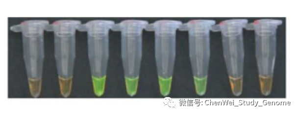 LAMP分子检测是一种类似于荧光定量PCR的技术。但是LAMP检测比定量PCR更加简便,速度更快,价格很便宜,灵敏度高,特异性也高。 ①LAMP的操作更加简便,只要有离心机和60°C恒温水浴就可以操作; ②LAMP的检测速度快,只需30分钟就可以完成检测反应; ③LAMP的检测成本很低,我查到网上售卖的LAMP检测试剂盒大约十几元人民币一个反应; ④LAMP检测的特异性和灵敏度都很高。 #01 LAMP概述 LAMP 是“Loop-mediated isothermal amplification”的首字母缩写。翻成中文,是“环介导等温扩增”的意思。 这项技术最早是由日本科学家Tsugunori Notomi在2000年首先提出。 这是一种比传统PCR更加容易操作的核酸扩增技术。它不需要热循环仪,只需要60~65 °C的恒温水浴就可以操作。 检测结果可以通过肉眼进行判断。 #02 LAMP工作原理 LAMP 实验中要用到 Bst DNA 聚合酶。它实际上天然 Bst DNA 聚合酶的大片段部分。Bst DNA 聚合酶大片段保留了天然 Bst DNA 聚合酶的一个重要的特点,就是在进行聚合反应时,它可把被复制的 DNA 双链中的那条非模板链推开。 之所以要用 Bst DNA 聚合酶的大片段,是因为这可以去掉天然 Bst DNA 聚合酶的小片段中所具有的 DNA 5’ 端外切酶和 3’ 端外切酶的酶活性。 另外,这个酶还可以在 65 °C 的较高温度条件下,在较长时间内保持酶活性。 这是 LAMP 的引物设计。 先看左侧,左侧设计有 2 个引物。先是 forward outer primer,翻译成中文就是“正向的外侧引物”。这个引物的序列是针对目标序列左边外侧的 F3C 序列的,这里 F 是 forward 的意思;3 是指第三段序列;C 是 complementary,“互补”的意思。 接下来,是 forward internal primer,翻成中文是“正向的内侧引物”。它的序列分成两段,其中 F2 段是与所针对的目标序列上的 F2C 段序列相互补的。它的另一段序列,是 F1C 序列,这段序列是与模板上的 F1C 序列是一样的。注意:它是与模板上的 F1C 序列一样,而不是与 F1C 序列互补。 再看右侧的 2 个引物。其实,右侧的两个引物与左侧的两个引物的设计是相似的,只不过方向倒过来。并且引物和引物所针对的目标模板序列的标识,都改成了“B”开头的,也就是 Backward,翻成中文是“反向”意思。 我在网上找到了一段说明 LAMP 实验原理的动画,这个动画很好地展示了LAMP的复制过程。 接下来,我们对这个动画进行逐段的解释。 先有一段要被扩增的目标 DNA,目标 DNA 的一端可以被分成三段,分别是:F1、F2、F3。而对应的互补链上的序列则是 F1C、F2C 和 F3C 。 设计好的“正向内侧引物”,结合到目标 DNA 的 F2C 这一段上。 然后,在 DNA 聚合酶的作用下,引物上发生延伸反应。延伸反应一直进行到目标序列的另一端。 接下来,回头来看合成反应起始的位置,“正向内侧引物”的尾巴是翘起来的。 留下的模板 DNA 链上 F3C 这一段序列的单链,于是正向外侧引物结合到模板单链上,同样在 DNA 聚合酶的作用下,正向外侧引物发生延伸反应。 在合成链的同时,之前被合成出来的第一条链,此时被聚合酶从模板链上推开。 我们来看这条被推开的链,一方面,它的一端内部就有互补回文序列,互补序列折叠起来,形成一个小环。 另一端,“反向内侧引物”结合到这条链上,并在聚合酶的作用下,发生延伸反应产生出第 3 条链。 同时延伸反应可以把之前折叠形成的小环推开。 然后,反向外侧引物结合到这条链上,也同时进行延伸反应,并把第 3 条链推开。 现在,我们来看这第 3 条链。它有一个显著的特点,就是它的两端都有互补回文序列。当它处于单链状态的时候,两端的互补回文序列都自然地折叠起来,在两端各形成一个小环。 这时候,F1 这一段序列是有一个游离的 3’ 尾巴的,它又结合到 F1C 序列上。这个 F1 序列就可以作为聚合酶的合成引物起作用。 同时左侧的 F2C 这一段,是可以被“正向内侧引物”所结合的,于是,链内部的 F1 序列,和结合上来的“正向内侧引物”,都在聚合酶的作用下,发生延伸反应。 注意:虽然发生了延伸反应,但这还是第 3 条链。 F1这段序列所延伸出来的这条链,被“正向内侧引物”所引导的合成反应所推开,形成单链。 有回纹序列的单链折叠回来,形成一个新的可延伸的末端,开始延伸反应。 我们回过来看第 3 条链。这个被延伸的第条 3 链,在此时有了 4 段中心模板序列,也就是 2 段粉色的序列和 2 段红色的序列,中间则有一个单链的鼓泡。 这个鼓泡会被反向的内侧引物结合上,并进行延伸反应。延伸反应会把下半条链推开,让下半条链形成单链。 这个单链末端的回文序列又引发新一轮的延伸。 延伸的结果是,一方面原来粘在上面的第 5 条链被推开,形成一条独立的单链。 另一方面,第 3 条链的长度进一步加倍,形成一条含有 8 段原始序列(4 段粉色,4 段红色)的长链。 这就是 LAMP 的复制过程。 一方面,在链的数量上进行扩增;另一方面,是链的长度上进行扩增。 总之,会形成一轮又一轮的指数扩增。 左图,就是经过指数扩增后,会形成的各种长度的扩增产物的示意图。 右图中,4号泳道,就是LAMP扩增产物的电泳结果。可以明显地看到,反应产物中有类似梯子状的扩增产物,也就是反应产生目标序列整数倍长度的扩增产物。 #03 LAMP结果检测 首先,LAMP 反应中,在 dNTP 被聚合酶合成进 DNA 链的同时,会有大量的焦磷酸被释放出来。 而高浓度的焦磷酸会和反应体系中的镁离子结合,形成沉淀。这种沉淀可以被浊度计检测出