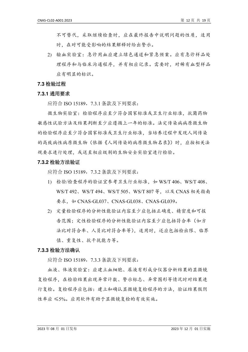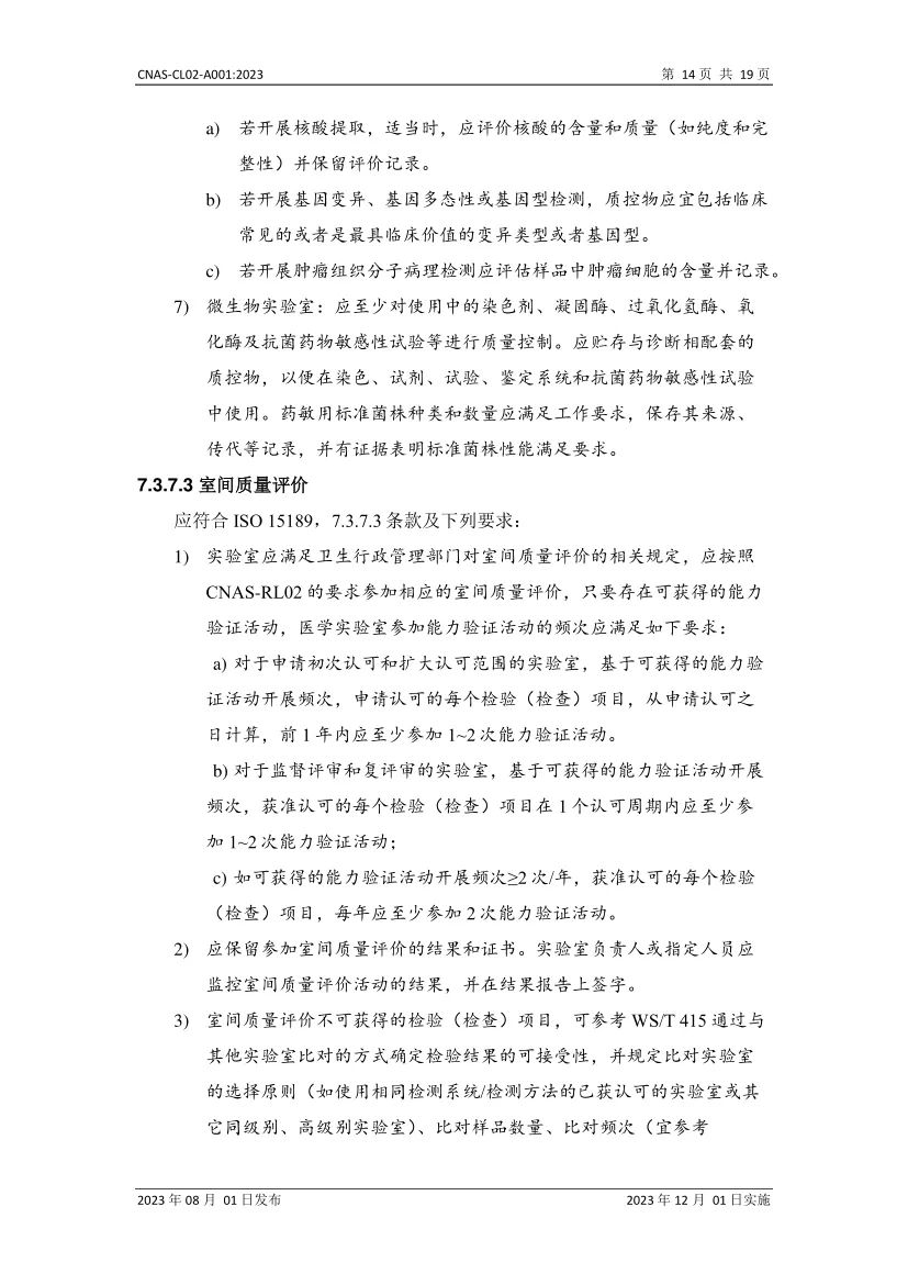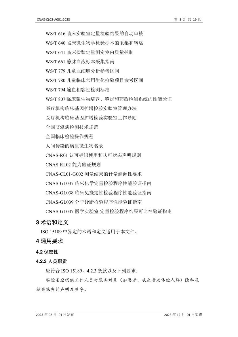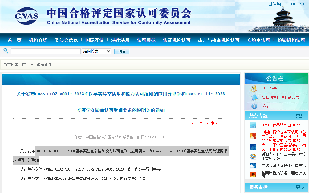 8月1日,中国合格评定国家认可委员会(CNAS)发布通知,CNAS-CL02-A001:2023《医学实验室质量和能力认可准则的应用要求》和CNAS-EL-14:2023《医学实验室认可受理要求的说明》已完成修订工作,于2023年8月1日发布,2023年12月1日实施。
