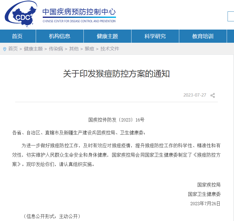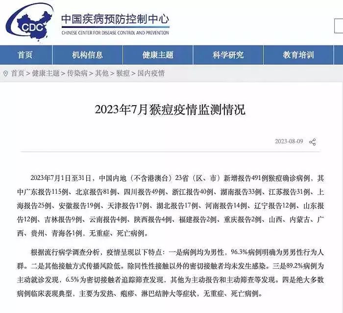 中疾控网站9日发布《2023年7月猴痘疫情监测情况》,全文如下: 2023年7月1日至31日,中国内地(不含港澳台)23省(区、市)新增报告491例猴痘确诊病例,其中广东报告115例、北京报告81例、四川报告49例、浙江报告40例、湖南报告33例、江苏报告31例、上海报告25例、安徽报告19例、天津报告17例、湖北报告17例、河南报告14例、辽宁报告12例、山东报告12例、吉林报告9例、云南报告4例、陕西报告4例、福建报告2例、重庆报告2例、山西、内蒙古、广西、贵州、青海各1例,无重症、死亡病例。 根据流行病学调查分析,疫情呈现以下特点:一是病例均为男性,96.3%病例明确为男男性行为人群。二是其他接触方式传播风险低。除同性性接触以外的密切接触者均未发生感染。三是89.2%病例为主动就诊发现,6.5%为密切接触者追踪筛查发现,其他为主动报告和主动筛查等发现。四是绝大多数病例临床表现典型,主要为发热、疱疹、淋巴结肿大等症状,无重症、死亡病例。 2022年9月中国疾控中心披露了中国内地首例输入性猴痘病例,今年年6月我国报告了106例猴痘确诊病例,就7月猴痘病例大幅增加的原因,有关专家解读:一是猴痘疫情在男男性行为人群中隐匿性传播,80%病例为单个病例,感染来源不清,防控难度大;二是随着宣传教育,重点人群主动就诊病例增多,除了密接筛查发现外,通过重点人群主动报告、重点人群筛查等也增加了病例发现;三是境外疫情不断输入境内,输入风险仍持续存在。 国家疾控局发布《猴痘防控方案》 此前,7月26日晚,国家疾控局、国家卫生健康委发布《关于印发猴痘防控方案的通知》,要求各级各类医疗机构开展猴痘样症状监测,根据病例的不同情况分类实施医疗机构隔离治疗或居家隔离治疗,对病情较轻且具备居家隔离治疗条件的确诊病例,经医疗机构与疾控机构联合评估后,可直接采取居家隔离治疗;对猴痘密切接触者实施21天自我健康监测。 《通知》附件包括《猴痘病毒实验室检测技术指南》,原文如下: |